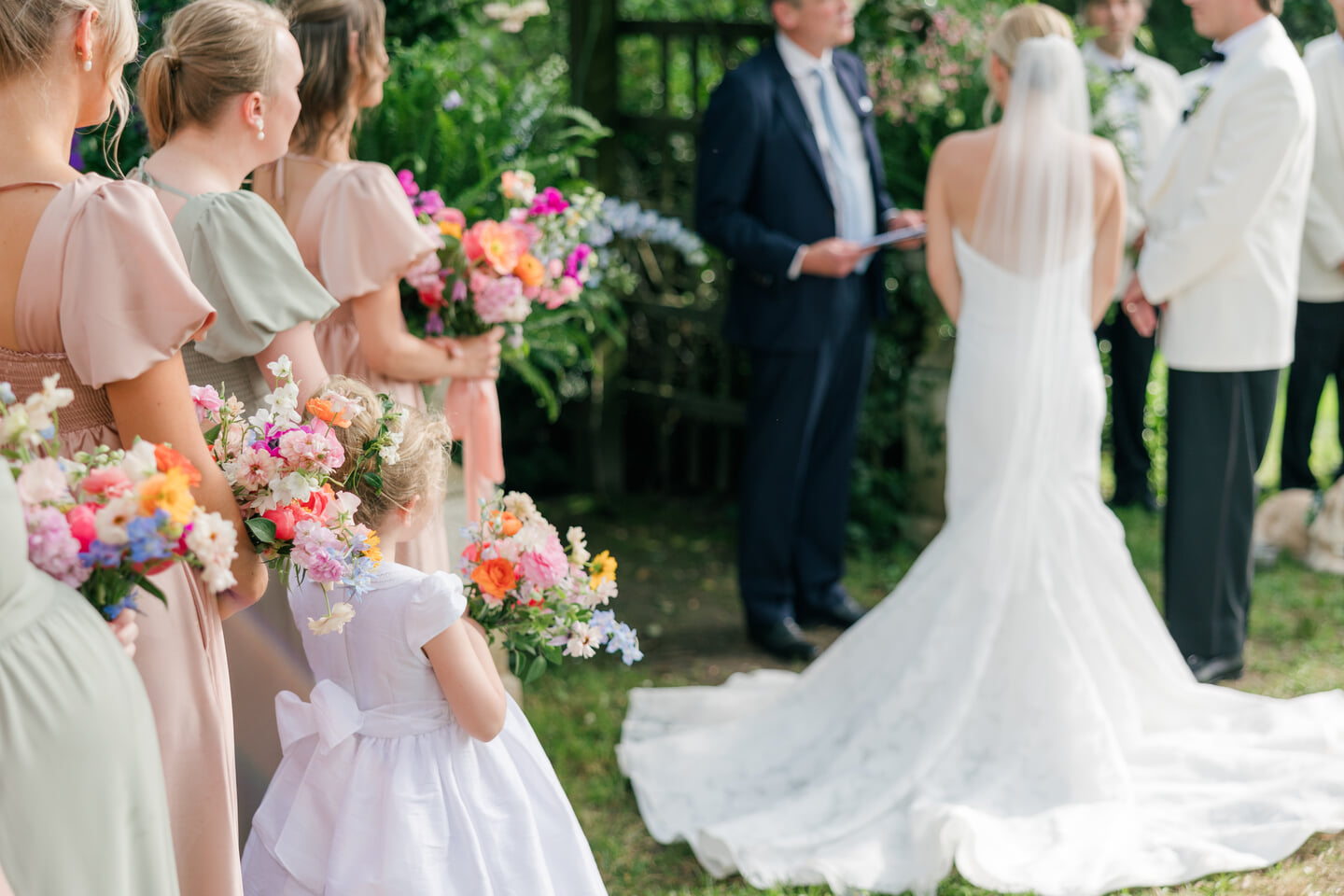 The ceremony unfolded beneath a floral arch designed by Monarch Flower Farm, woven with climbing roses and greenery, framed by bentwood chairs in soft terracotta tones. Crepe myrtle trees formed a natural canopy as classical melodies from Ibis Music Group floated through the air, lending an elegant rhythm to the moment.