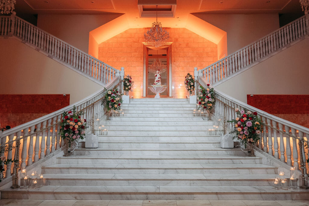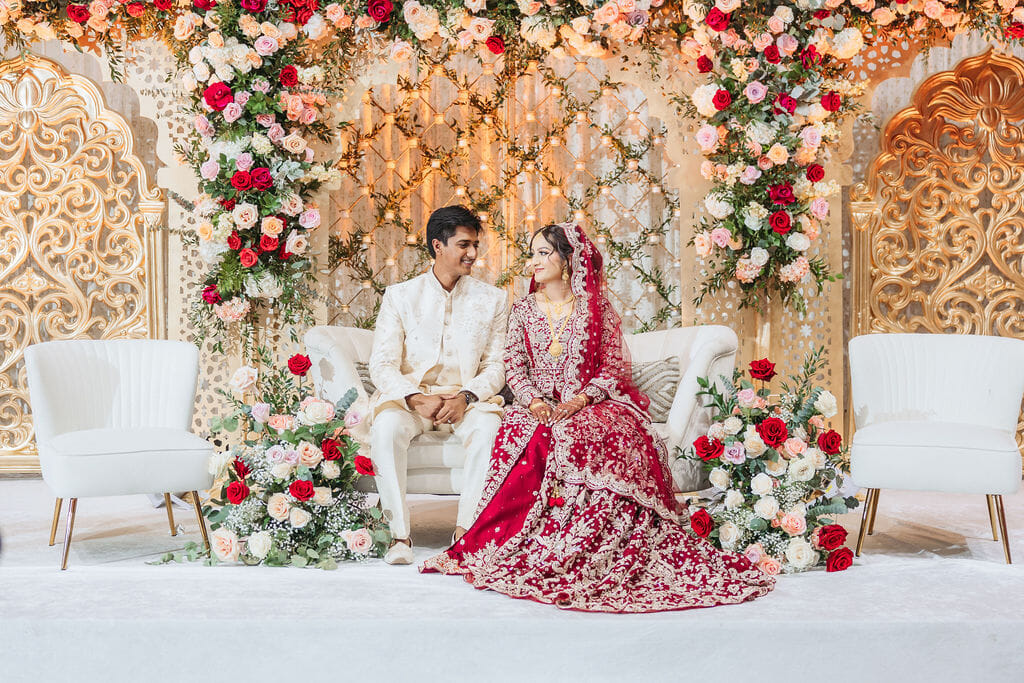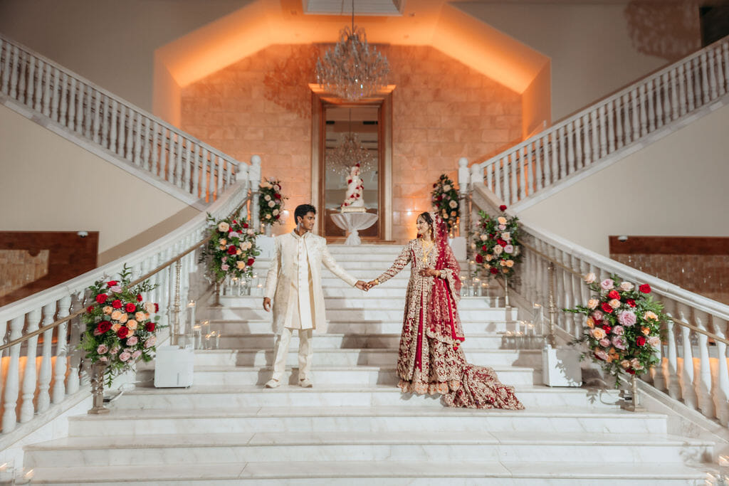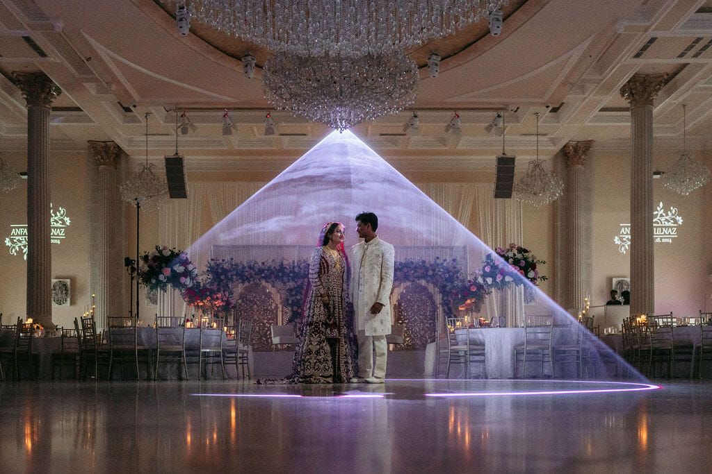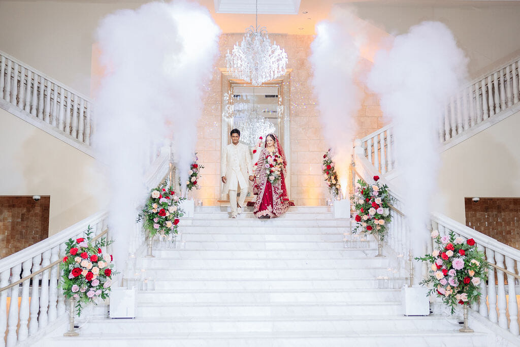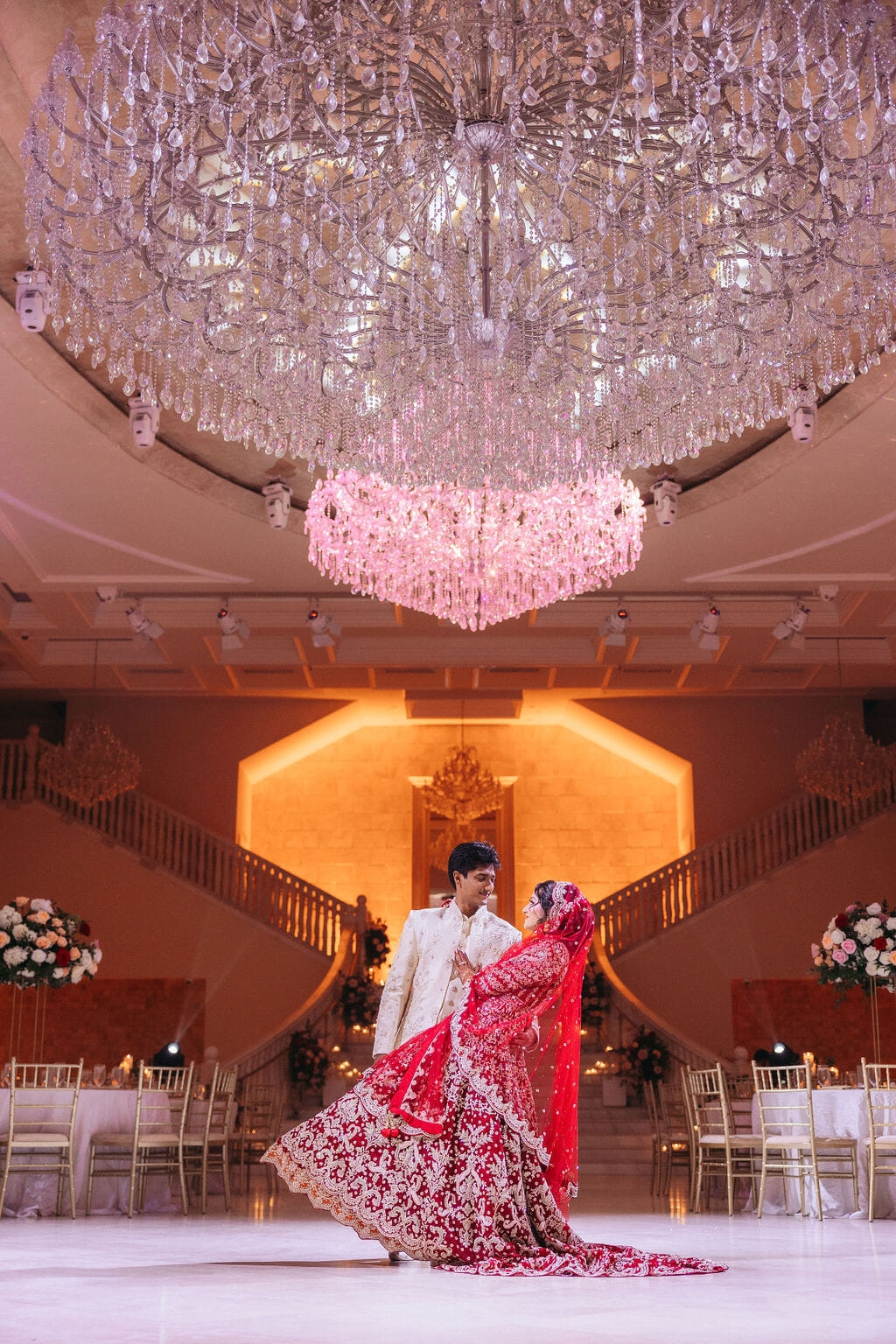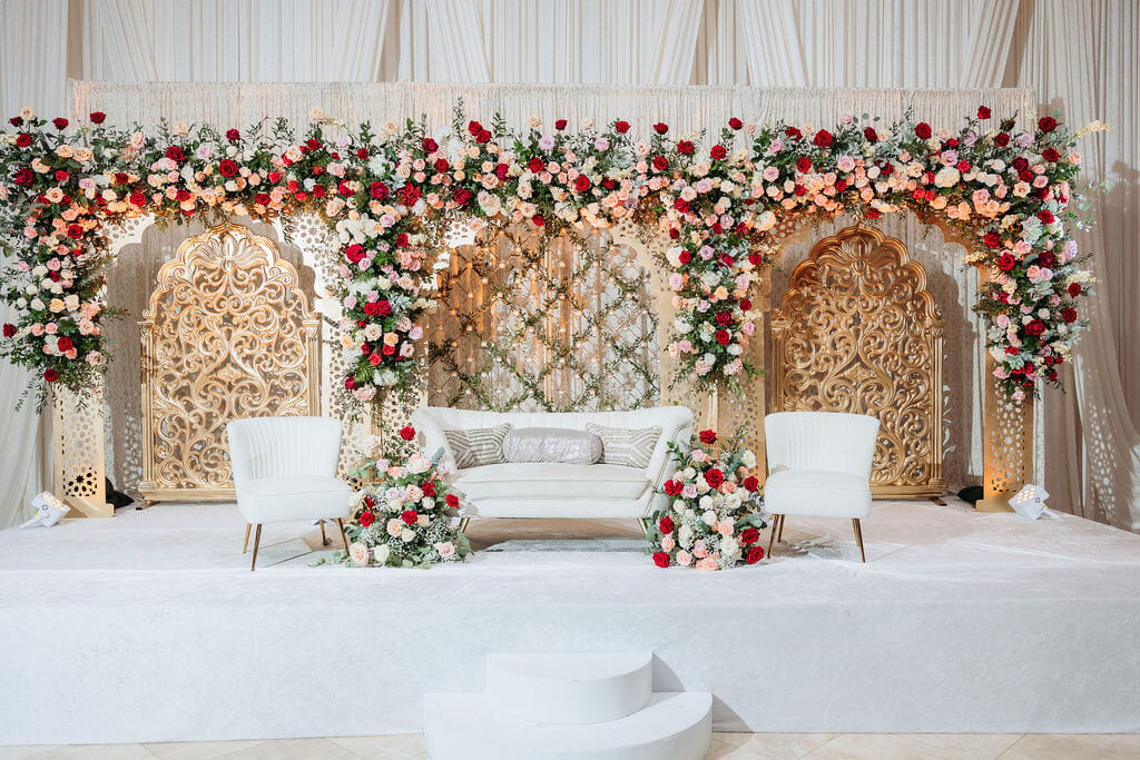 Planned with intention and care by Awaaz Events, the ballroom transformed into an immersive landscape of florals and light. New Era Events brought the vision to life through lush installations of red and blush roses layered with verdant greenery, cascading across golden filigree backdrops, sweeping staircases, and refined tablescapes. Crystal chandeliers and soft purple uplighting added warmth and intimacy, balancing grandeur with romance.