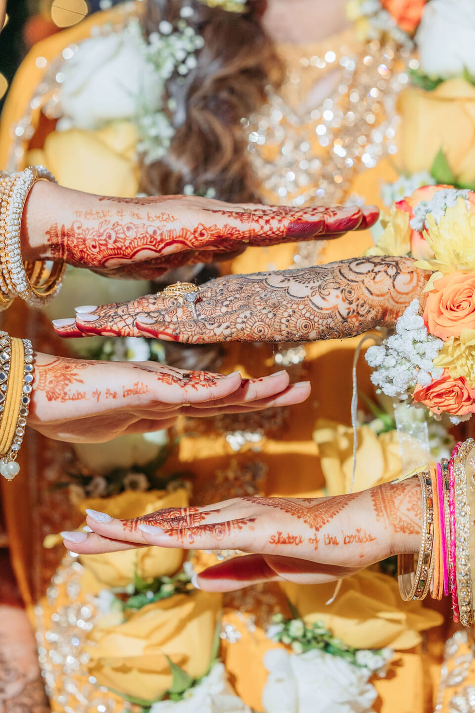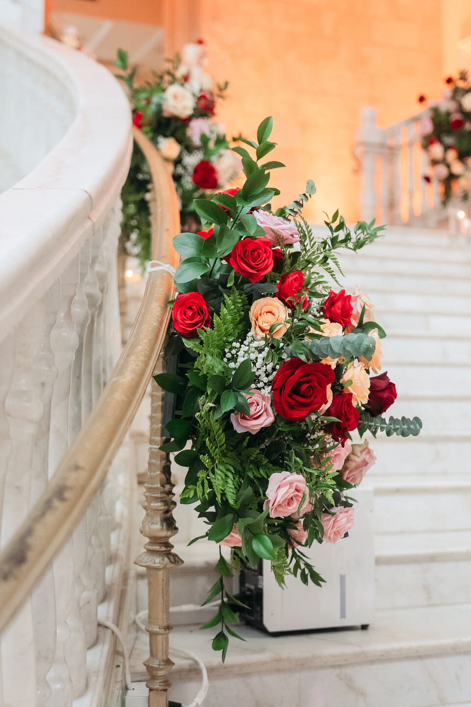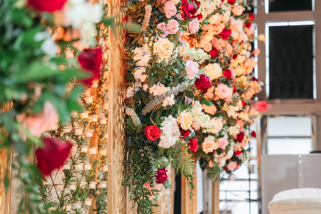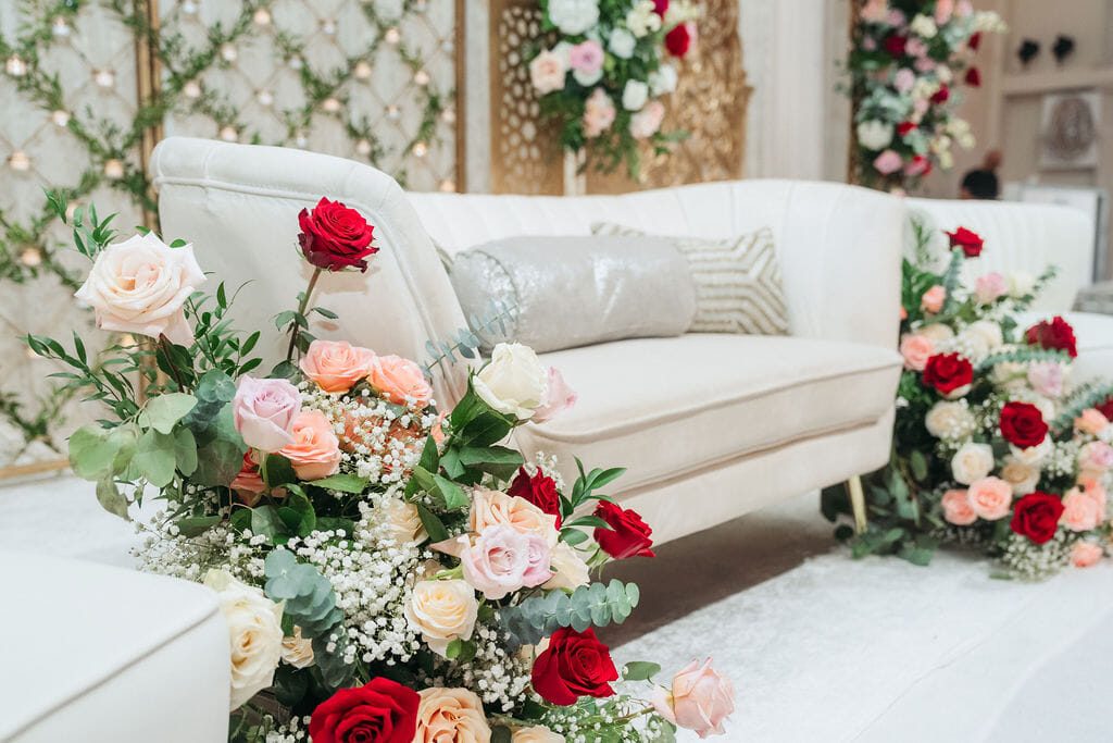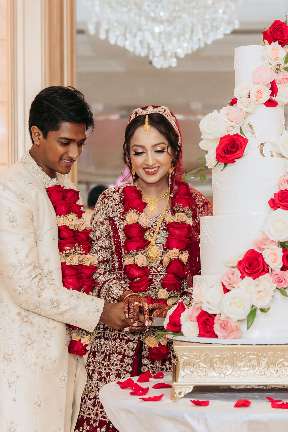 Planned with intention and care by Awaaz Events, the ballroom transformed into an immersive landscape of florals and light. New Era Events brought the vision to life through lush installations of red and blush roses layered with verdant greenery, cascading across golden filigree backdrops, sweeping staircases, and refined tablescapes. Crystal chandeliers and soft purple uplighting added warmth and intimacy, balancing grandeur with romance.