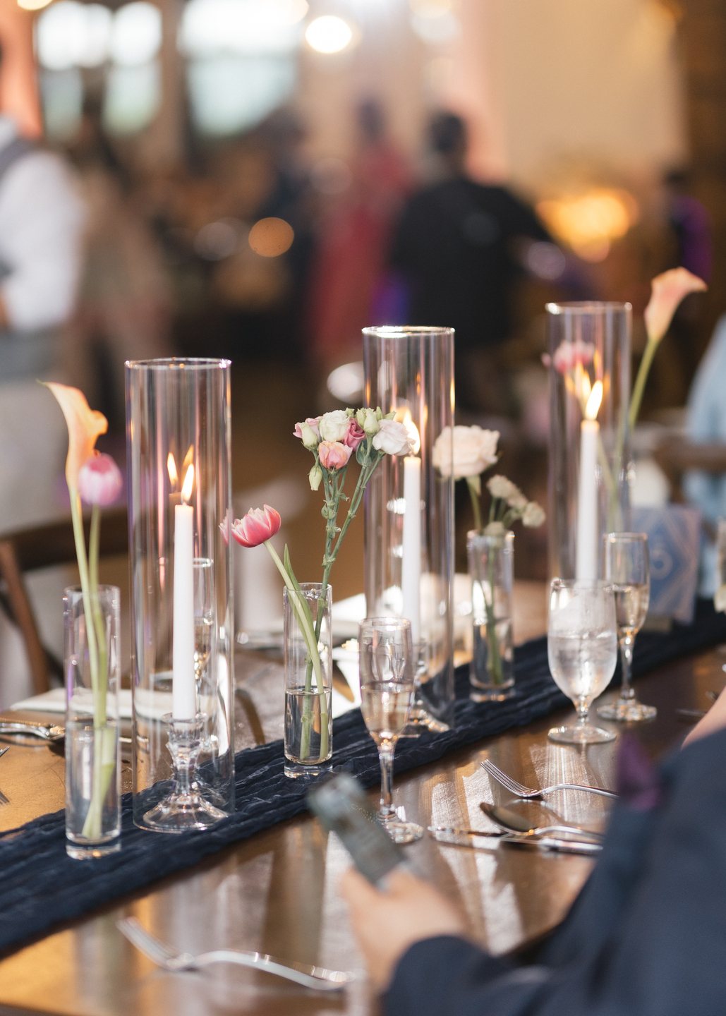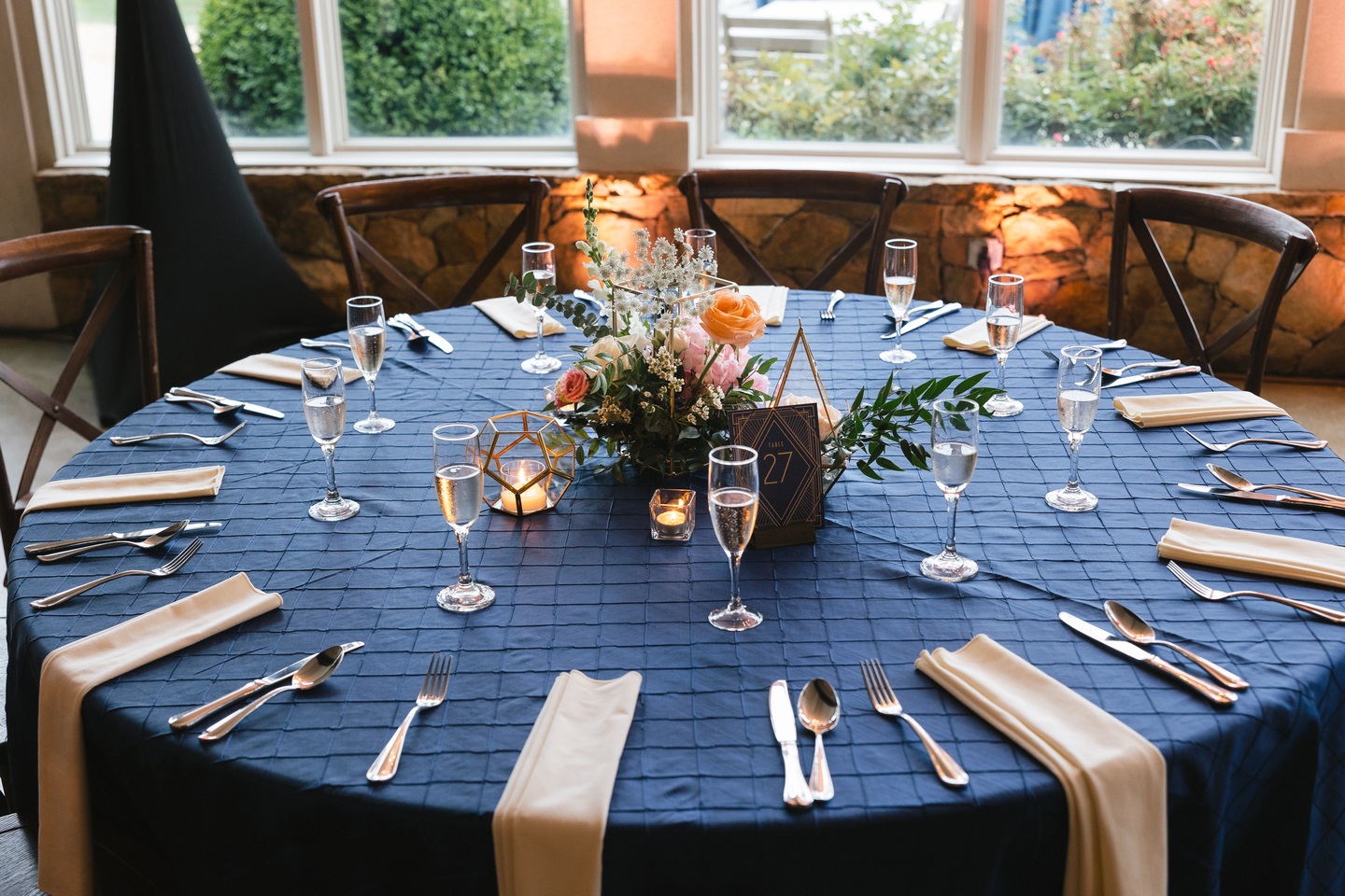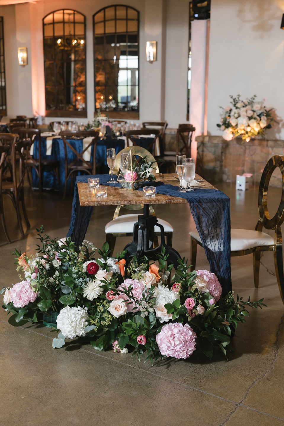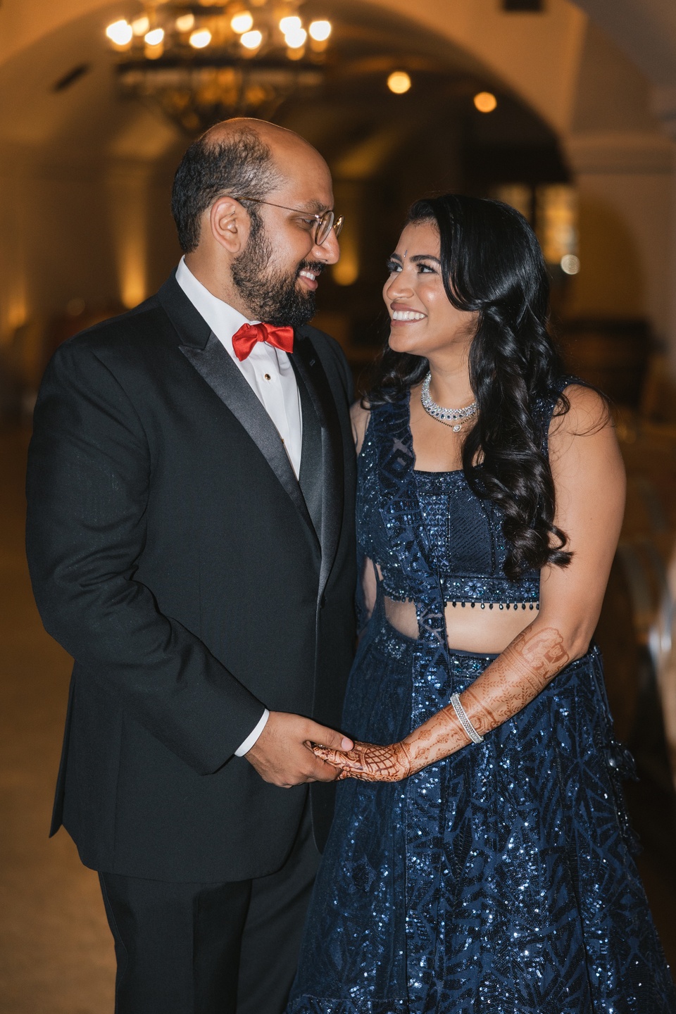 An iconic DeLorean awaited them after the ceremony, its gull-wing doors lifting dramatically as they made their grand exit. The reception sparkled with deep blue and gold tones, elegant florals, and soft candlelight. Guests enjoyed an exquisite feast by Bollywood Bistro and a showstopping cake from Classic Bakery, a two-tier masterpiece featuring hand-painted gold details and blush florals.