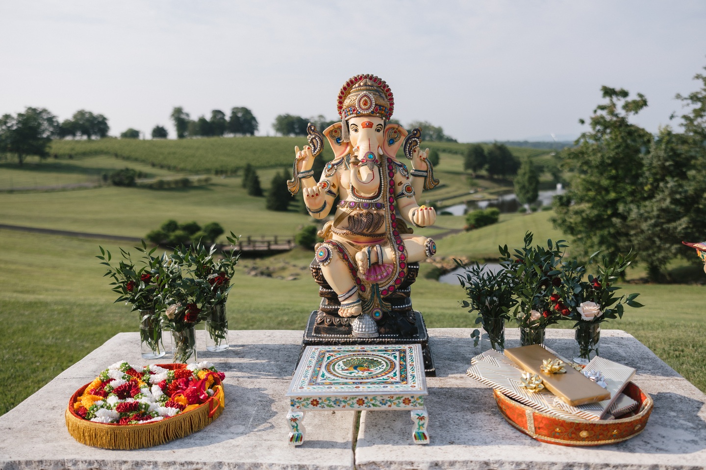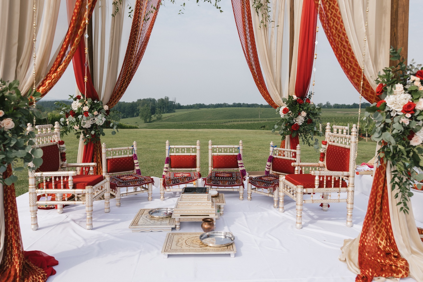 Under the expert coordination of Ace of Events, the couple exchanged vows in a vibrant outdoor ceremony framed by sweeping vineyard views. Red and white floral garlands by Event Envy symbolized passion and purity, their blooms mirrored in lush arrangements that adorned the mandap. Adding a personal touch, the couple’s beloved dog trotted down the aisle in a teal outfit that perfectly matched the wedding’s joyful palette.