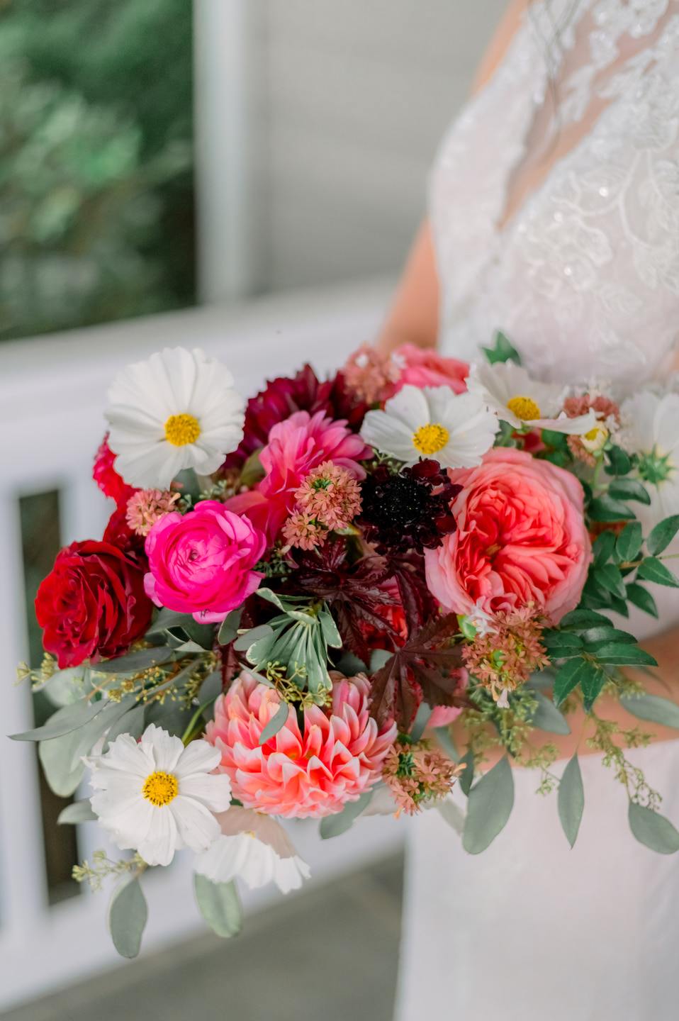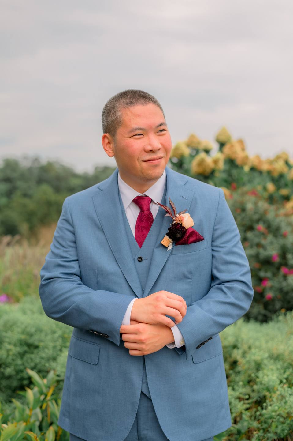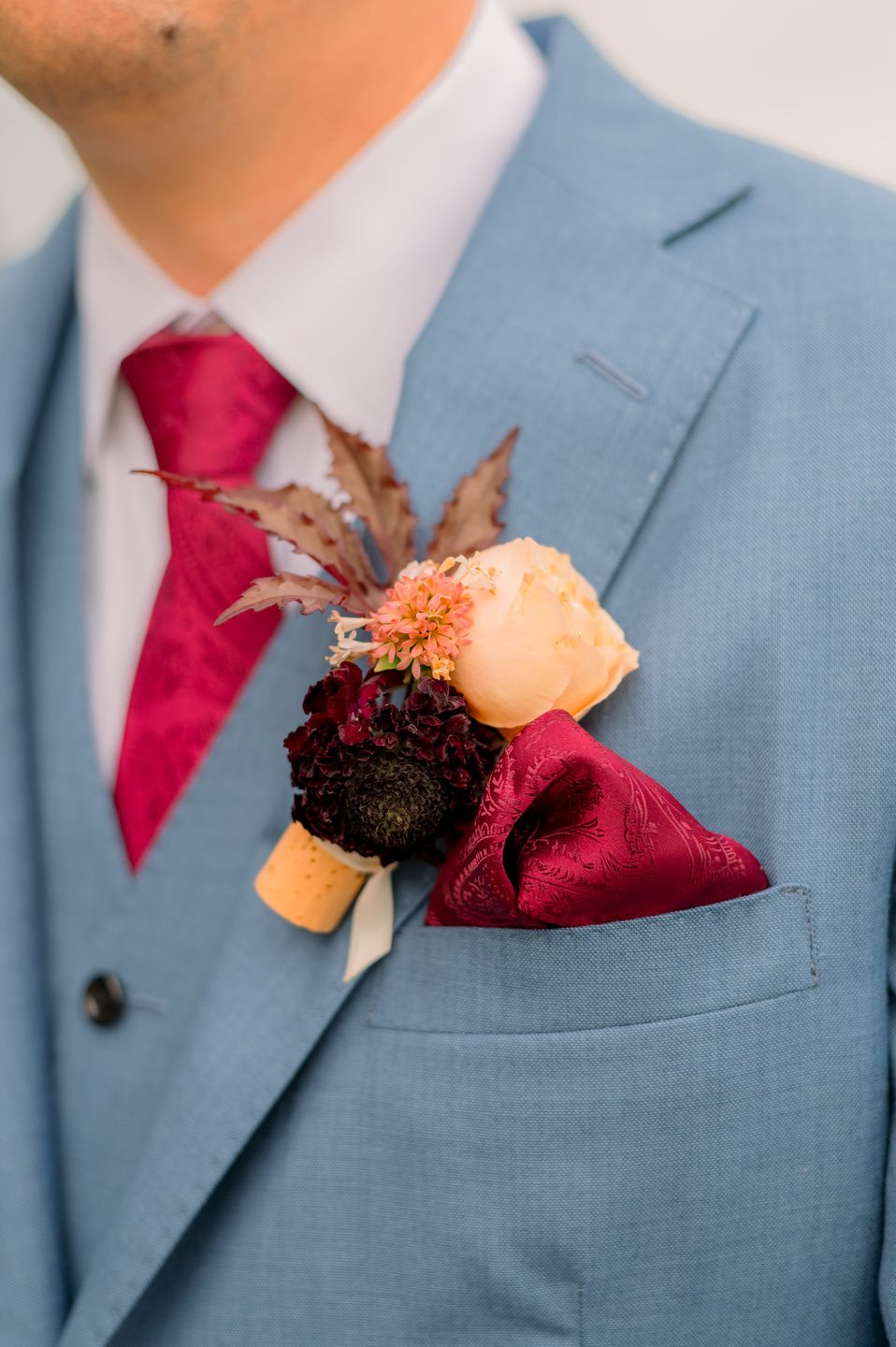 Anthony wore a slate blue suit accented with a burgundy tie and boutonnière of peach and crimson blooms, while Dianne carried a radiant bouquet of dahlias, garden roses, and wildflowers in pink, red, and soft peach—a perfect reflection of the day’s vibrant palette.