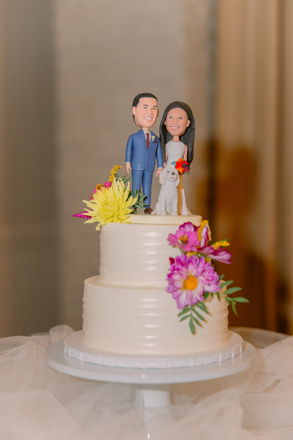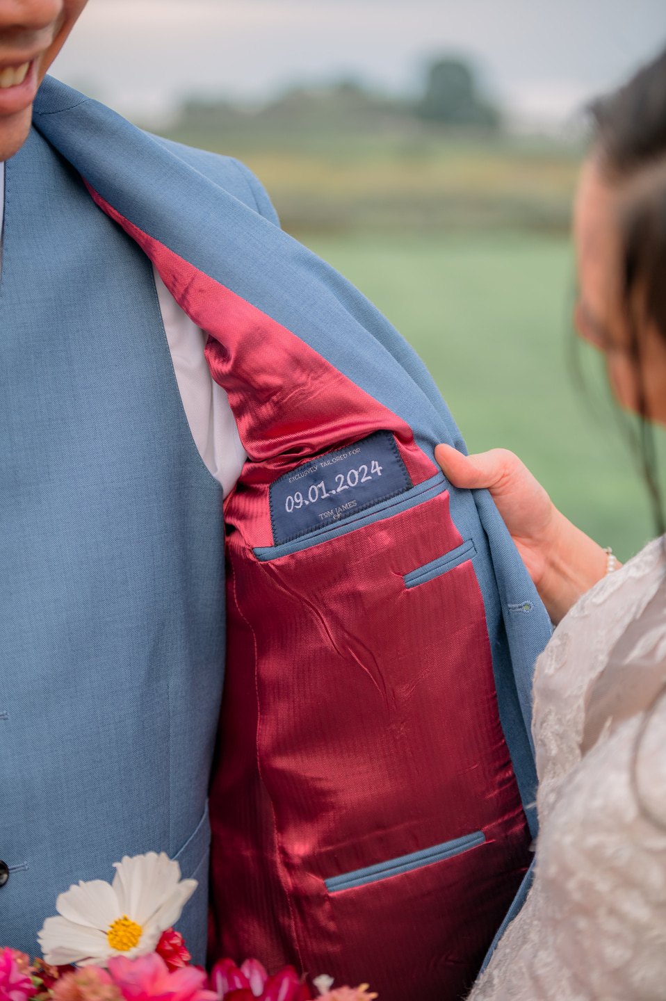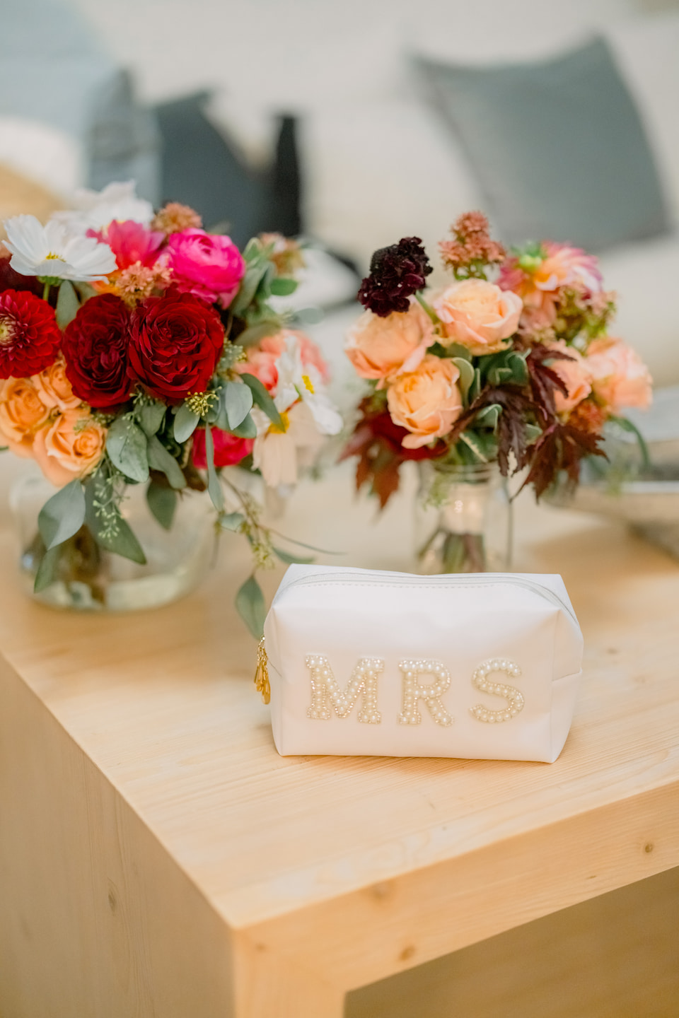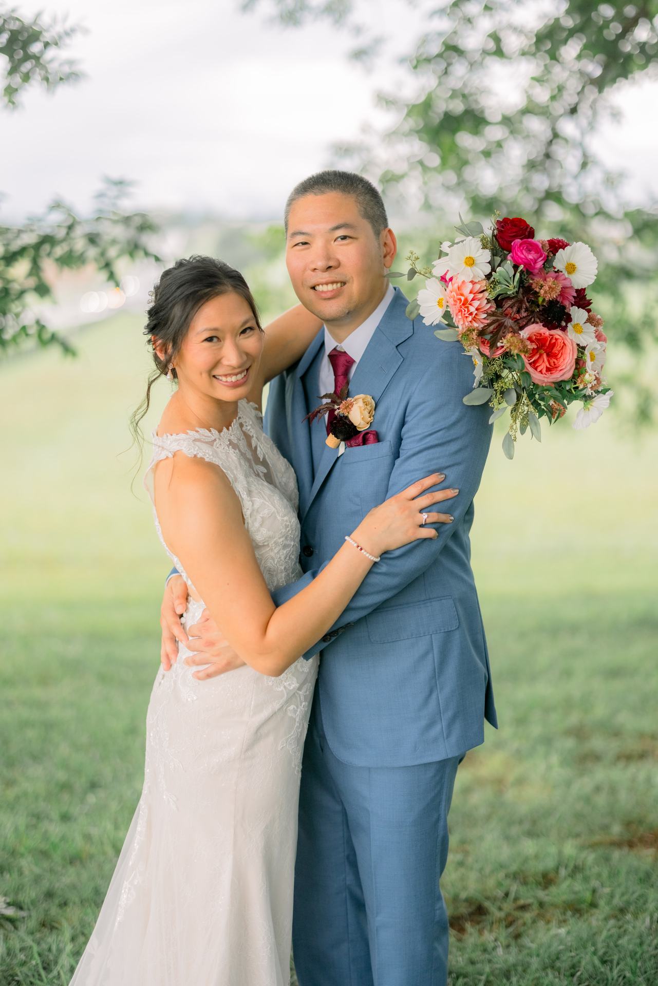 Anthony wore a slate blue suit accented with a burgundy tie and boutonnière of peach and crimson blooms, while Dianne carried a radiant bouquet of dahlias, garden roses, and wildflowers in pink, red, and soft peach—a perfect reflection of the day’s vibrant palette.