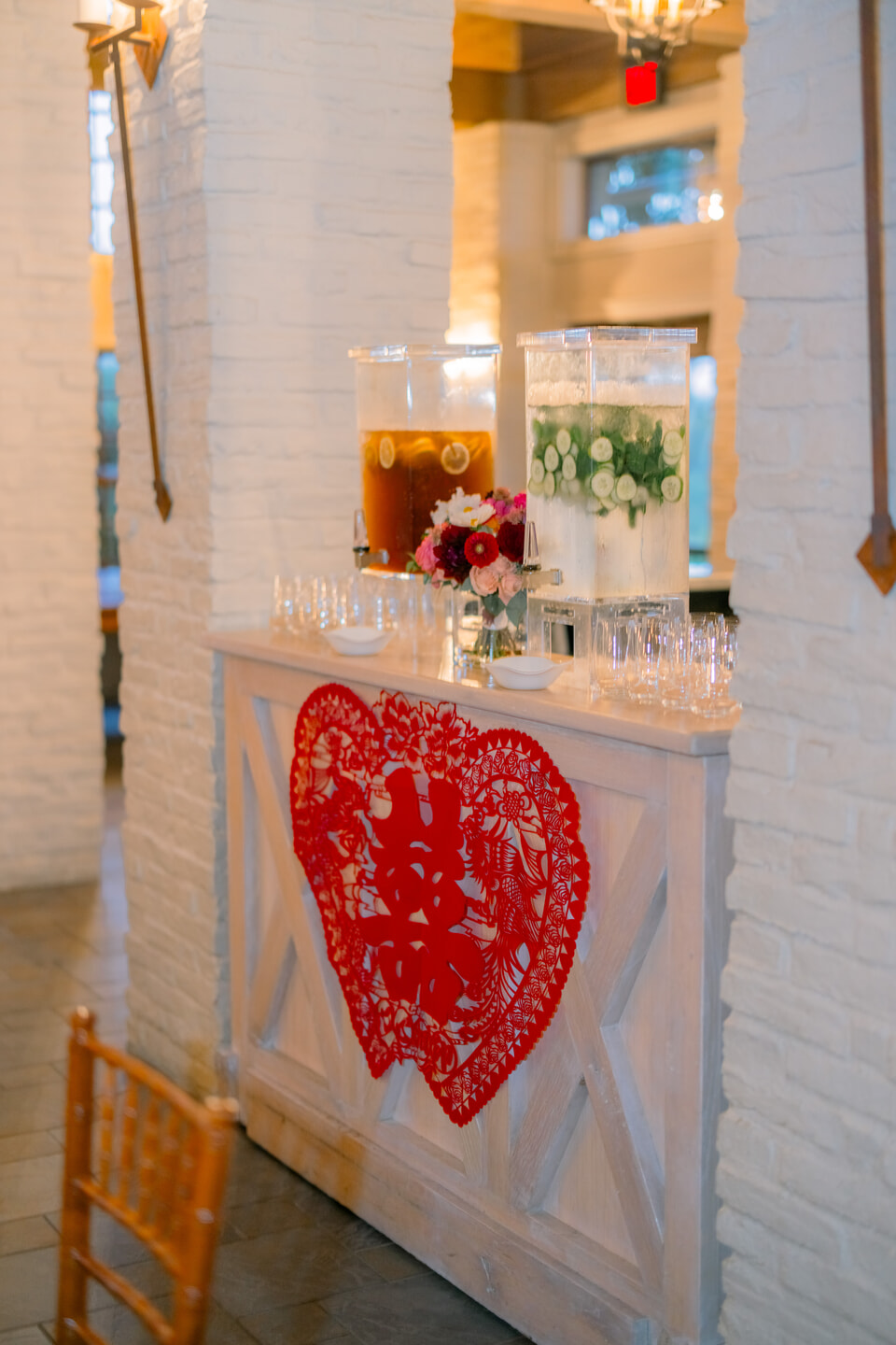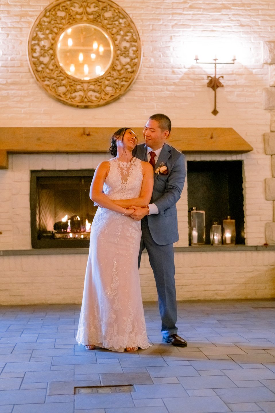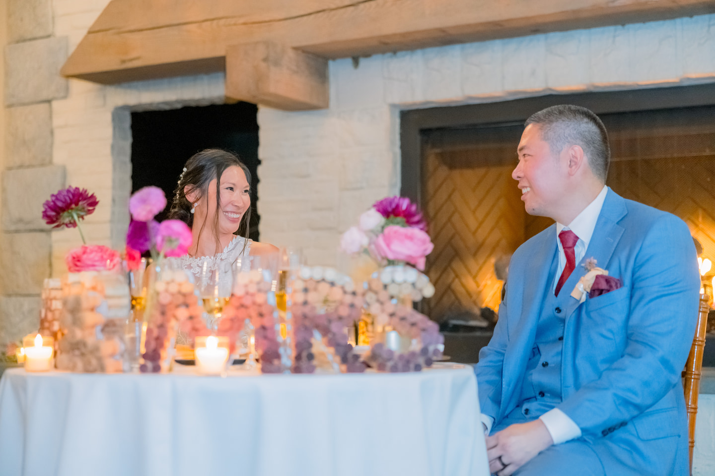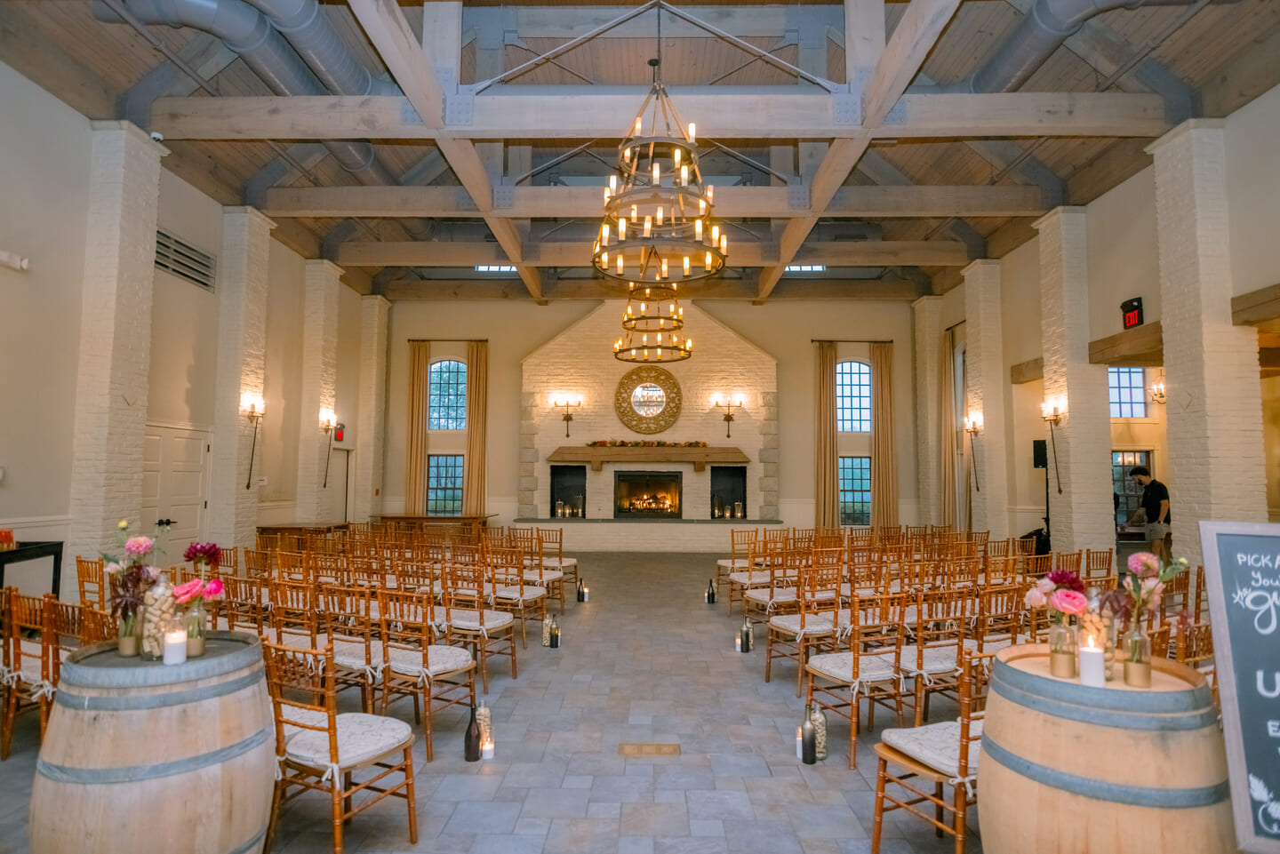 Their ceremony in the Event Hall featured white brick walls, a glowing fireplace, and wine-barrel florals that echoed the vineyard setting. At the reception, candlelight flickered over tables adorned with lush arrangements in magenta and coral as guests savored an exquisite dinner crafted by Early Mountain’s culinary team.