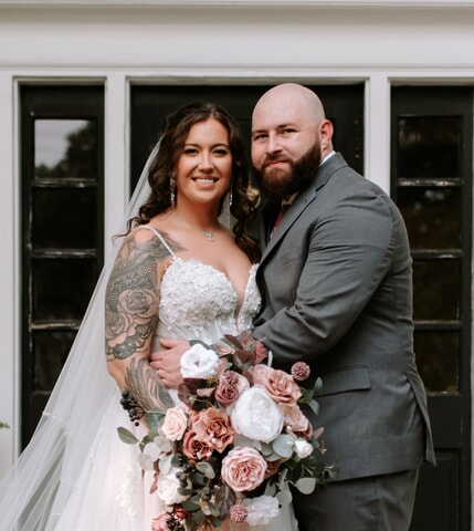 The design embraced a romantic palette of blush, dusty rose, burgundy, and sage green. Cascading floral arrangements of roses and greenery adorned the pergola, ceremony benches, and reception spaces, bringing a natural elegance to every setting. Katherine walked the brick pathway to vows beneath the floral-draped pergola, with her bridesmaids in blush tones adding warmth and sophistication to the scene.