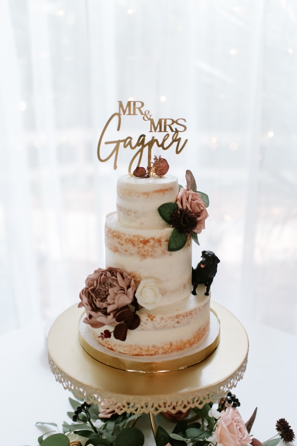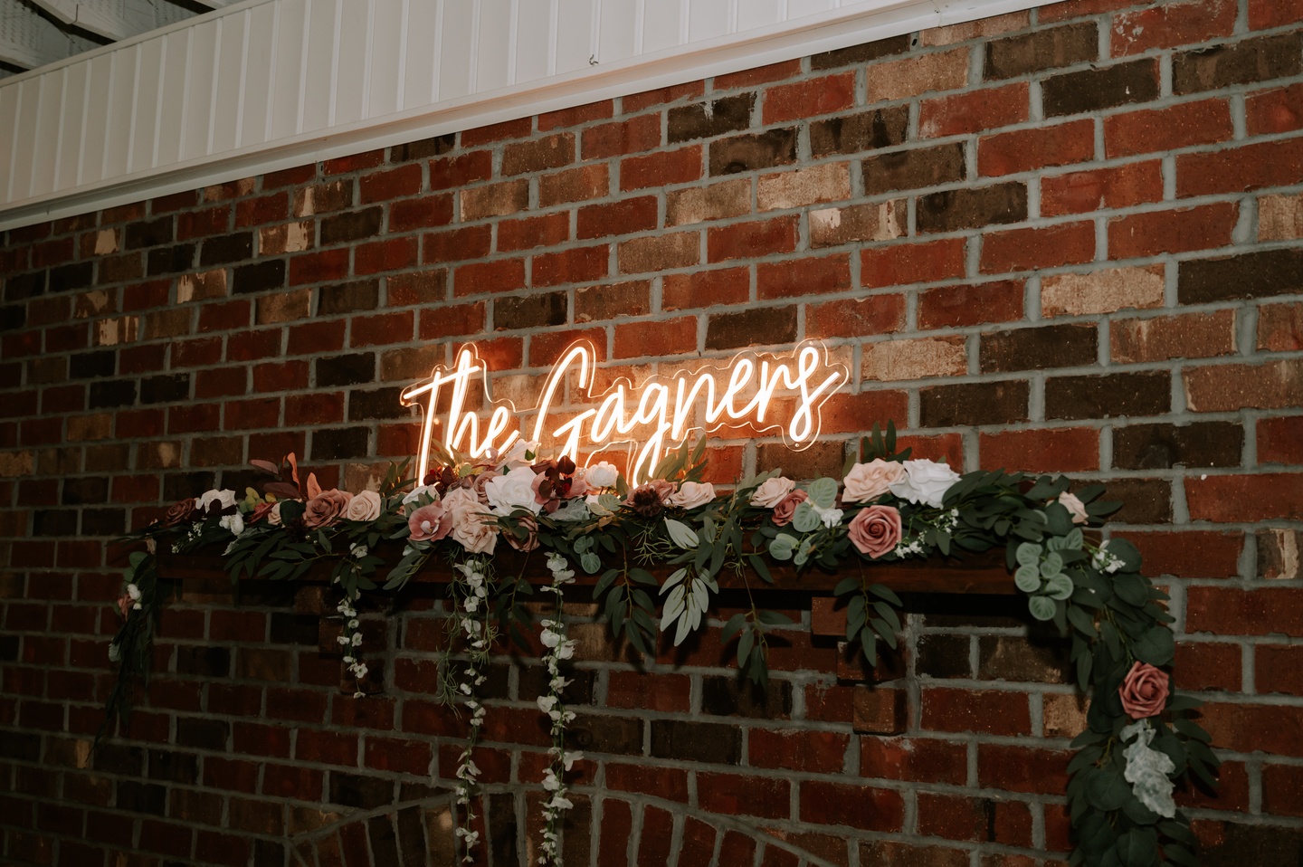 The reception carried the same rustic charm. A custom neon sign reading “The Gagners” glowed against exposed brick, vintage wooden barrels framed the sweetheart table draped in floral garlands, and string lights cast a soft, magical glow. Guests enjoyed a beautifully curated charcuterie spread featuring cheeses, strawberries, and gourmet bites, while a naked-style cake adorned with roses and greenery added a sweet finishing touch.