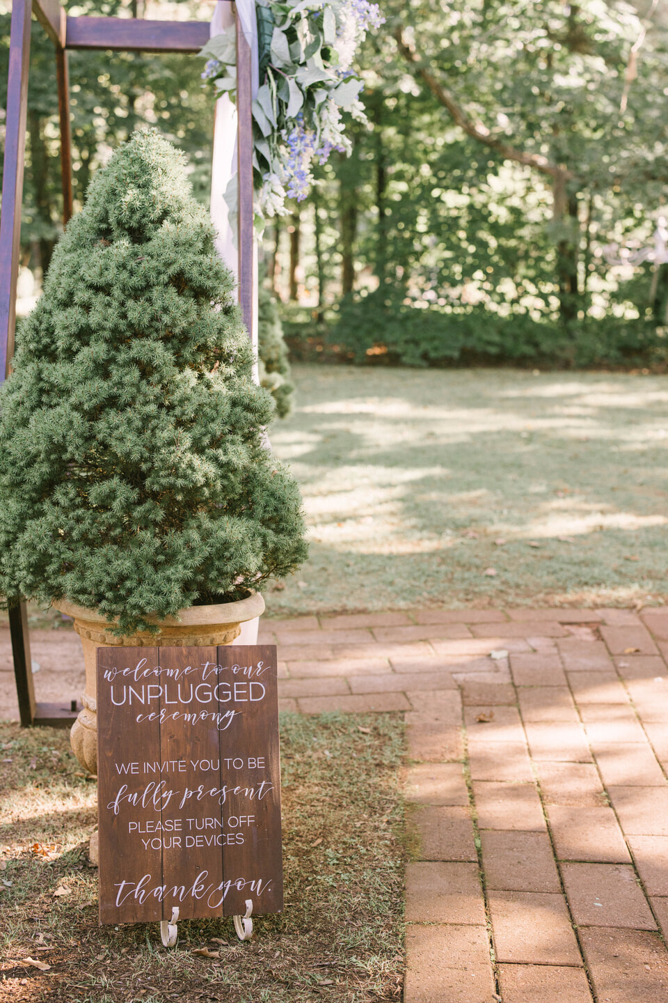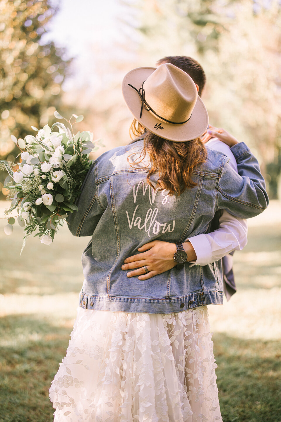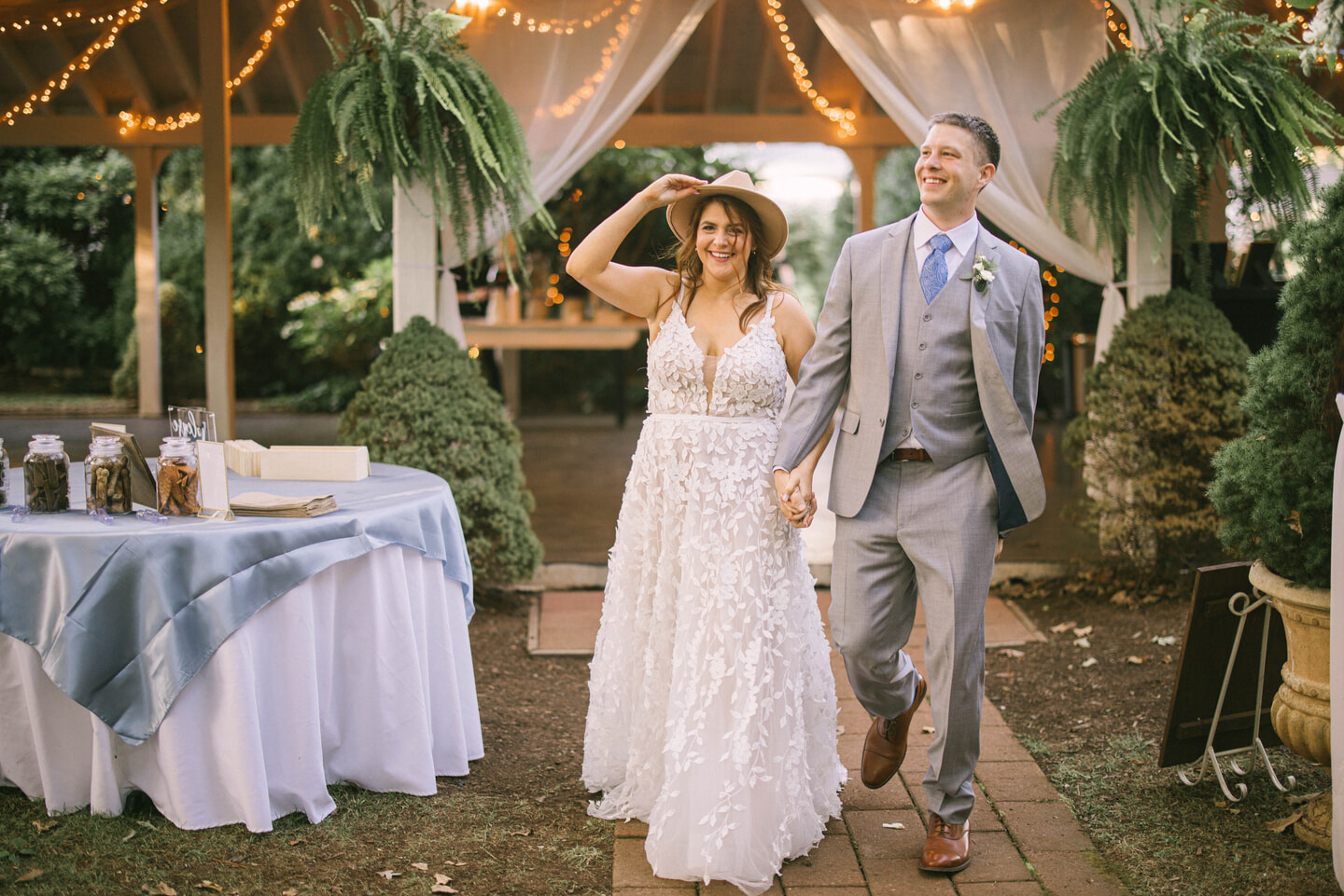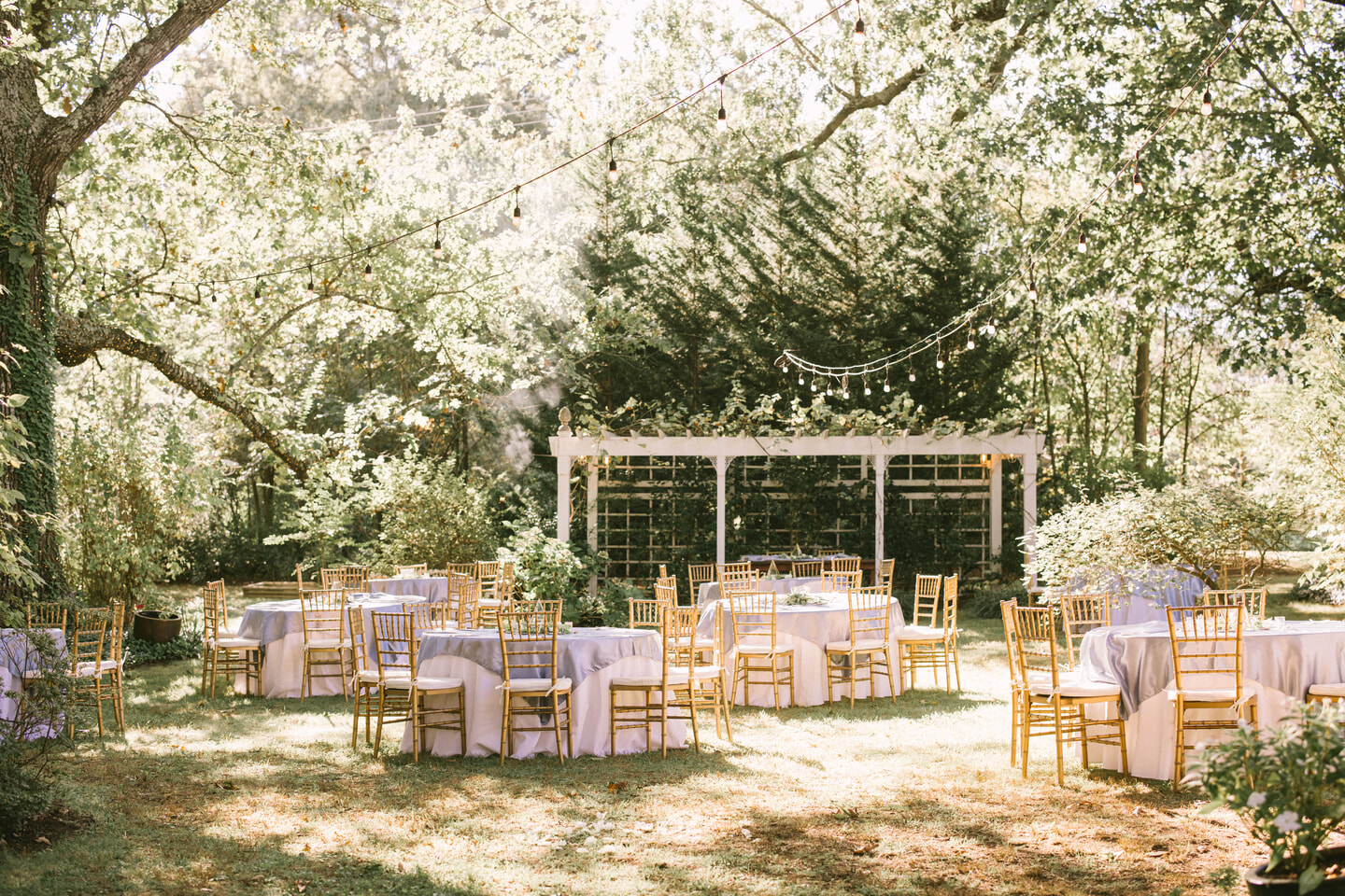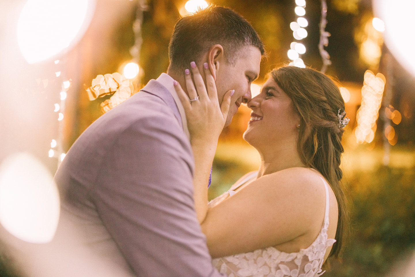 Their backyard ceremony unfolded beneath a rustic wooden arbor wrapped in trailing vines, as the couple exchanged vows on weathered stone under the golden hush of sunset. The reception glimmered beneath strings of bistro lights suspended between trees, where gold Chiavari chairs surrounded tables dressed in lavender and ivory. Guests dined on a heartfelt feast prepared by Glencliff Manor, the air alive with laughter, music, and the scent of late-summer blooms.