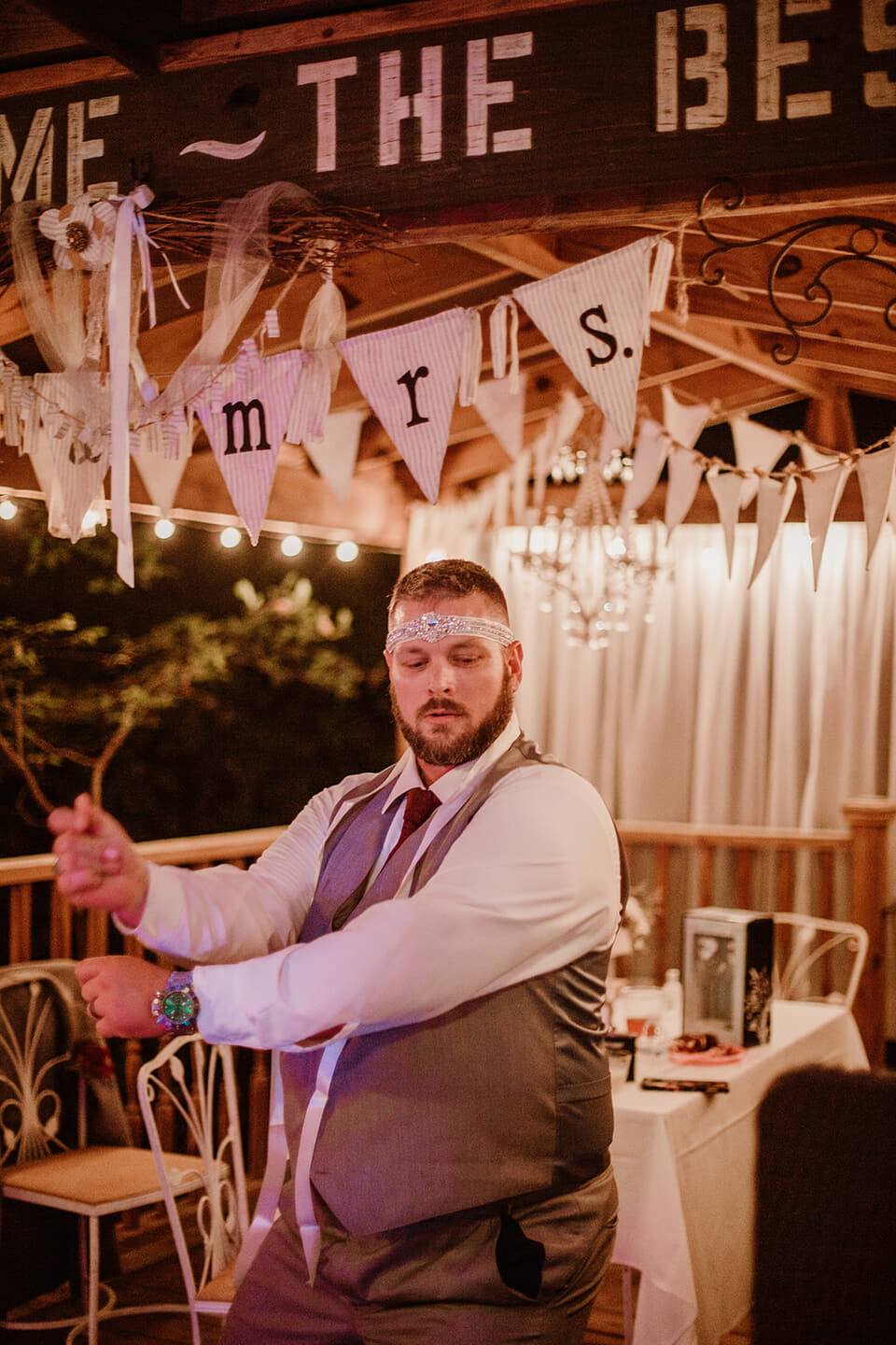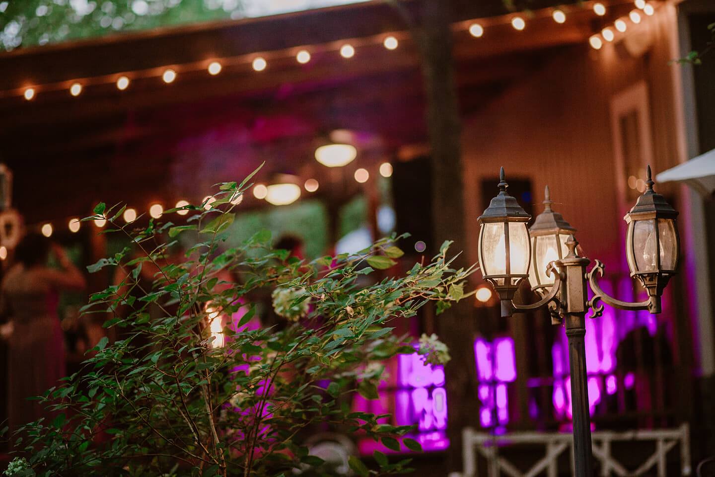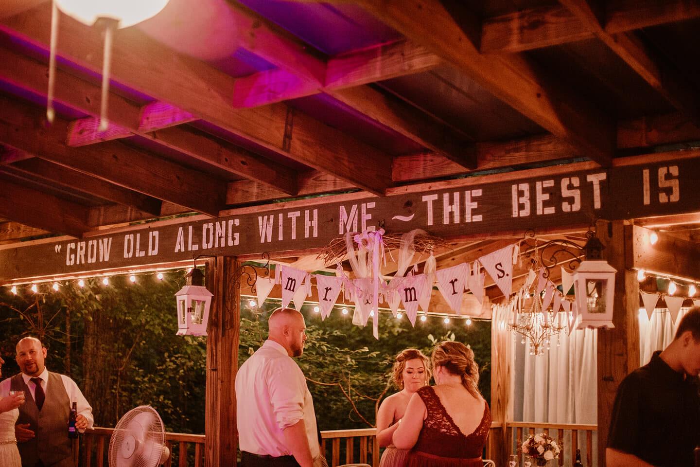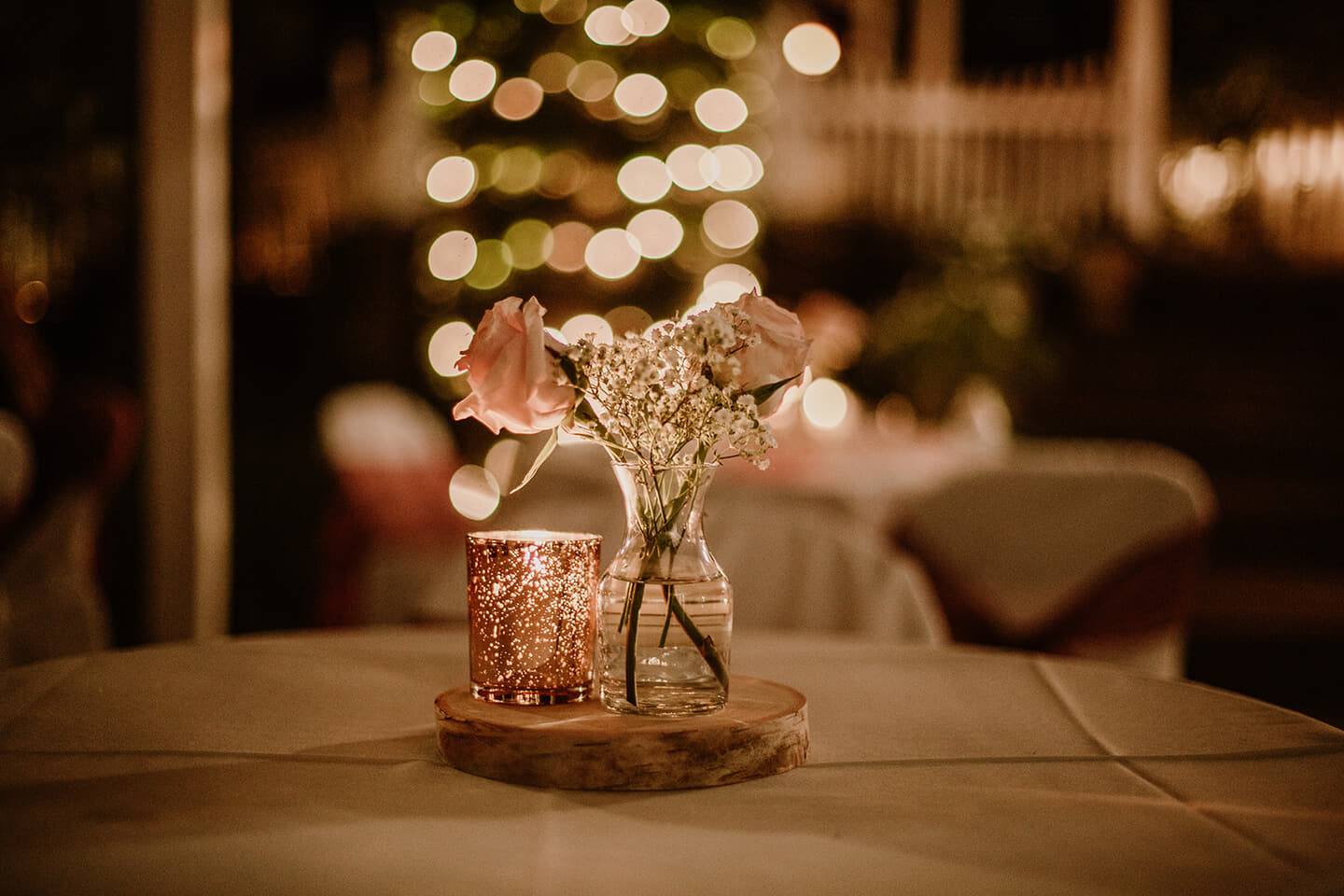 Their design embraced deep burgundy, soft blush, and classic white, bringing warmth to the season. Bouquets of roses, red carnations, and gentle greenery complemented a ceremony framed by twisted branches, cascading florals, and a crystal chandelier suspended from the pergola. As evening fell, string lights and vintage lanterns cast a cozy glow, drawing guests into a lively celebration on the dance floor.