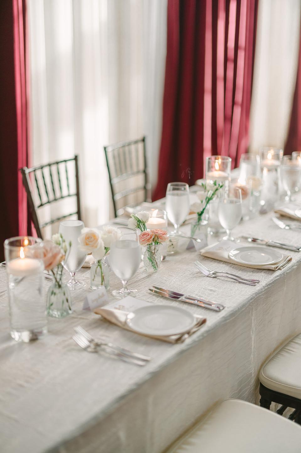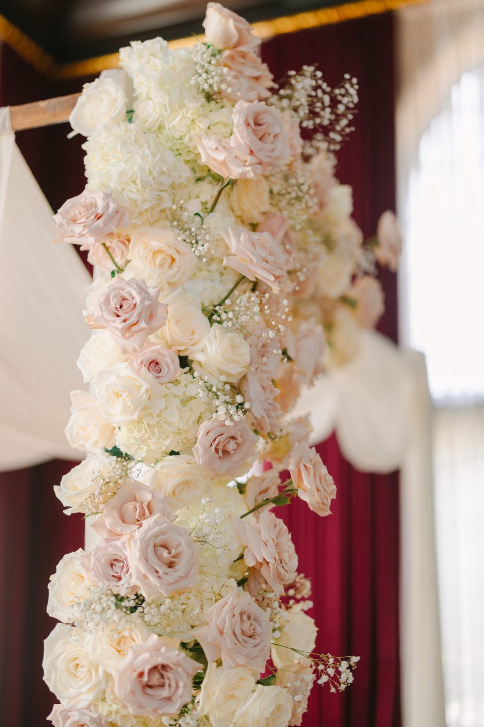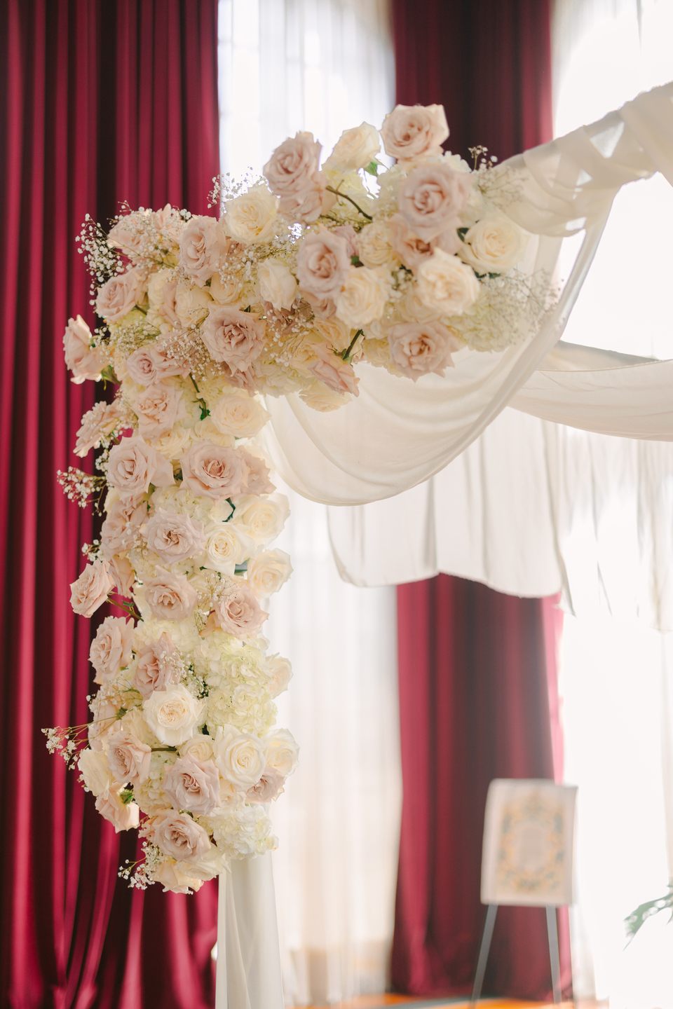 A palette of blush, ivory, and gold shaped the celebration, beginning with a spectacular floral arch of roses and baby’s breath that framed their ceremony in soft, dreamy texture. Red velvet drapes and a white draped backdrop added a touch of drama to the stately room, while a string quartet played gently, filling the space with an atmosphere of refined emotion.