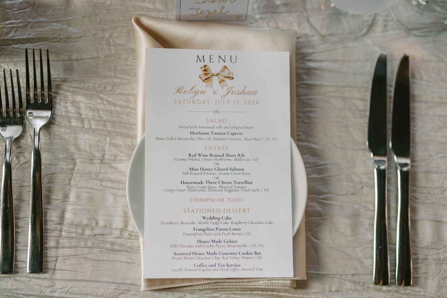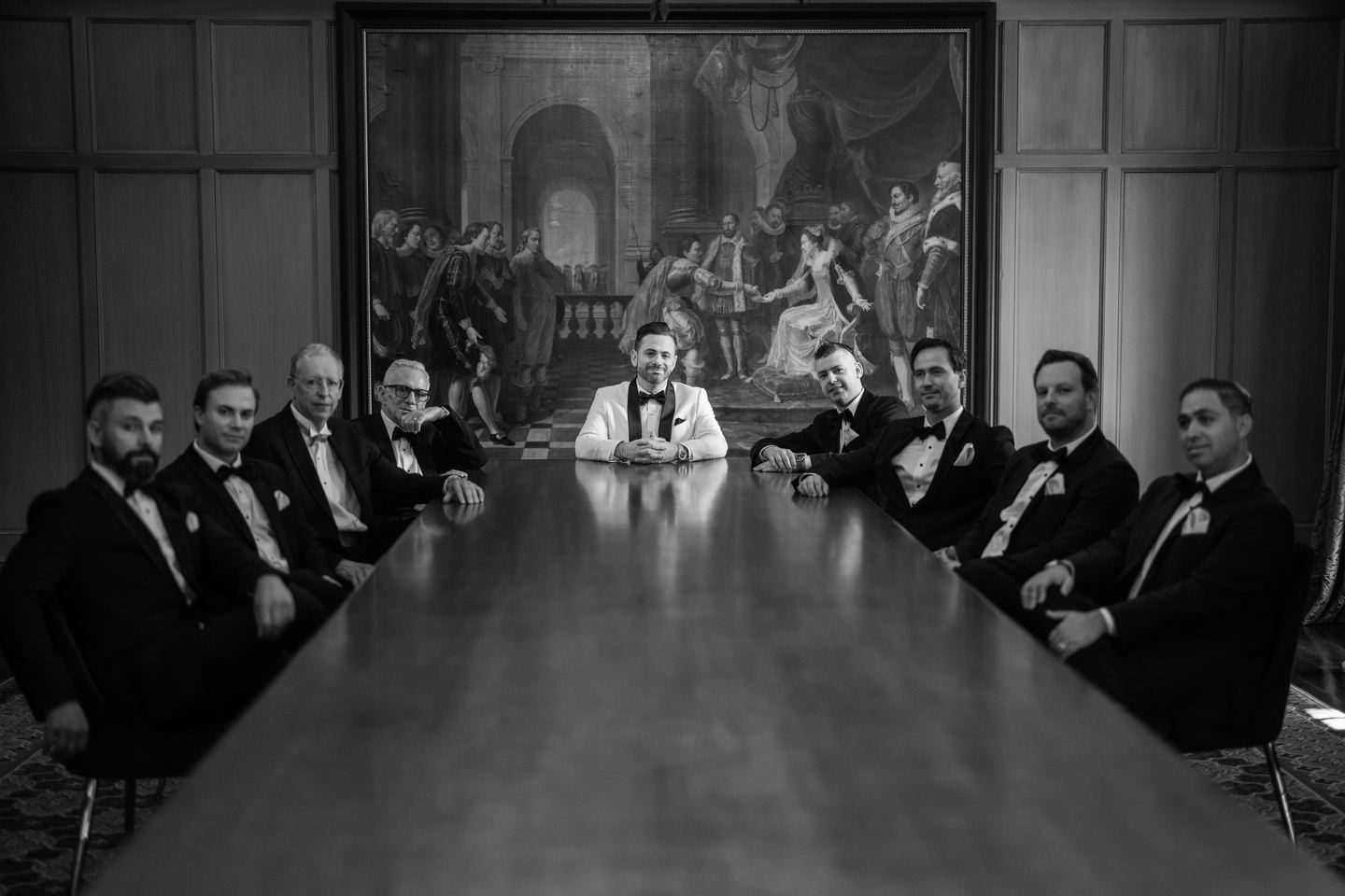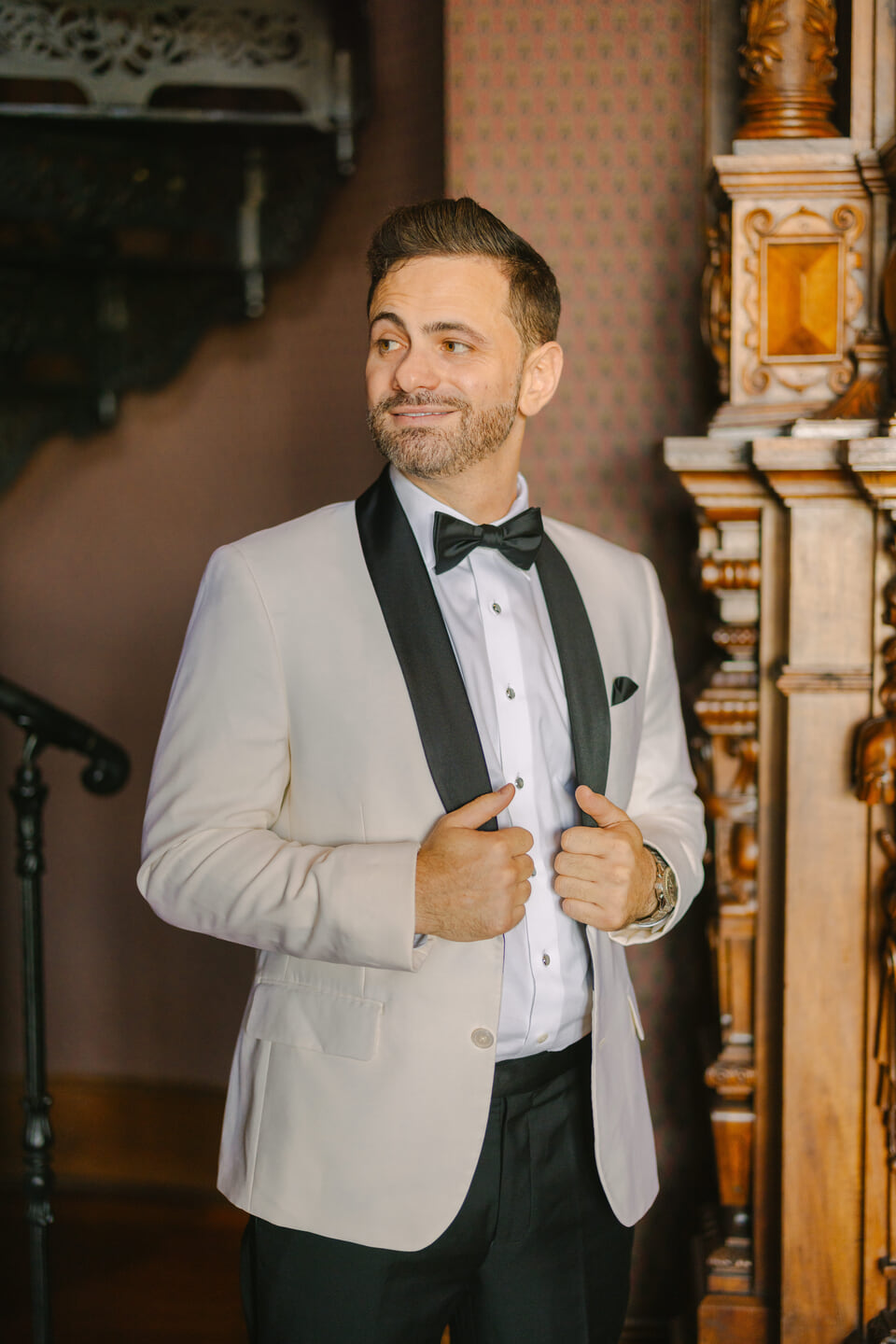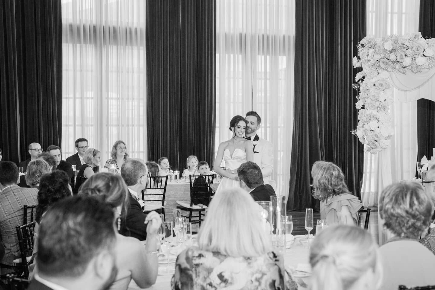A palette of blush, ivory, and gold shaped the celebration, beginning with a spectacular floral arch of roses and baby’s breath that framed their ceremony in soft, dreamy texture. Red velvet drapes and a white draped backdrop added a touch of drama to the stately room, while a string quartet played gently, filling the space with an atmosphere of refined emotion.