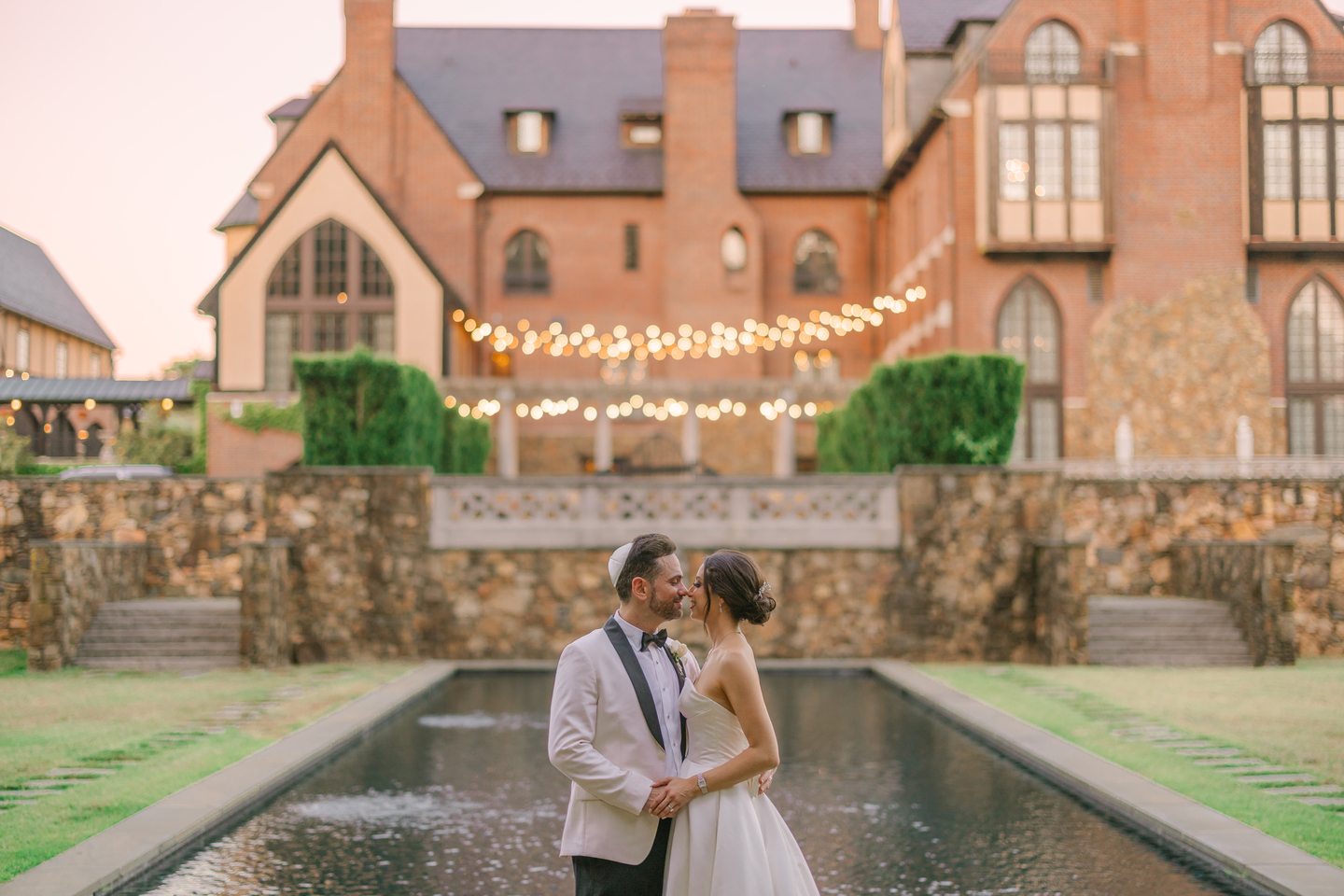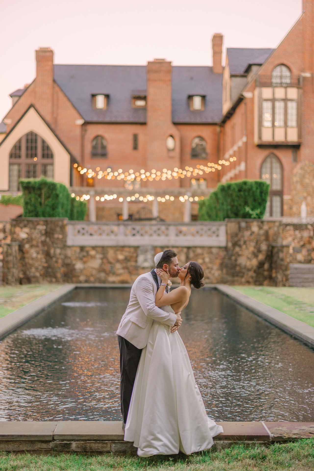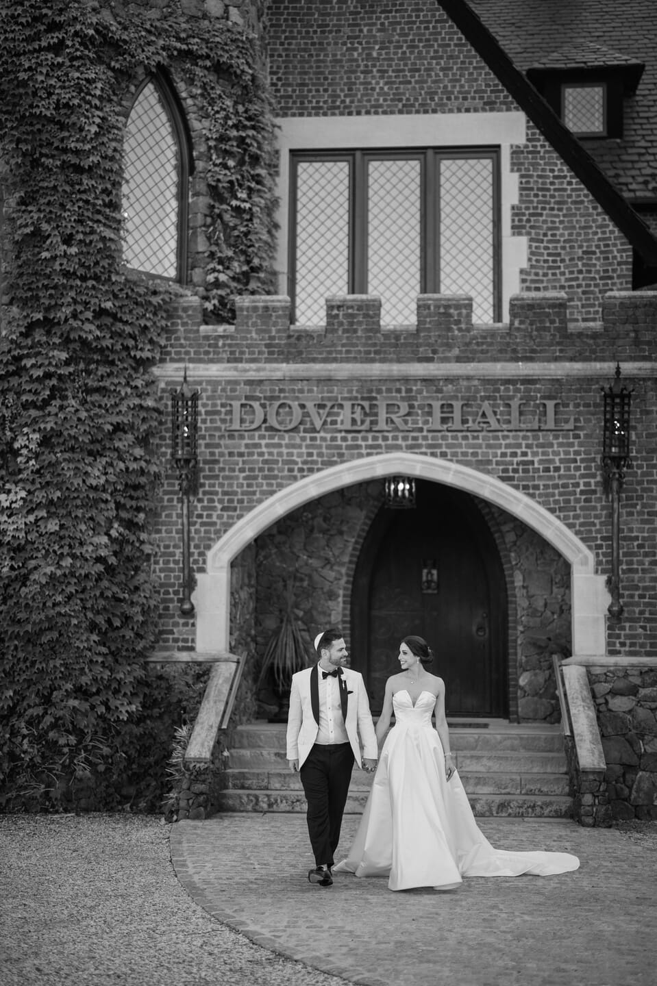 Throughout Dover Hall, thoughtful details brought their vision to life. Reception tables glowed with candlelight, blush-toned arrangements, and delicate glass vessels, creating an intimate and inviting ambiance. As night fell, guests lined the stone archway for a radiant sparkler send-off. Robyn and Joshua shared a kiss beneath the shimmering glow, a moment as cinematic as it was romantic. Dover Hall’s brick facades, arched windows, and castle-like architecture offered endless backdrops for portraits, each one capturing the grandeur and intimacy of their celebration.