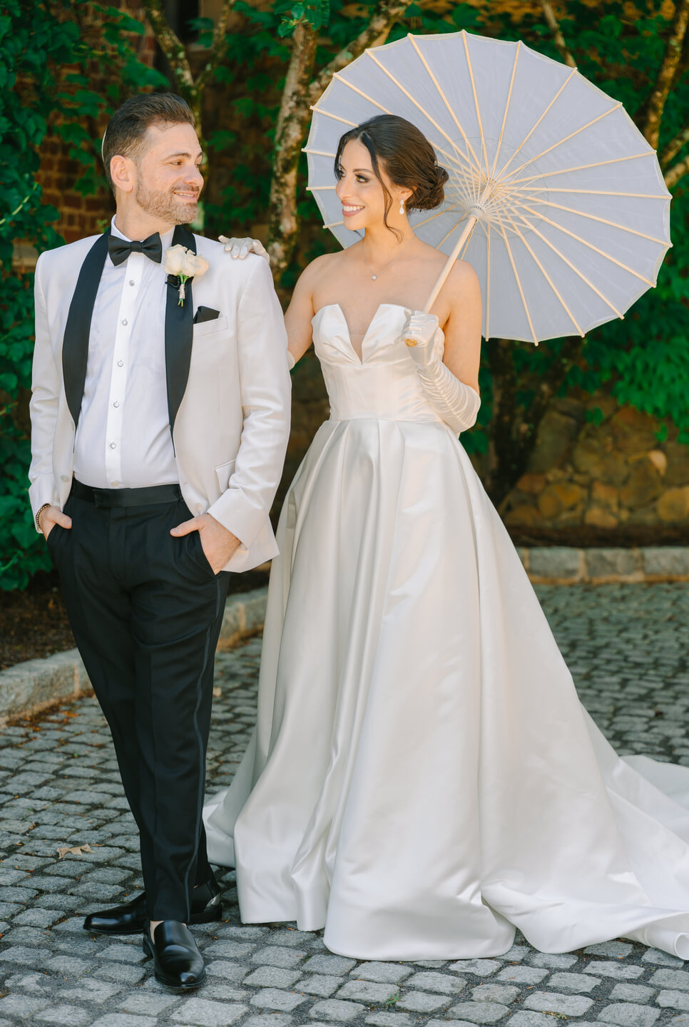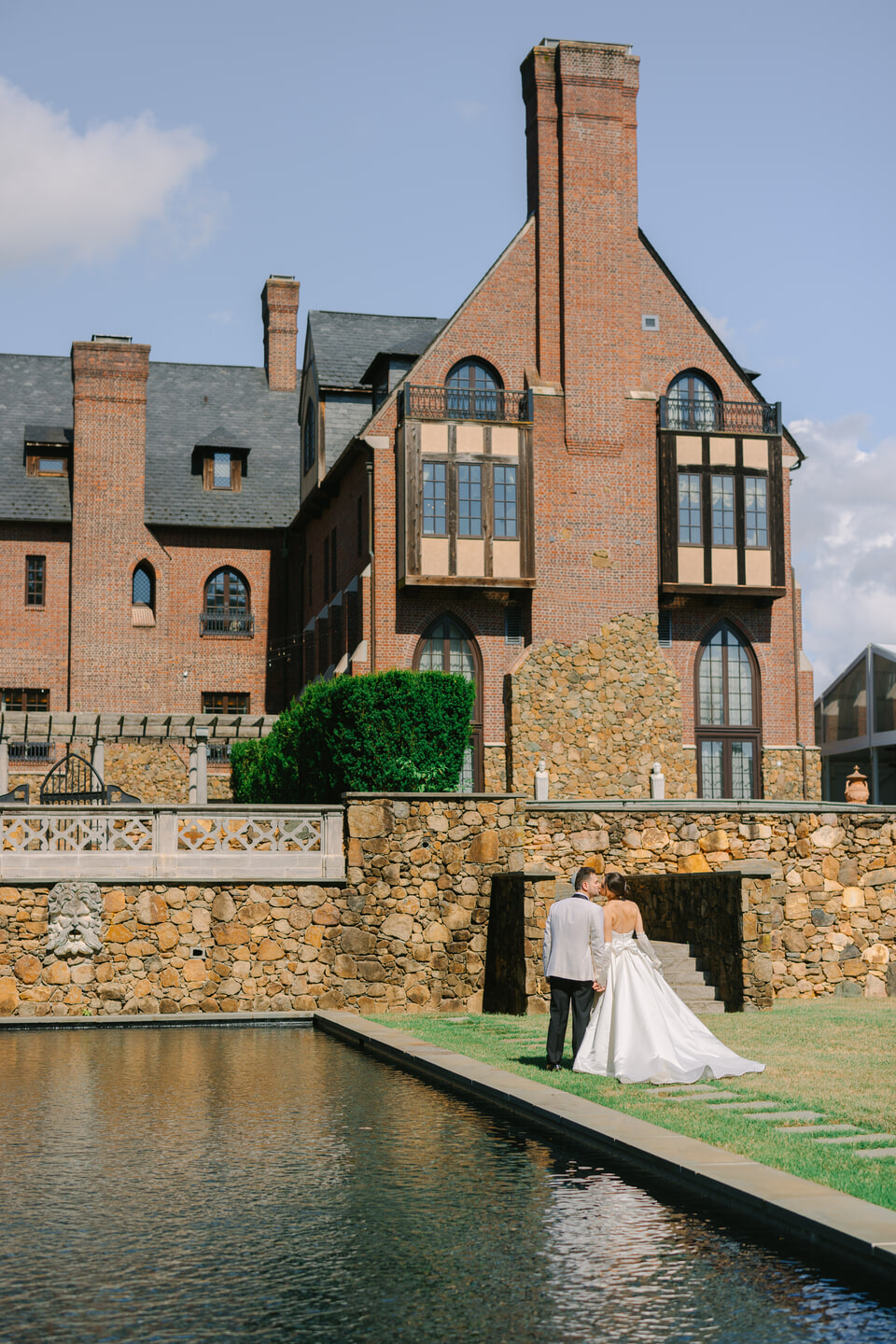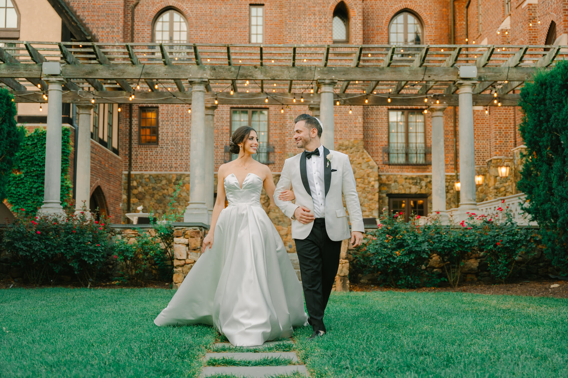 Throughout Dover Hall, thoughtful details brought their vision to life. Reception tables glowed with candlelight, blush-toned arrangements, and delicate glass vessels, creating an intimate and inviting ambiance. As night fell, guests lined the stone archway for a radiant sparkler send-off. Robyn and Joshua shared a kiss beneath the shimmering glow, a moment as cinematic as it was romantic. Dover Hall’s brick facades, arched windows, and castle-like architecture offered endless backdrops for portraits, each one capturing the grandeur and intimacy of their celebration.