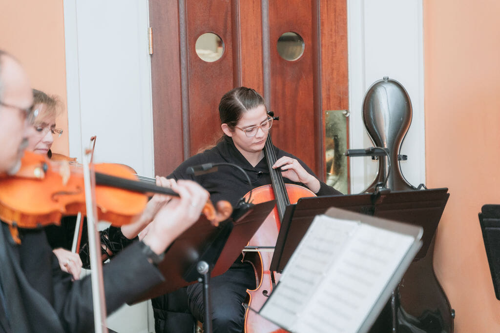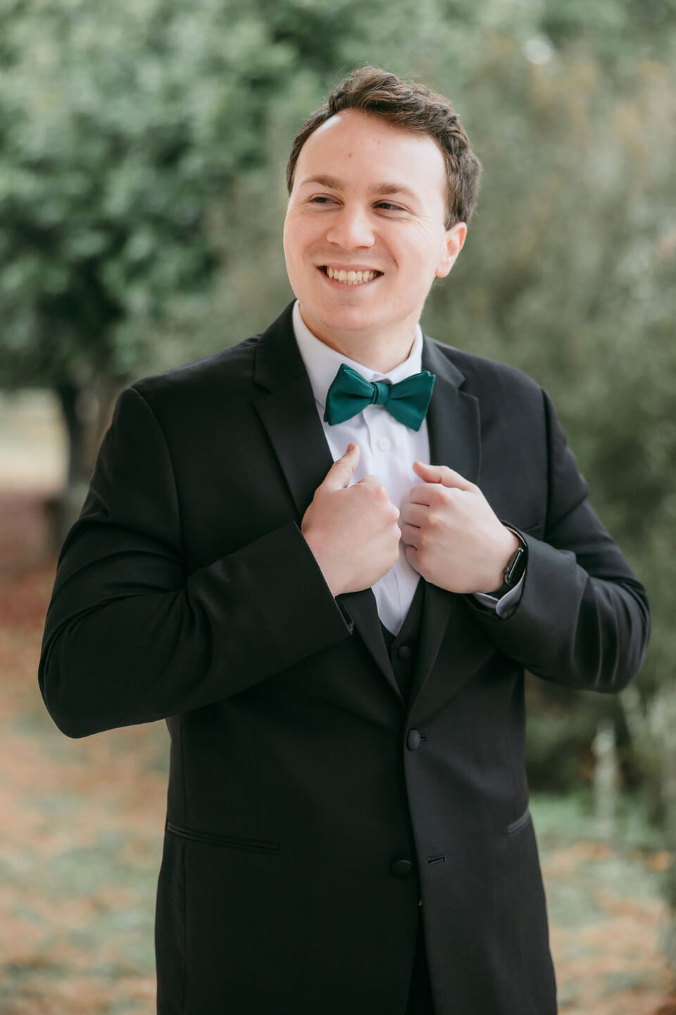 Their palette of emerald green and crisp white set a fresh winter tone, while classical musicians brought a graceful ambiance to the ceremony. Inside the reception, teal accents, red roses, pine greenery, and winter berries added richness to the elegant space. A semi-naked cake adorned with evergreens and berries captured the spirit of the season.