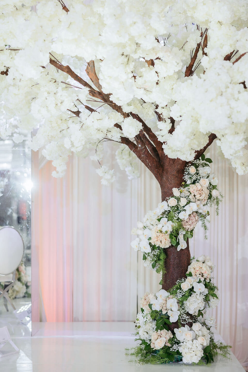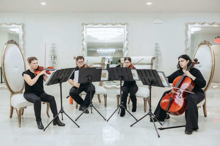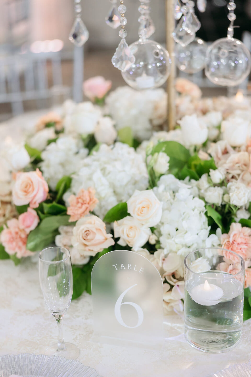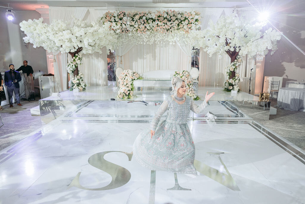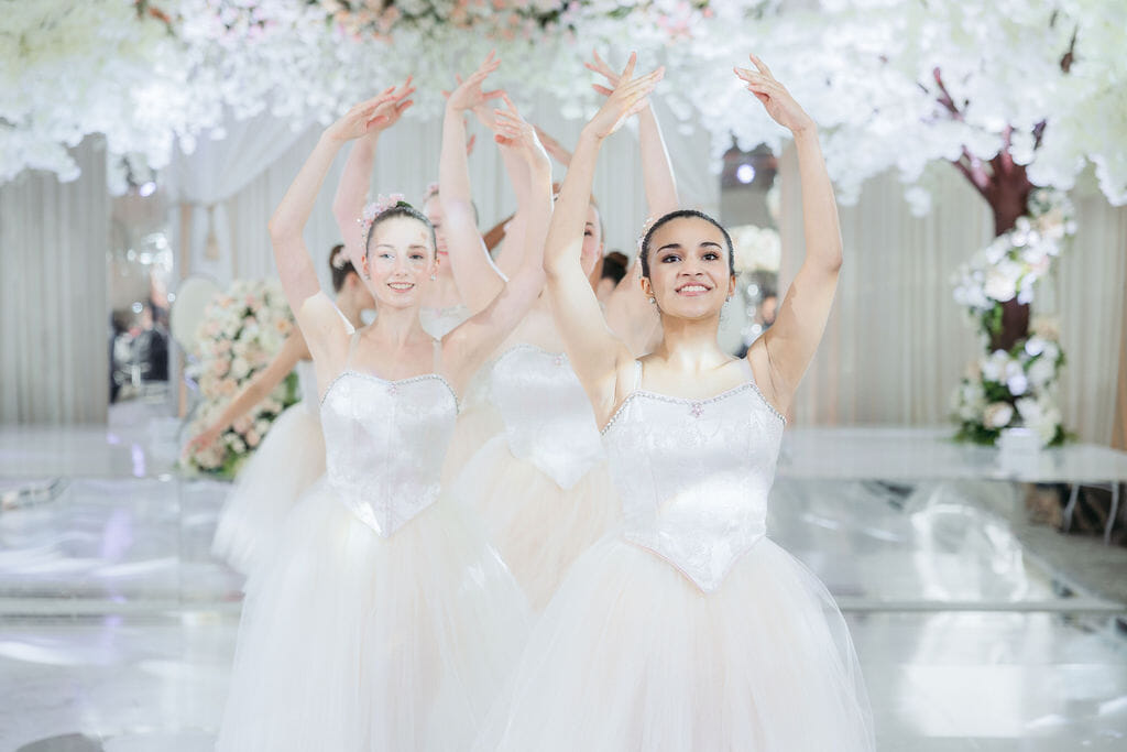 The reception dazzled beneath sculptural wave chandeliers, where soaring floral arrangements of blush hydrangeas, coral roses, and baby’s breath—crafted by Our Day Events—reflected across mirrored tables and crystal vases. Guests enjoyed a sumptuous feast by Ravi Kabob House, while elegant string music by Atoka Strings and graceful ballet by The Russell School of Ballet added refinement to the evening’s atmosphere.
