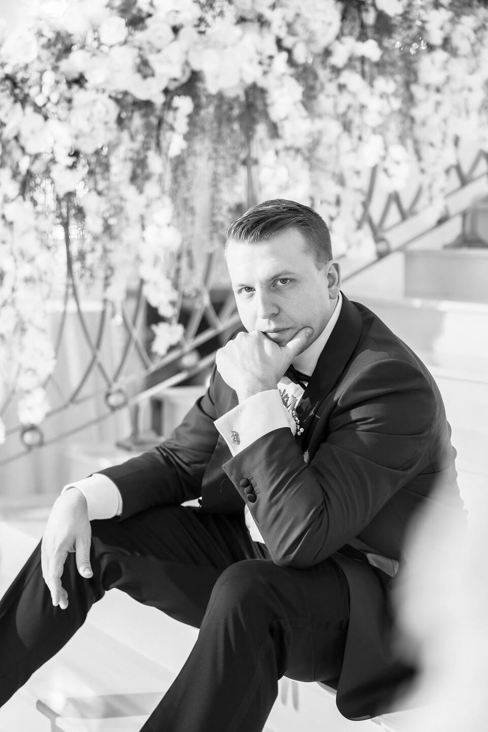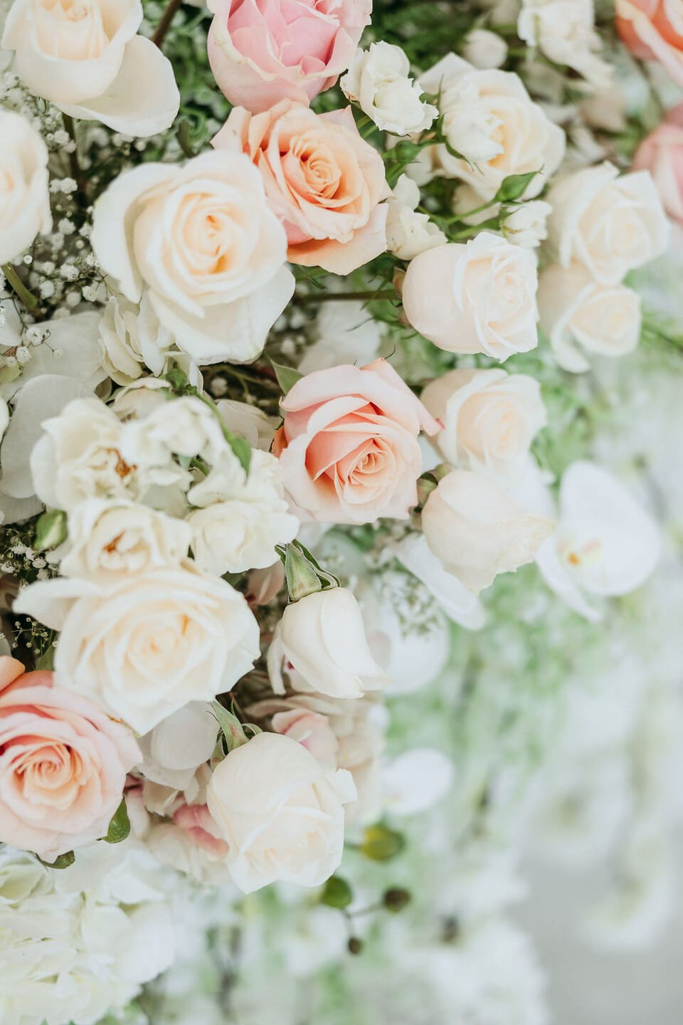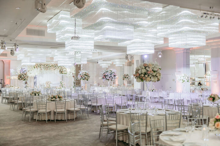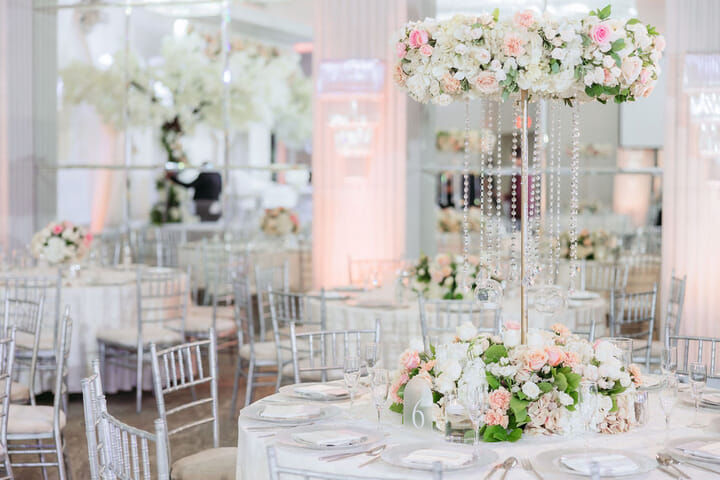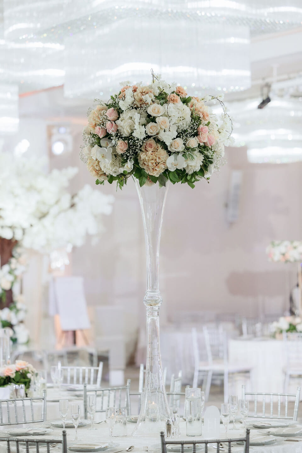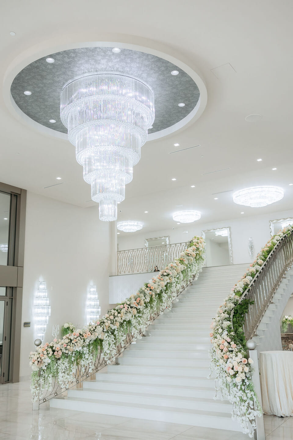 Within the luminous grandeur of CrystalView’s crystalline ballroom, Sara and Nick’s October wedding embodied contemporary elegance and breathtaking floral opulence. A magnificent double staircase draped in thousands of ivory and blush roses created an unforgettable entrance, leading guests into a scene of pure enchantment.