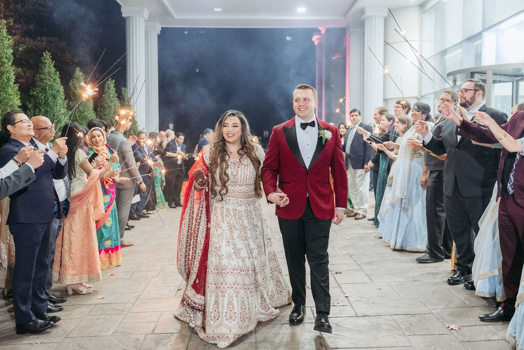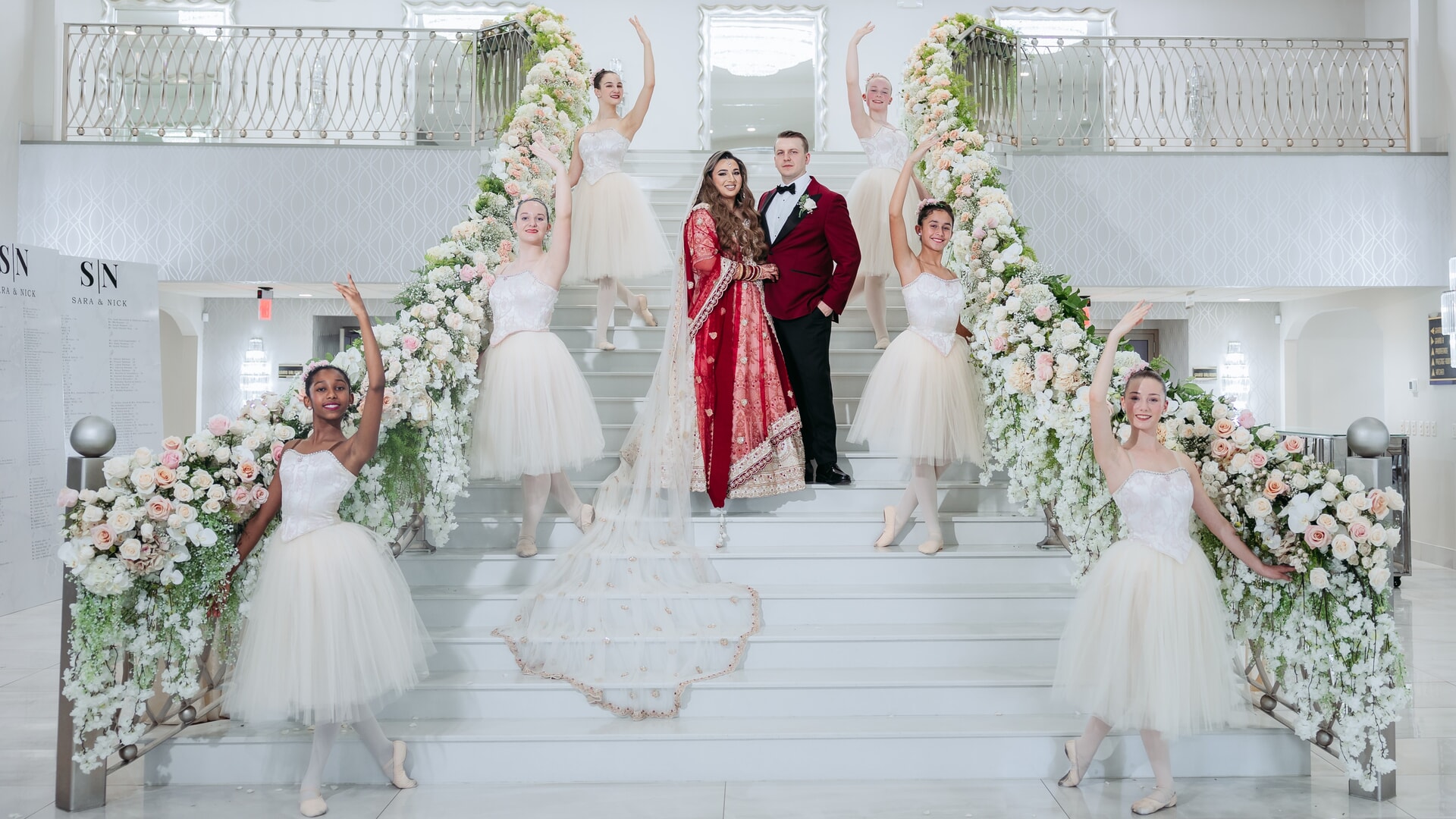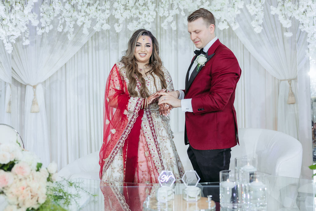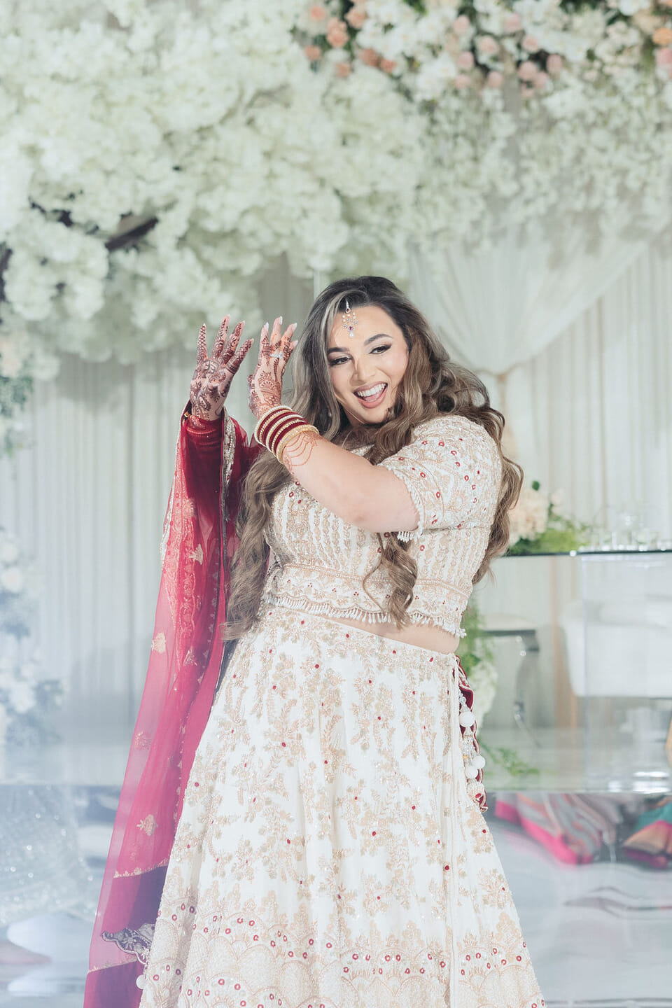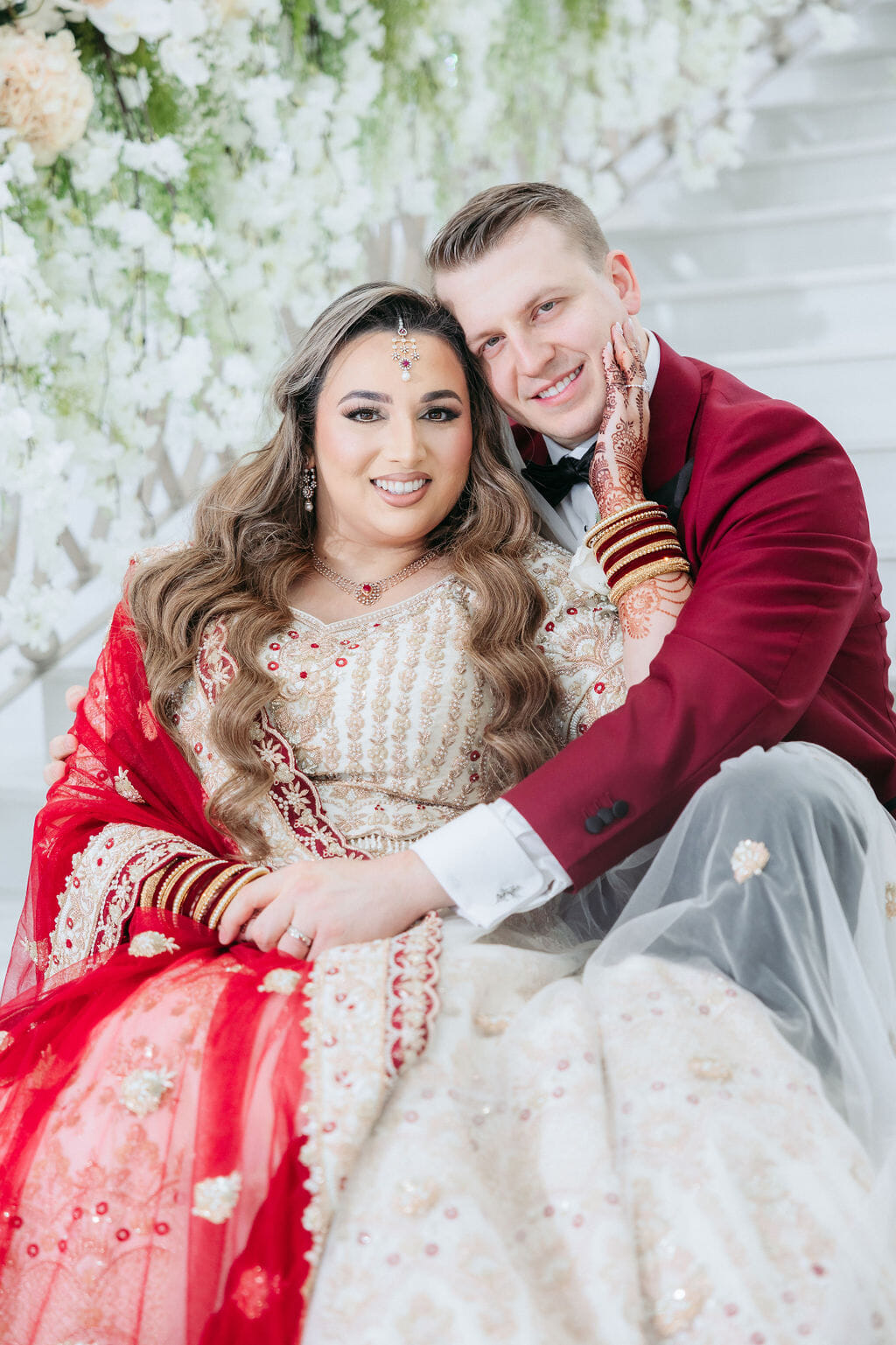 Sara was radiant in a richly embroidered crimson and gold lehenga that shimmered beneath the chandeliers, while Nick complemented her in a luxurious burgundy velvet jacket. Towering cherry blossom trees adorned with white blooms framed an ethereal ceremony space styled by Our Day Events, accented with flowing drapery and lucite furnishings.