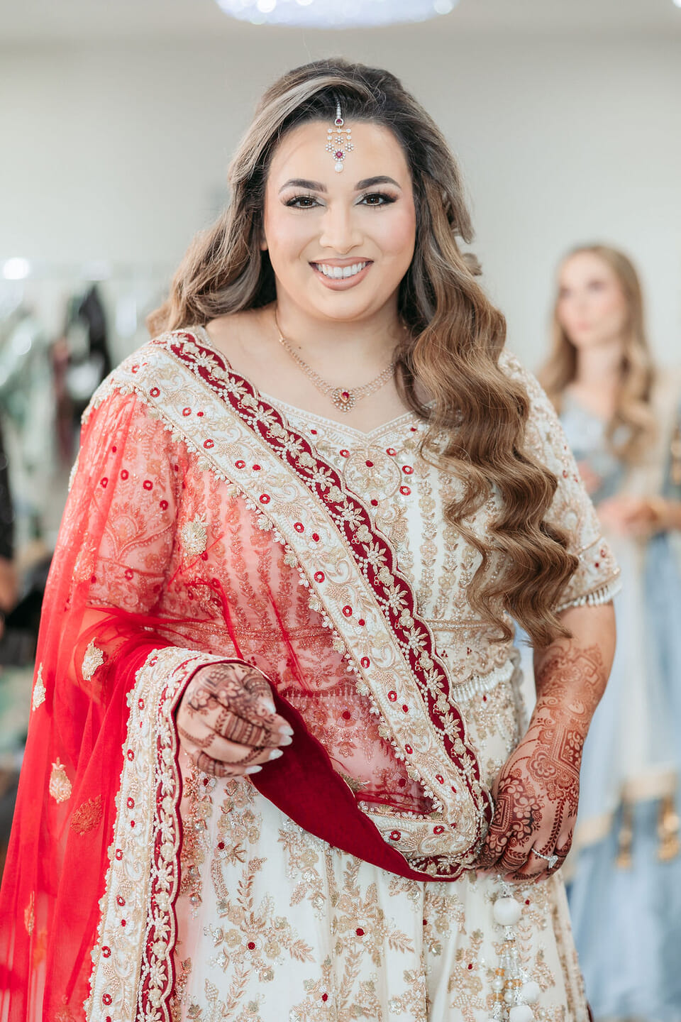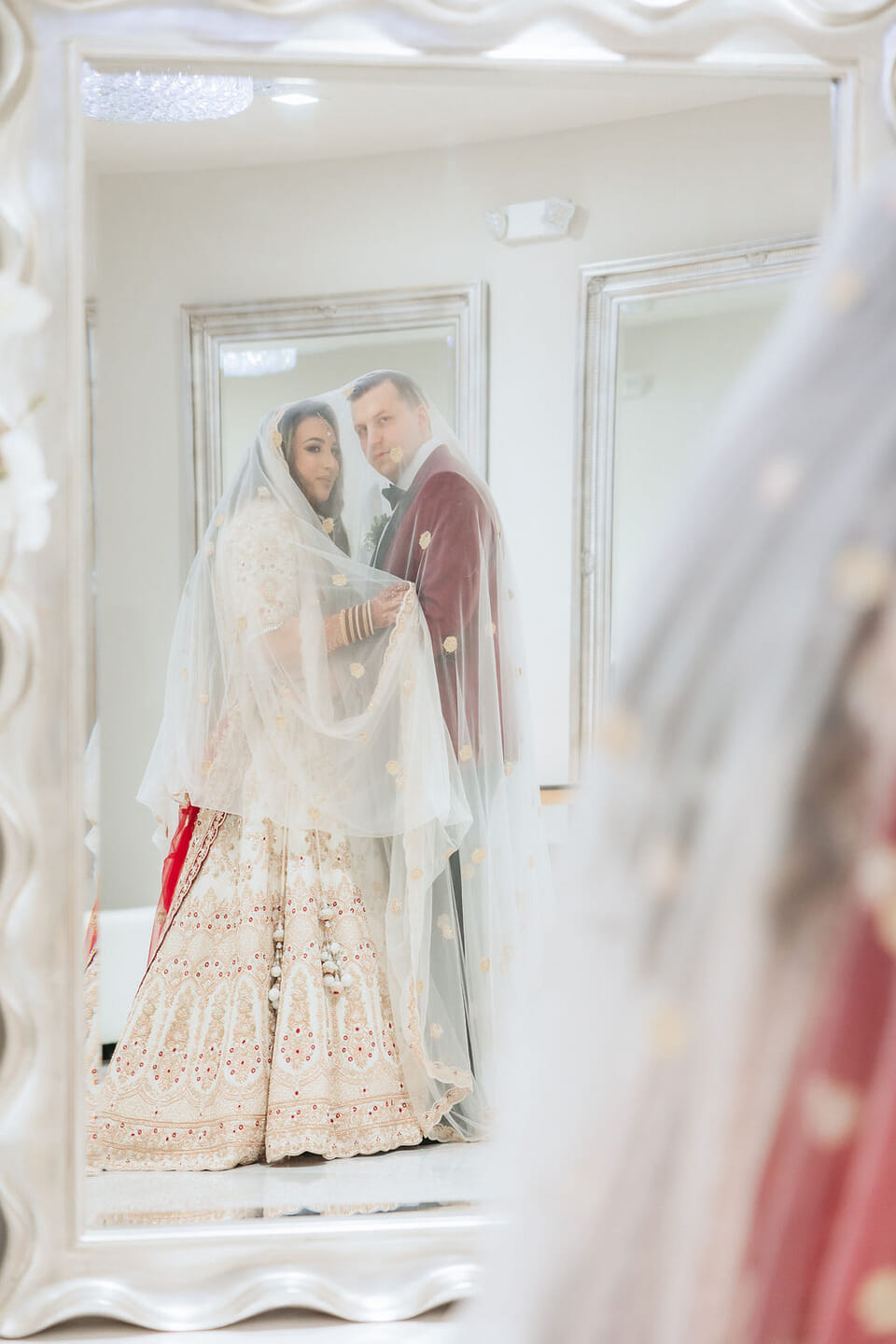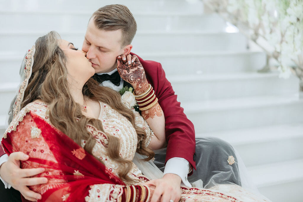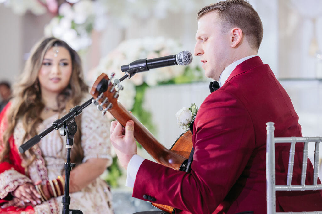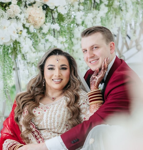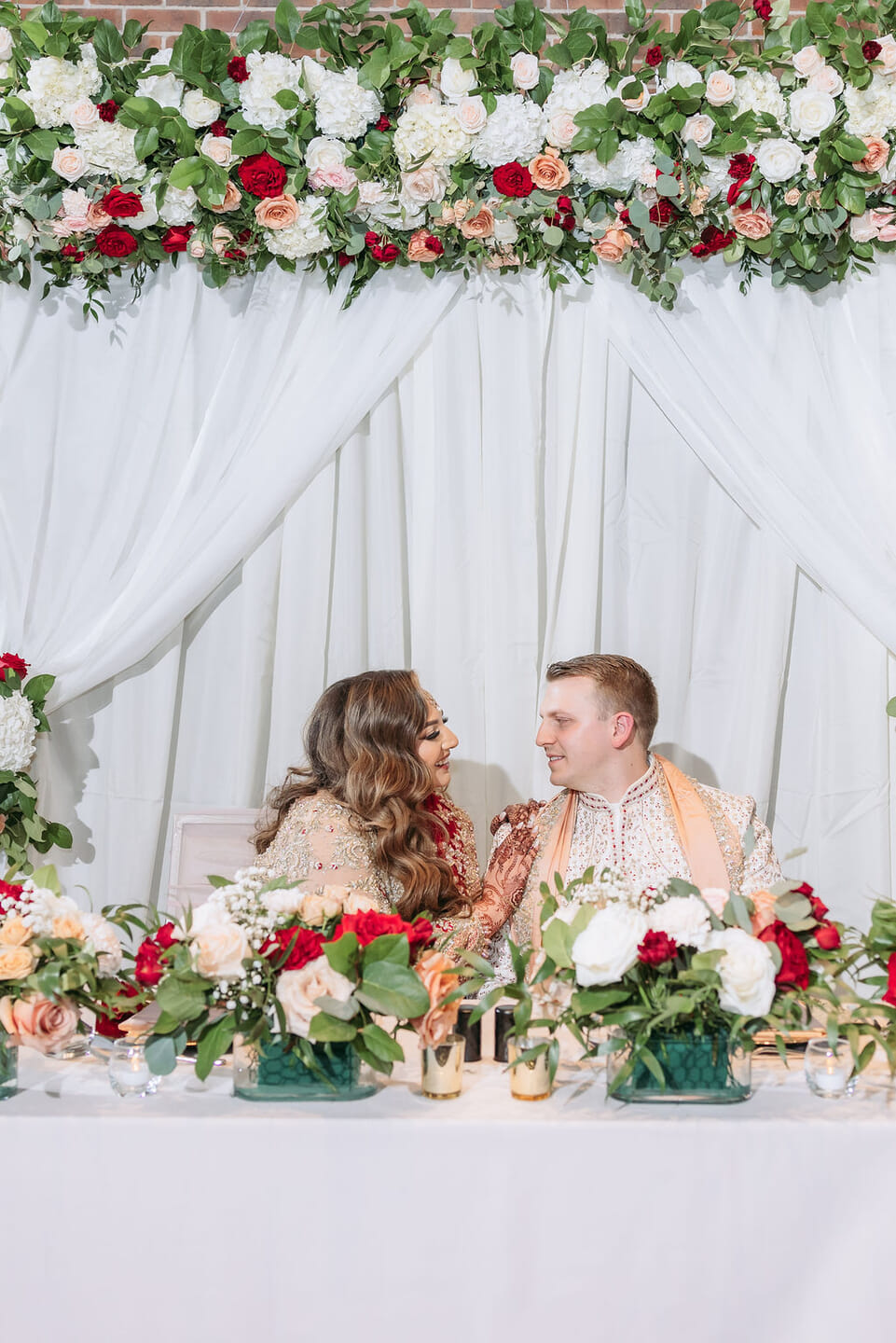 Sara was radiant in a richly embroidered crimson and gold lehenga that shimmered beneath the chandeliers, while Nick complemented her in a luxurious burgundy velvet jacket. Towering cherry blossom trees adorned with white blooms framed an ethereal ceremony space styled by Our Day Events, accented with flowing drapery and lucite furnishings.