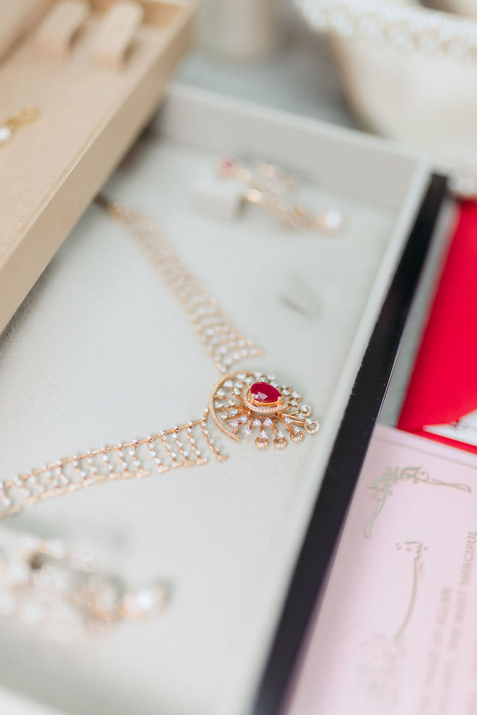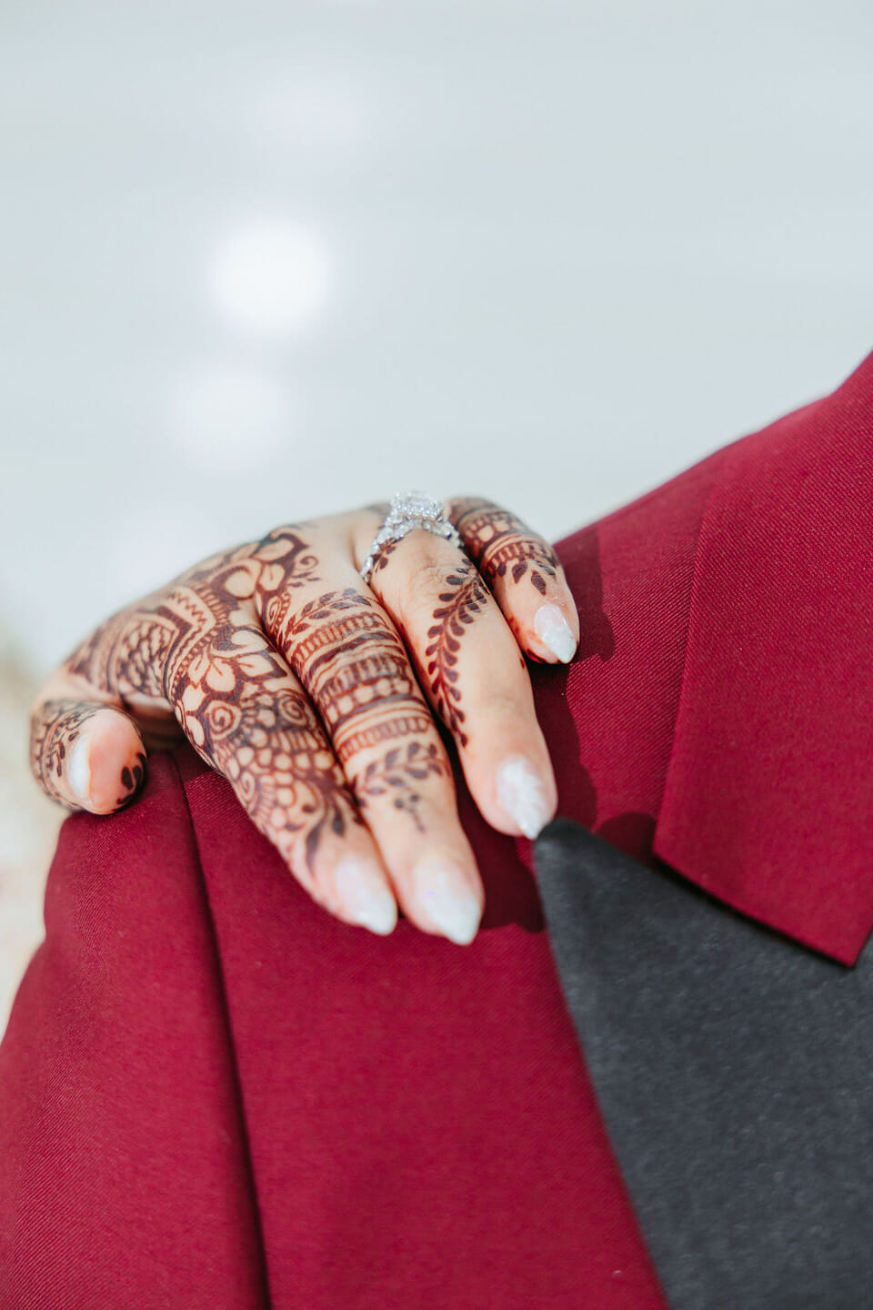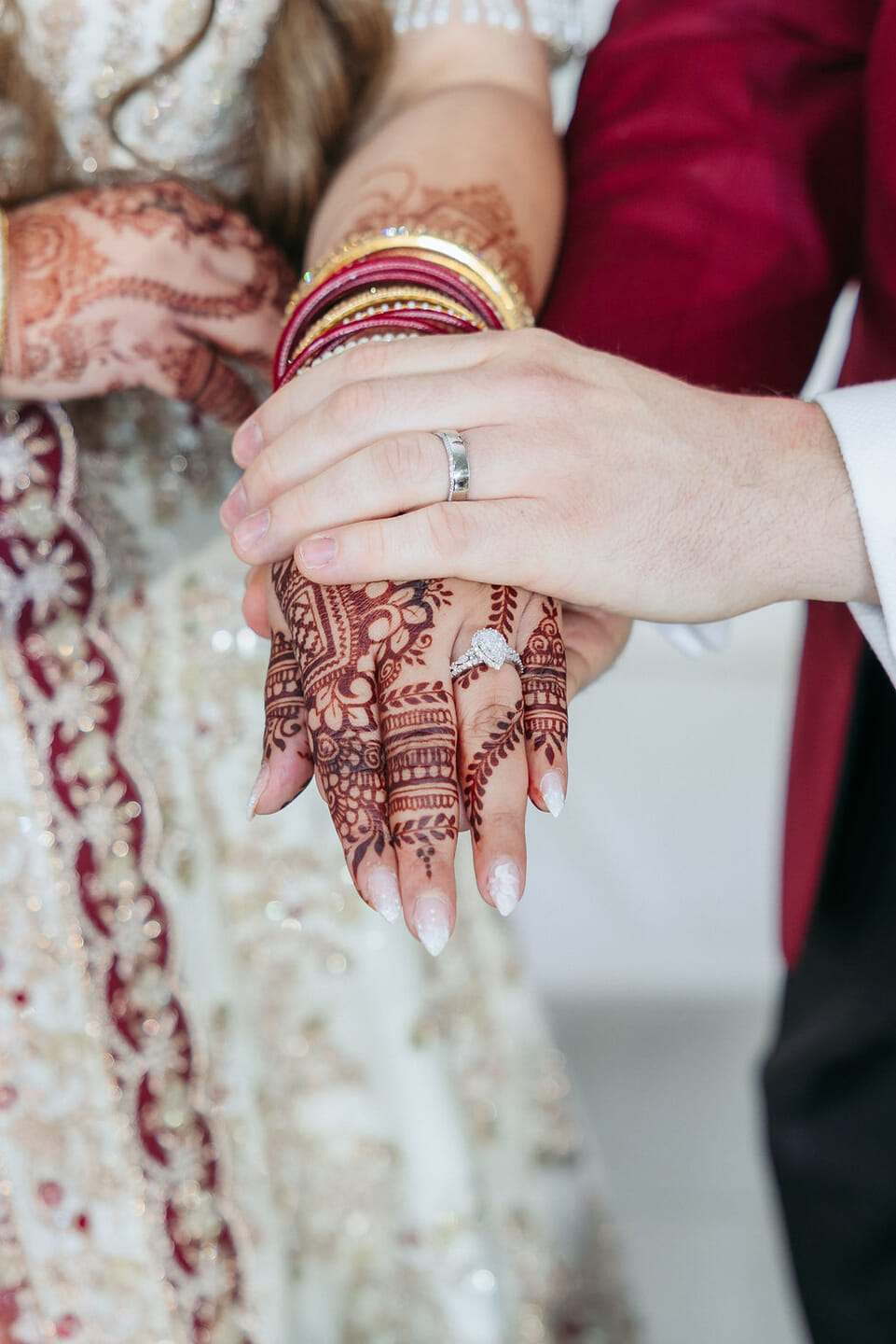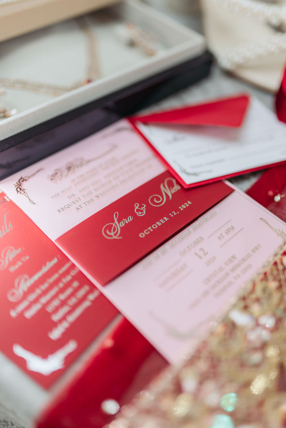 Sara was radiant in a richly embroidered crimson and gold lehenga that shimmered beneath the chandeliers, while Nick complemented her in a luxurious burgundy velvet jacket. Towering cherry blossom trees adorned with white blooms framed an ethereal ceremony space styled by Our Day Events, accented with flowing drapery and lucite furnishings.