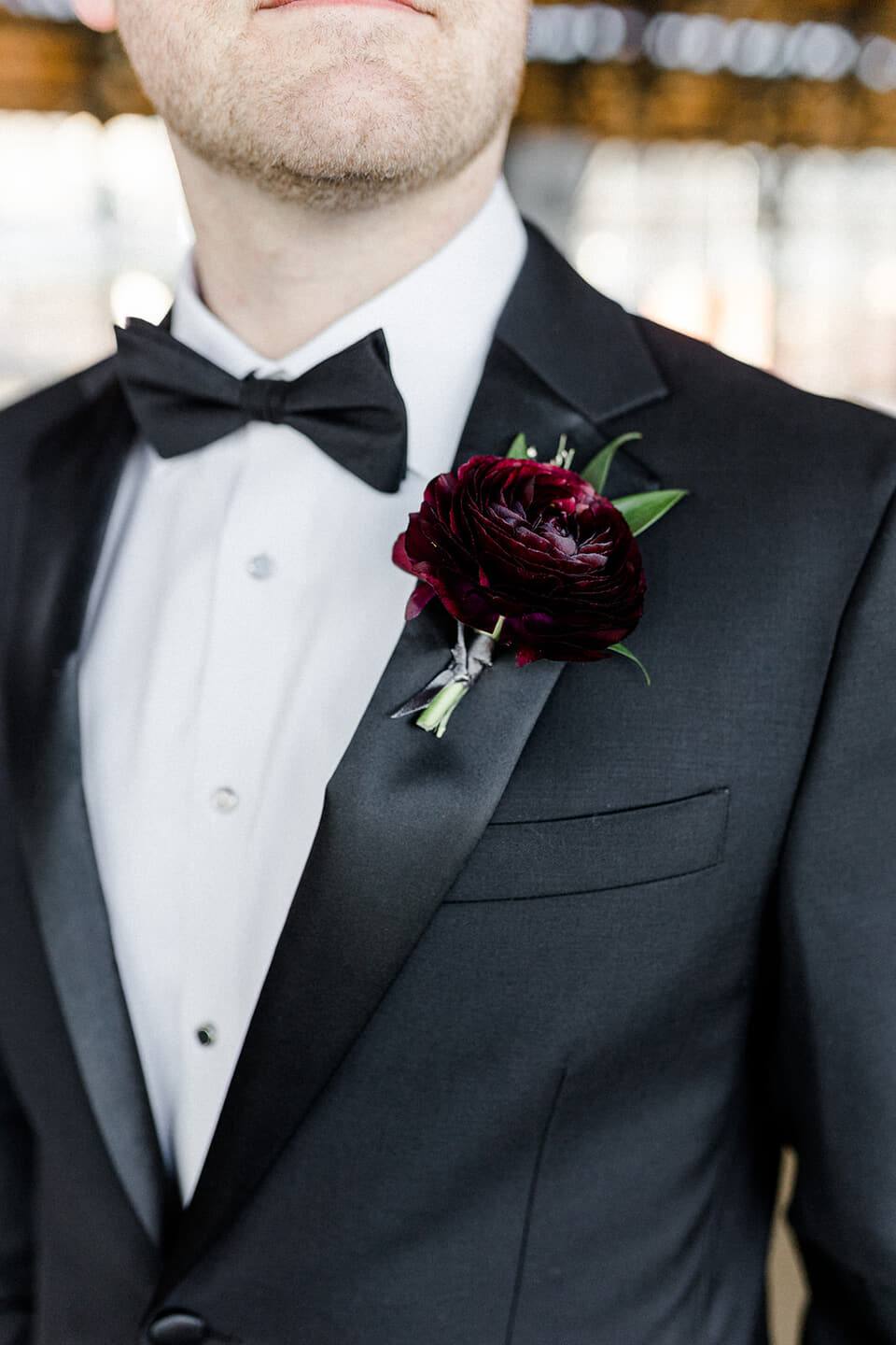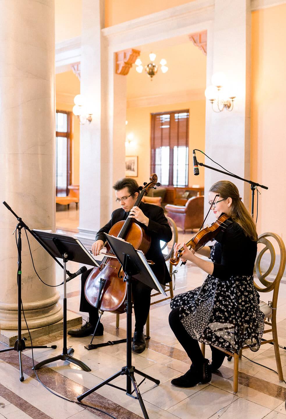 The ceremony exuded understated romance, with wooden chairs adorned in blush, burgundy, and ivory blooms by Amanda Burnette Floral Design, tied with soft gray ribbons. Eucalyptus and lush greenery framed the aisle, creating an organic balance against the station’s refined interiors. The air filled with the graceful sounds of Ninja Strings, whose live quartet added warmth and elegance to the moment.