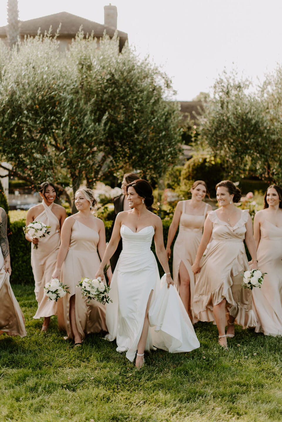 The ceremony unfolded on the Grand Lawn, where rows of walnut cross back chairs faced the iconic stone tower. Large urn arrangements of white roses, garden roses, and soft greenery by Garaventa’s framed the altar, reflecting a refined palette of ivory, white, and gold. Through the lens of Captured by Kay Photography, the day is seen with a light, airy sensibility that brings out the softness of the setting and the quiet emotion of each moment.