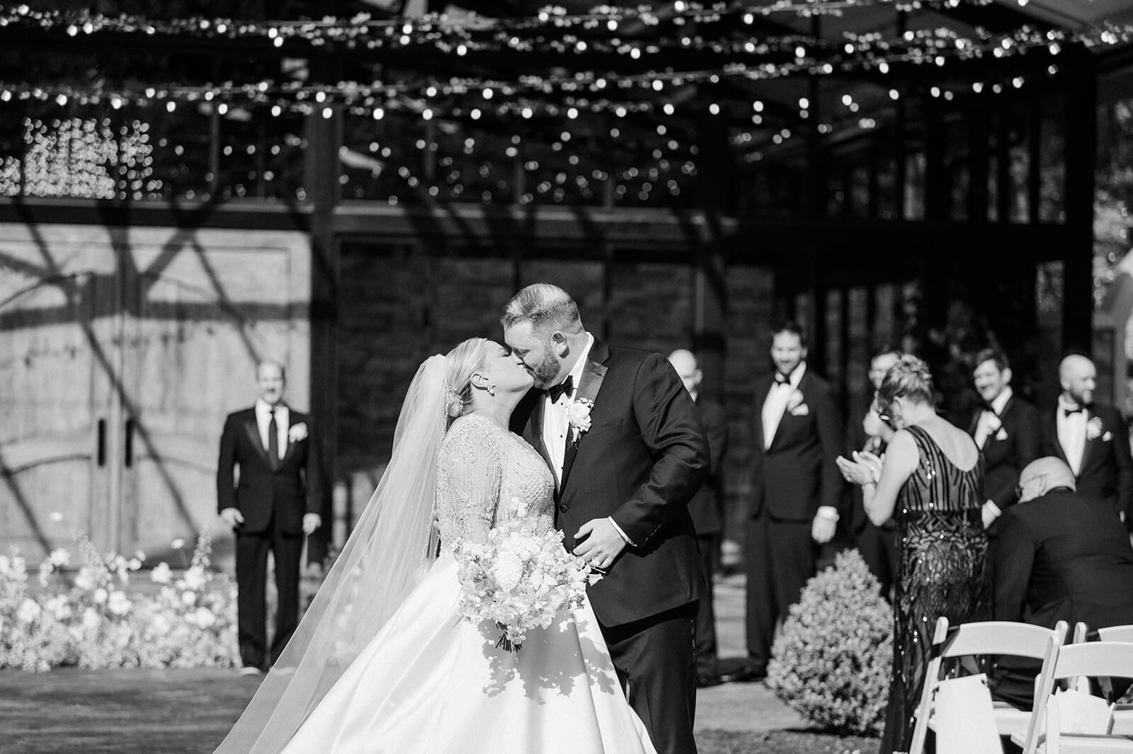 Meaghan and Drew exchanged vows beneath the towering trees of The Hidden Oaks in North Chesterfield, Virginia, where dappled sunlight and quiet forest air created a naturally romantic setting. Their May wedding embraced a polished black and white palette softened by lush white florals from Monarch Flower Farm, with guests seated along a simple, graceful aisle framed by greenery.