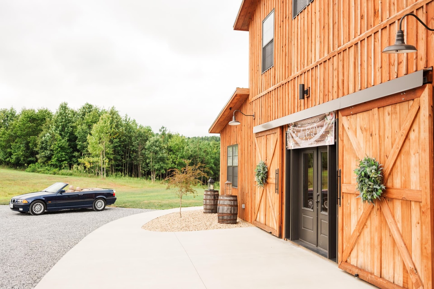 After the ceremony, guests gathered in the timber-framed reception space where golden sunlight poured through soaring windows. A vintage-inspired wooden arch draped in trailing greenery and twinkling lights welcomed everyone into a warm, inviting setting. Sleek black linens contrasted beautifully with honey-toned pine walls, while botanical centerpieces and pampas plumes added a touch of bohemian elegance. A textured buttercream cake, adorned with blush roses and delicate piping, offered a sweet focal point for the evening. Laughter echoed beneath artisanal chandeliers as guests enjoyed heartfelt toasts and cheered on the couple during their playful shoe game.