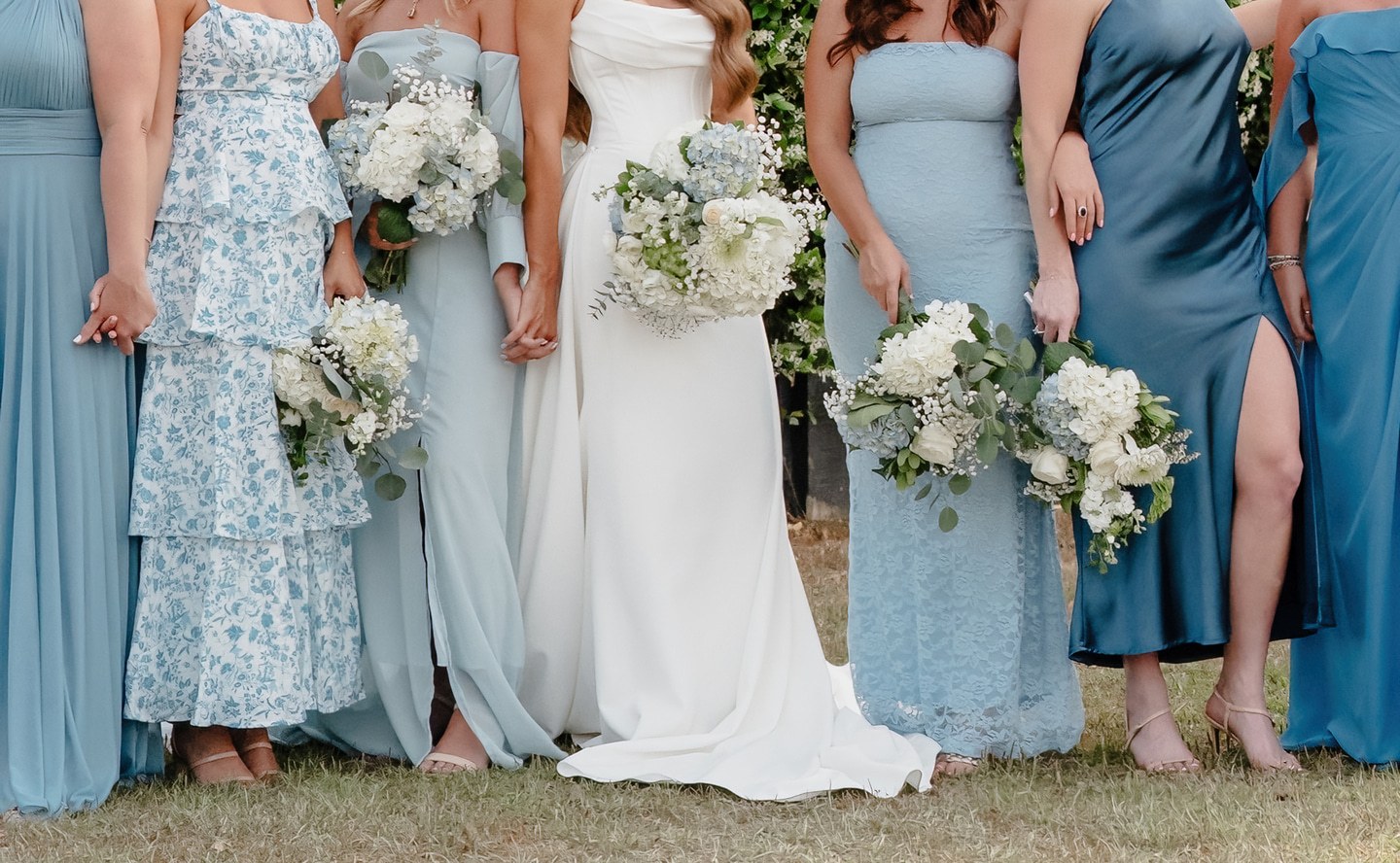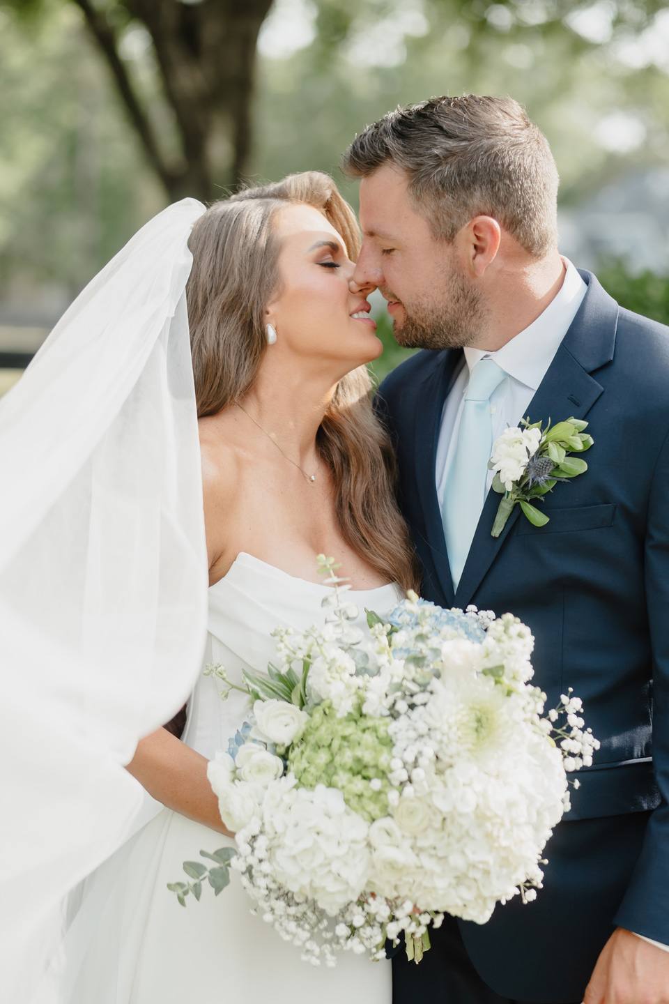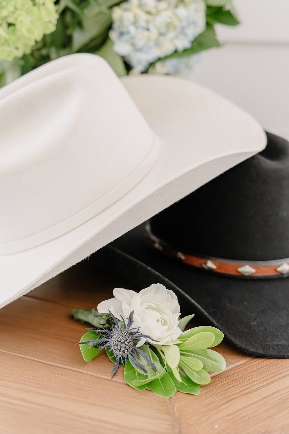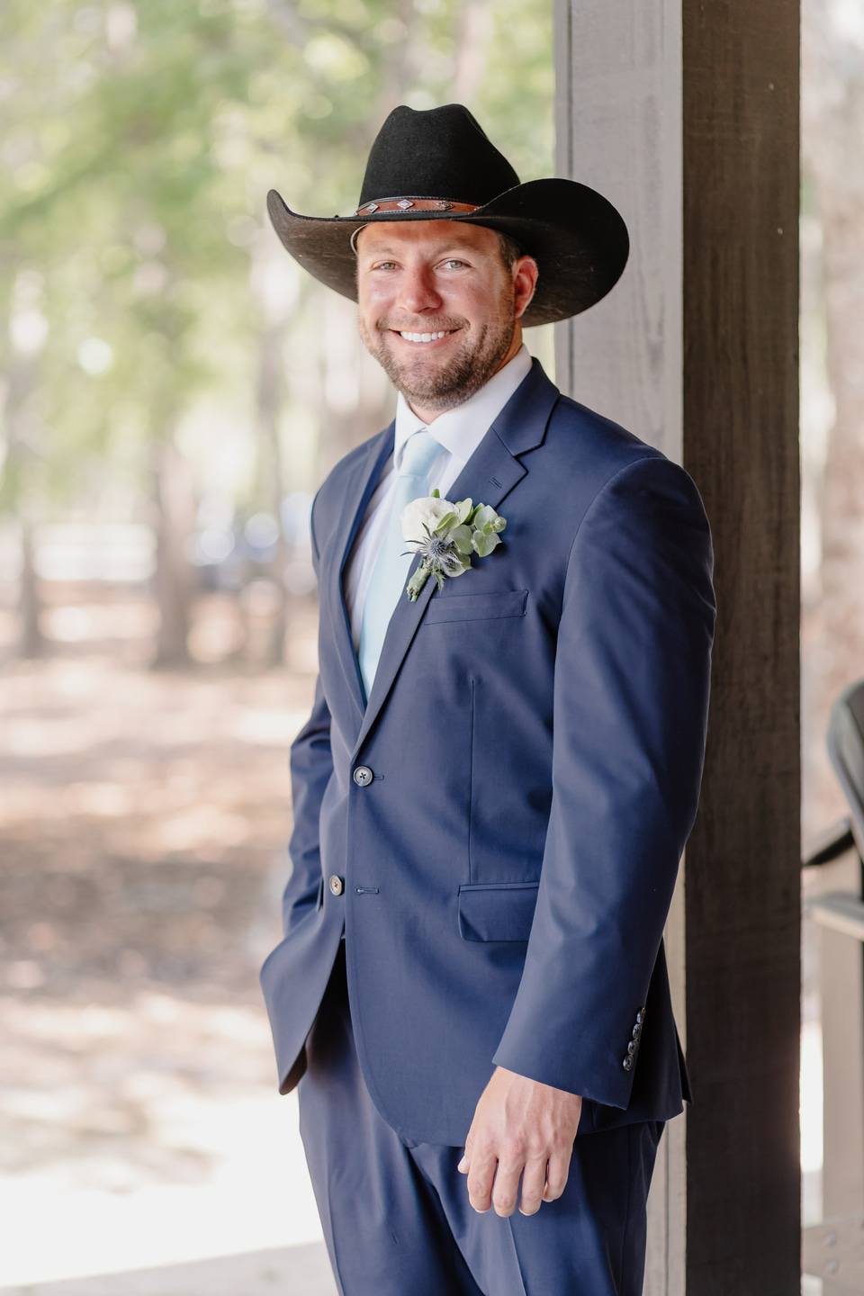 The bridal party was a graceful study in coordinated hues, with bridesmaids dressed in shades of blue from pale powder to deep navy. Their bouquets were filled with hydrangeas, baby’s breath, and eucalyptus, creating a soft and romantic harmony. Morgan wore a strapless gown of pristine white, flowing in timeless elegance. Kraig brought a touch of personal charm with his navy suit and cowboy hat, his boutonnière of white rose and thistle tied together with sprigs of eucalyptus.