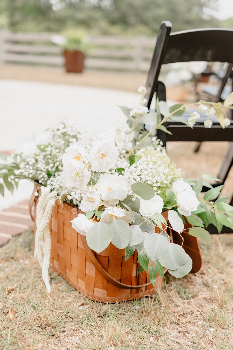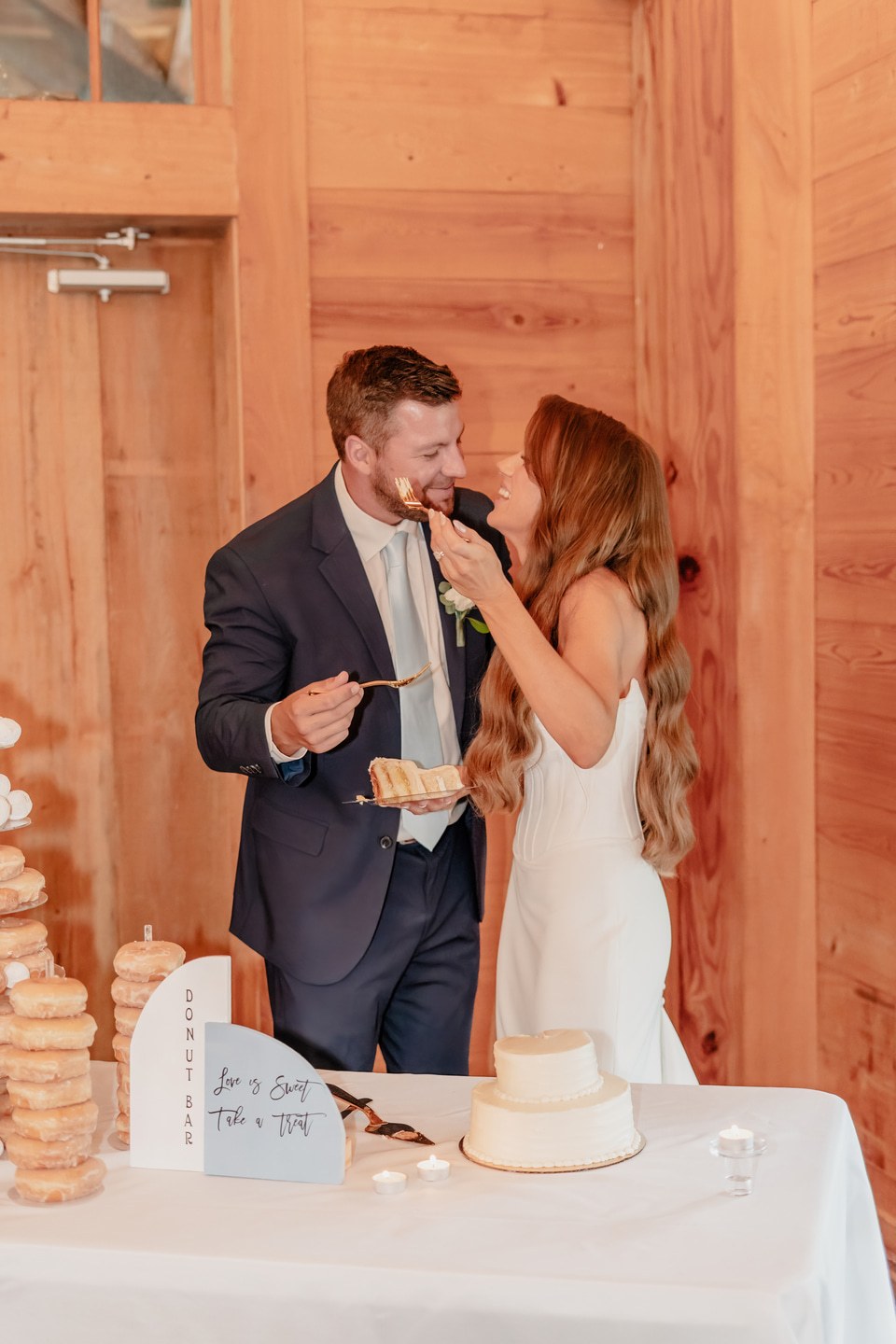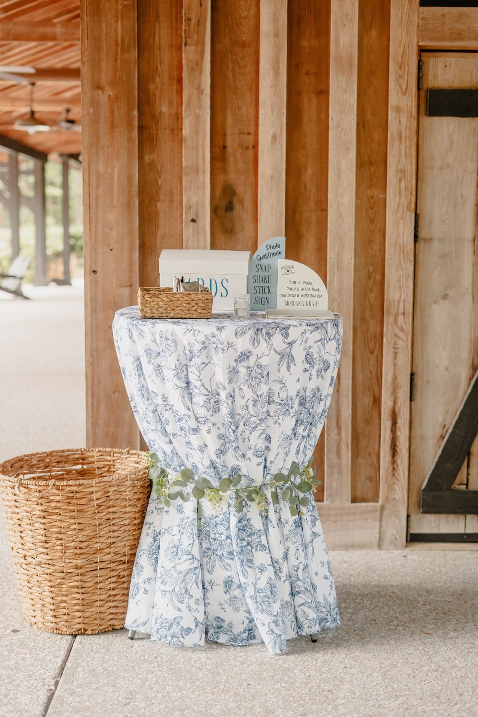 The bridal party was a graceful study in coordinated hues, with bridesmaids dressed in shades of blue from pale powder to deep navy. Their bouquets were filled with hydrangeas, baby’s breath, and eucalyptus, creating a soft and romantic harmony. Morgan wore a strapless gown of pristine white, flowing in timeless elegance. Kraig brought a touch of personal charm with his navy suit and cowboy hat, his boutonnière of white rose and thistle tied together with sprigs of eucalyptus.