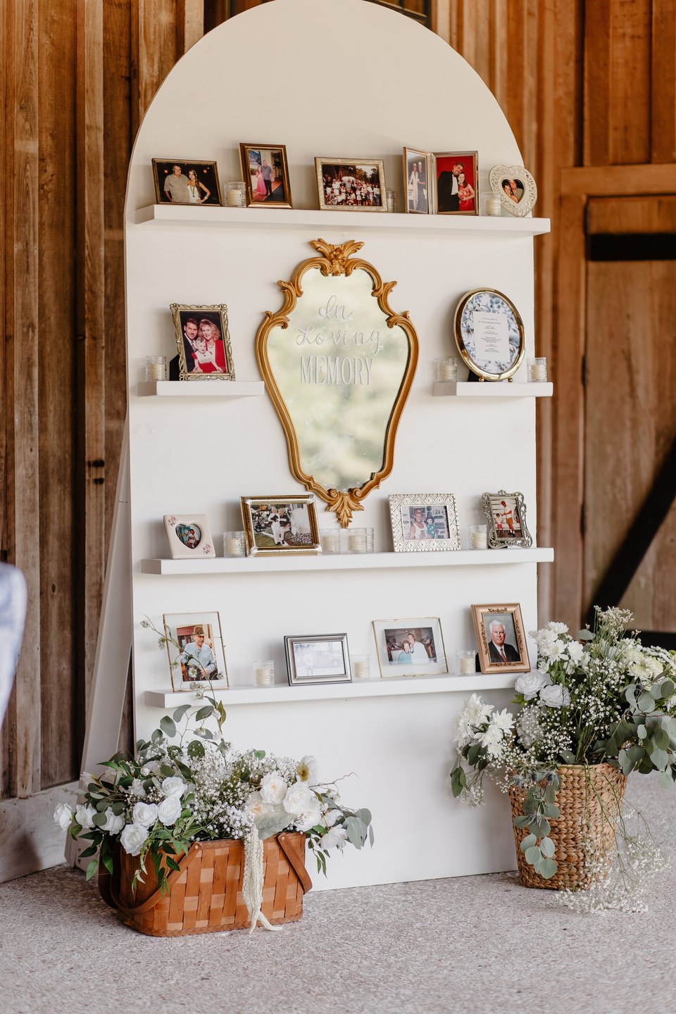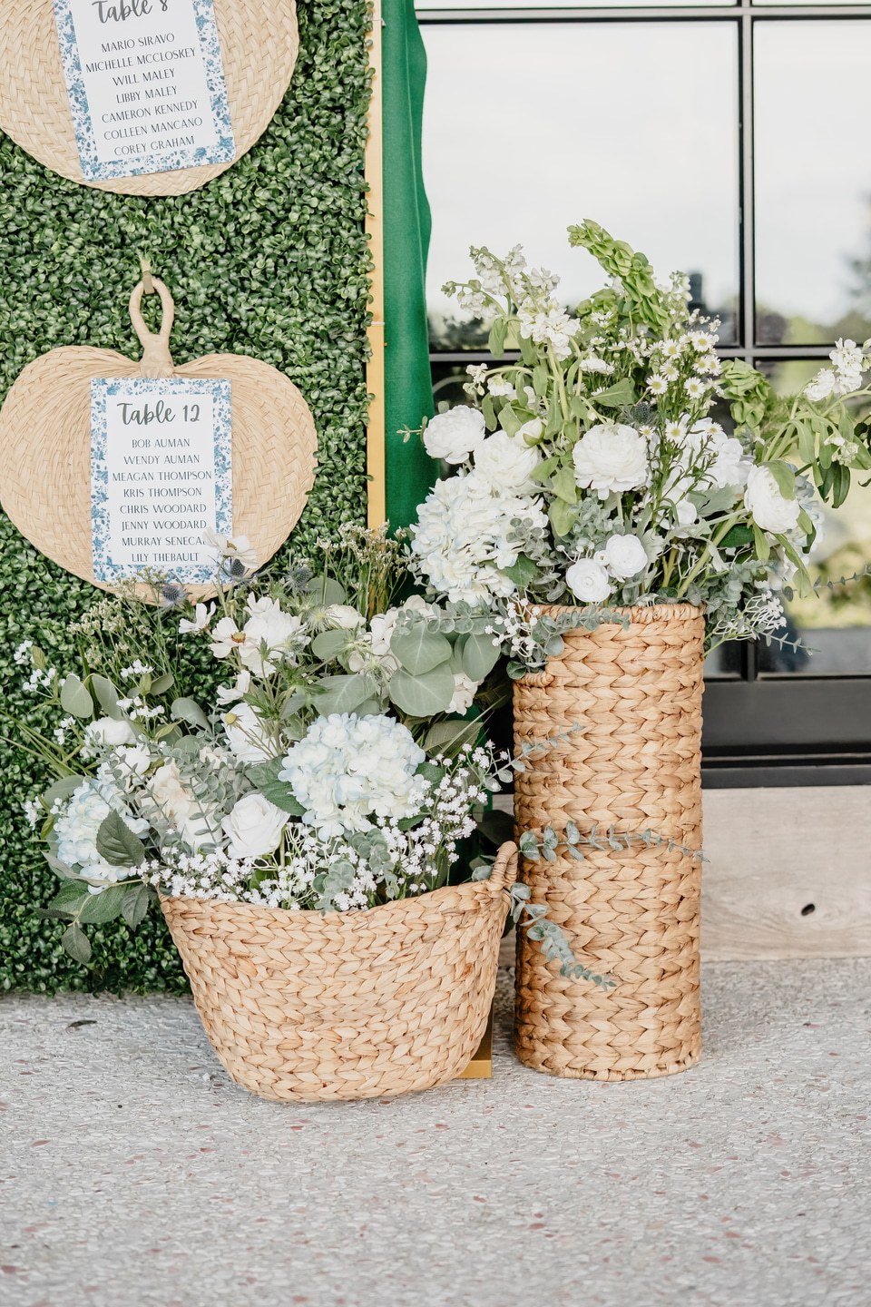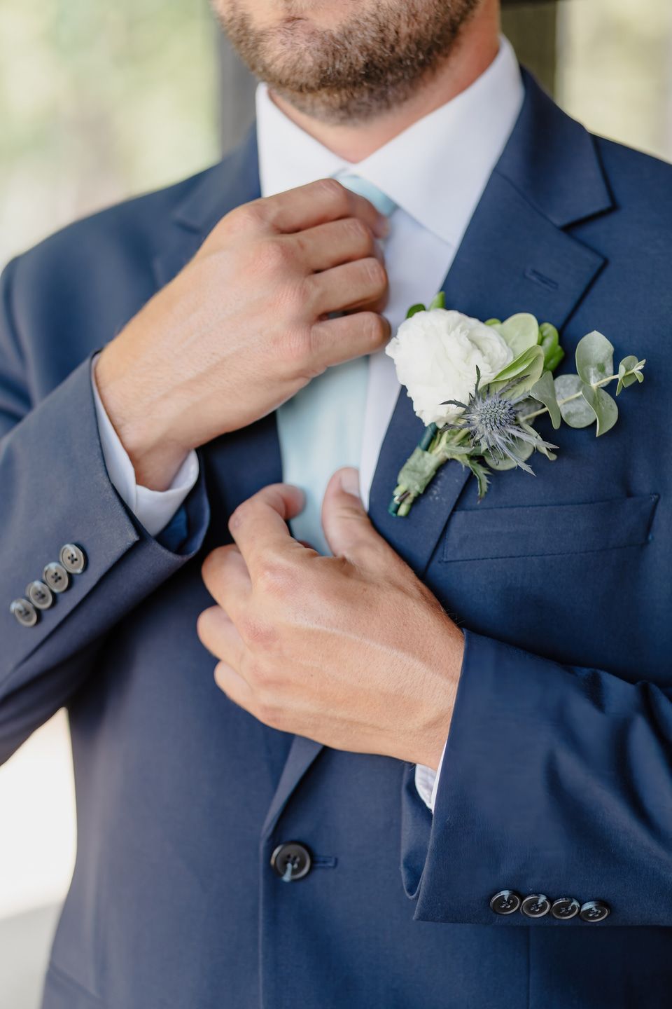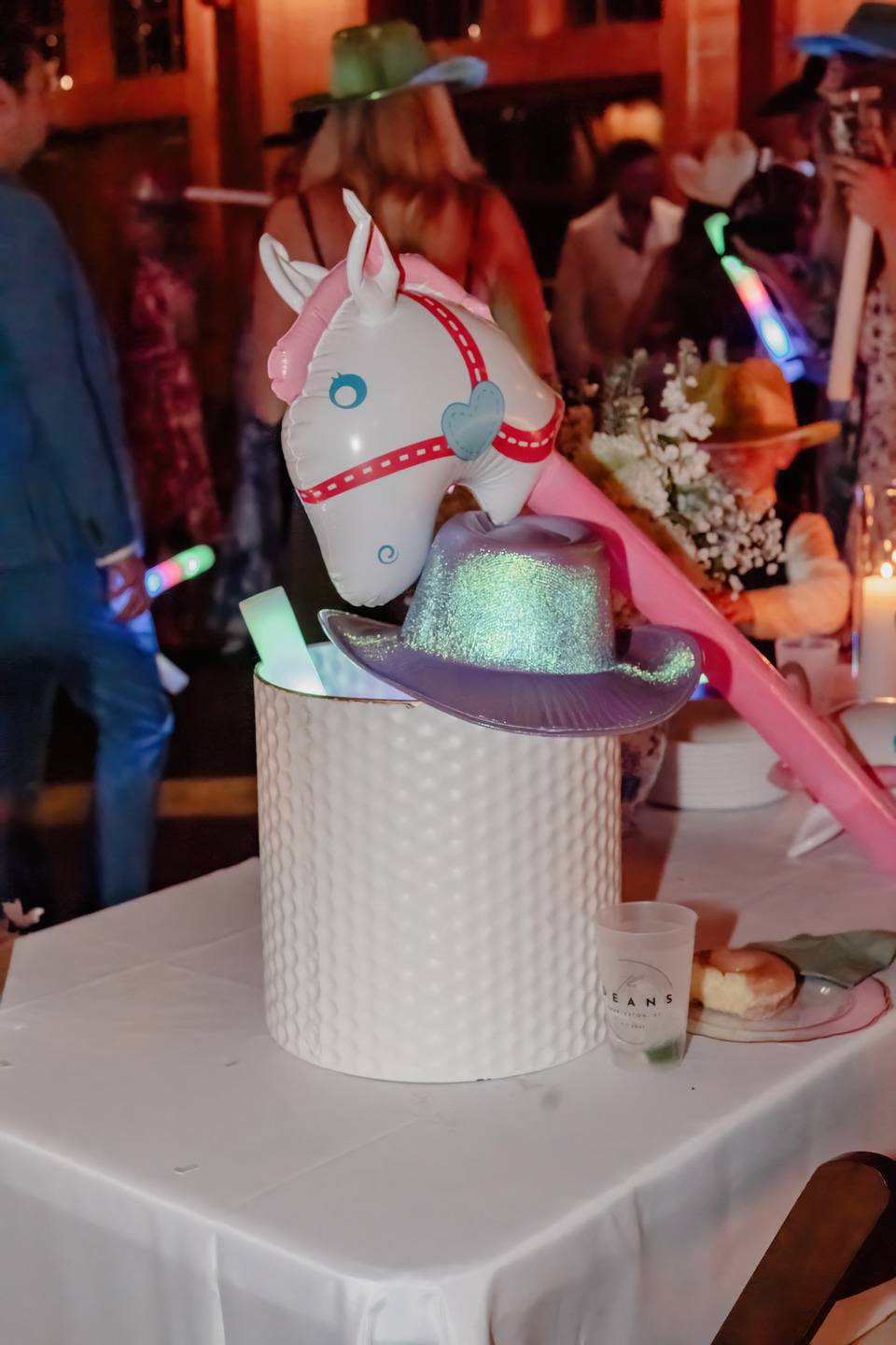 The bridal party was a graceful study in coordinated hues, with bridesmaids dressed in shades of blue from pale powder to deep navy. Their bouquets were filled with hydrangeas, baby’s breath, and eucalyptus, creating a soft and romantic harmony. Morgan wore a strapless gown of pristine white, flowing in timeless elegance. Kraig brought a touch of personal charm with his navy suit and cowboy hat, his boutonnière of white rose and thistle tied together with sprigs of eucalyptus.