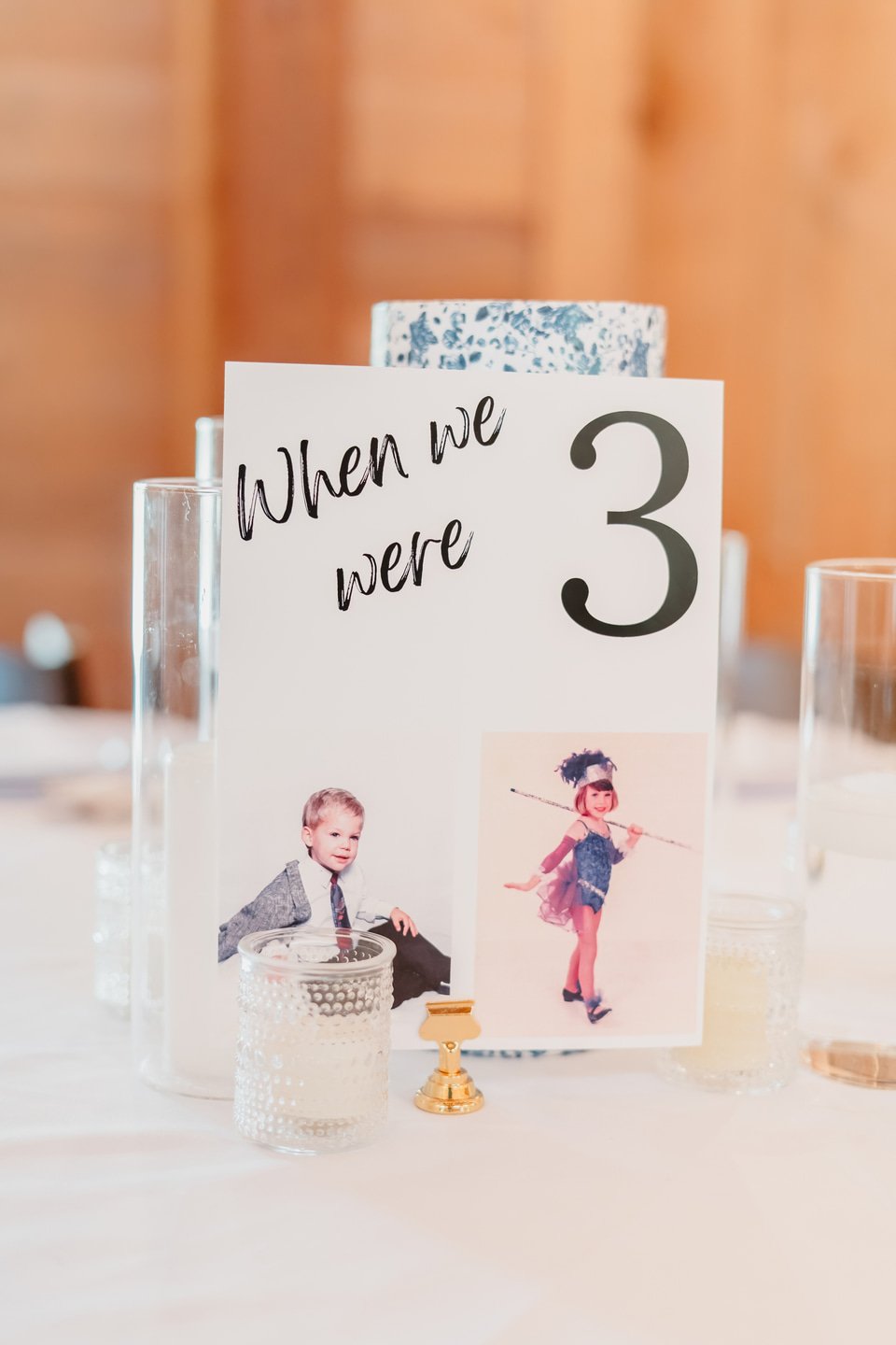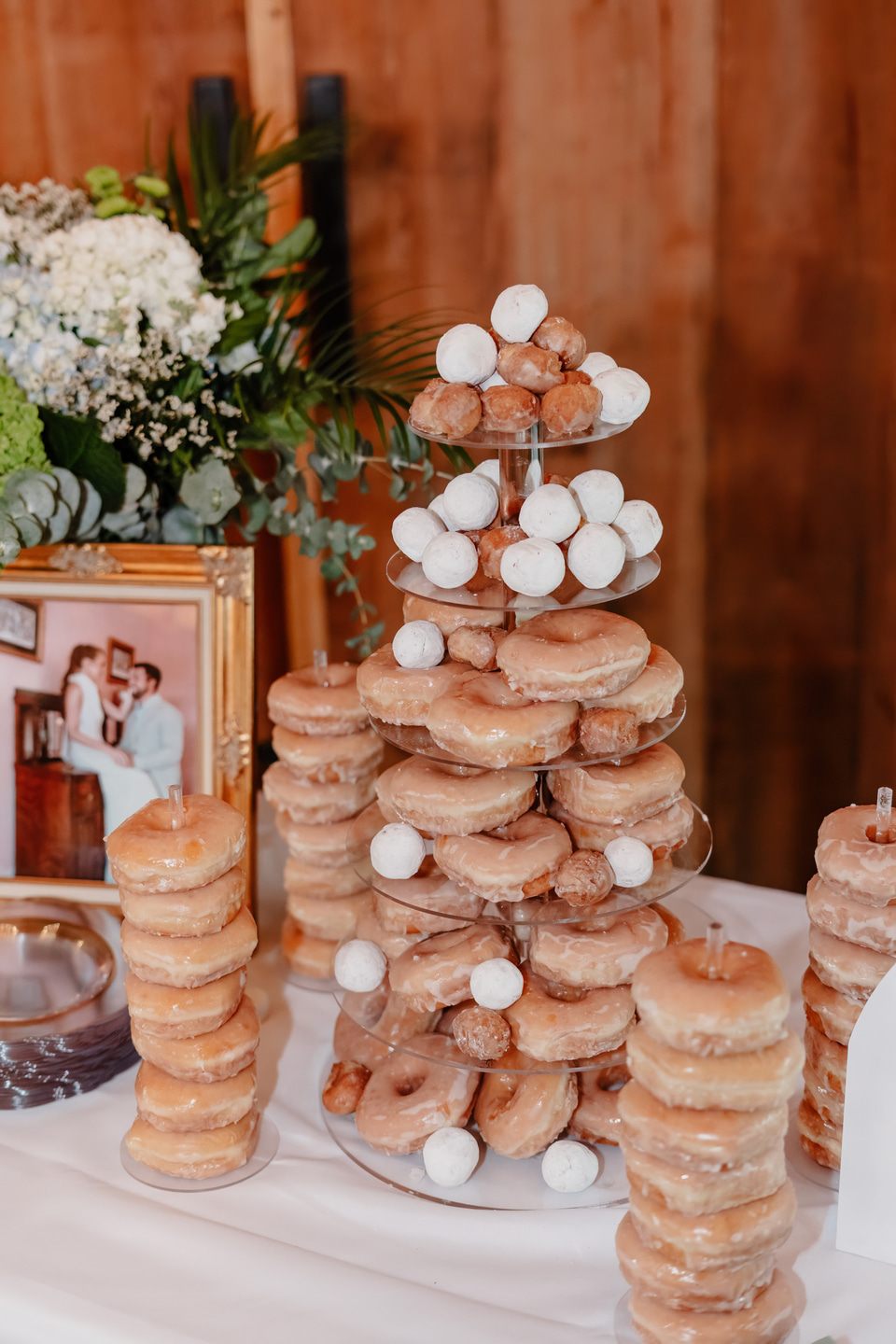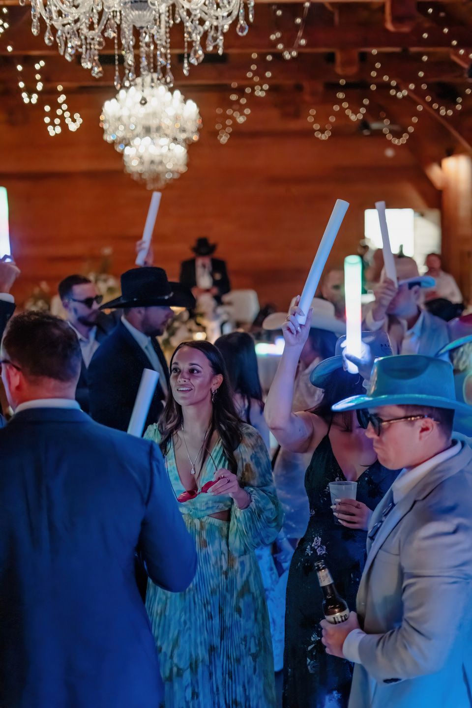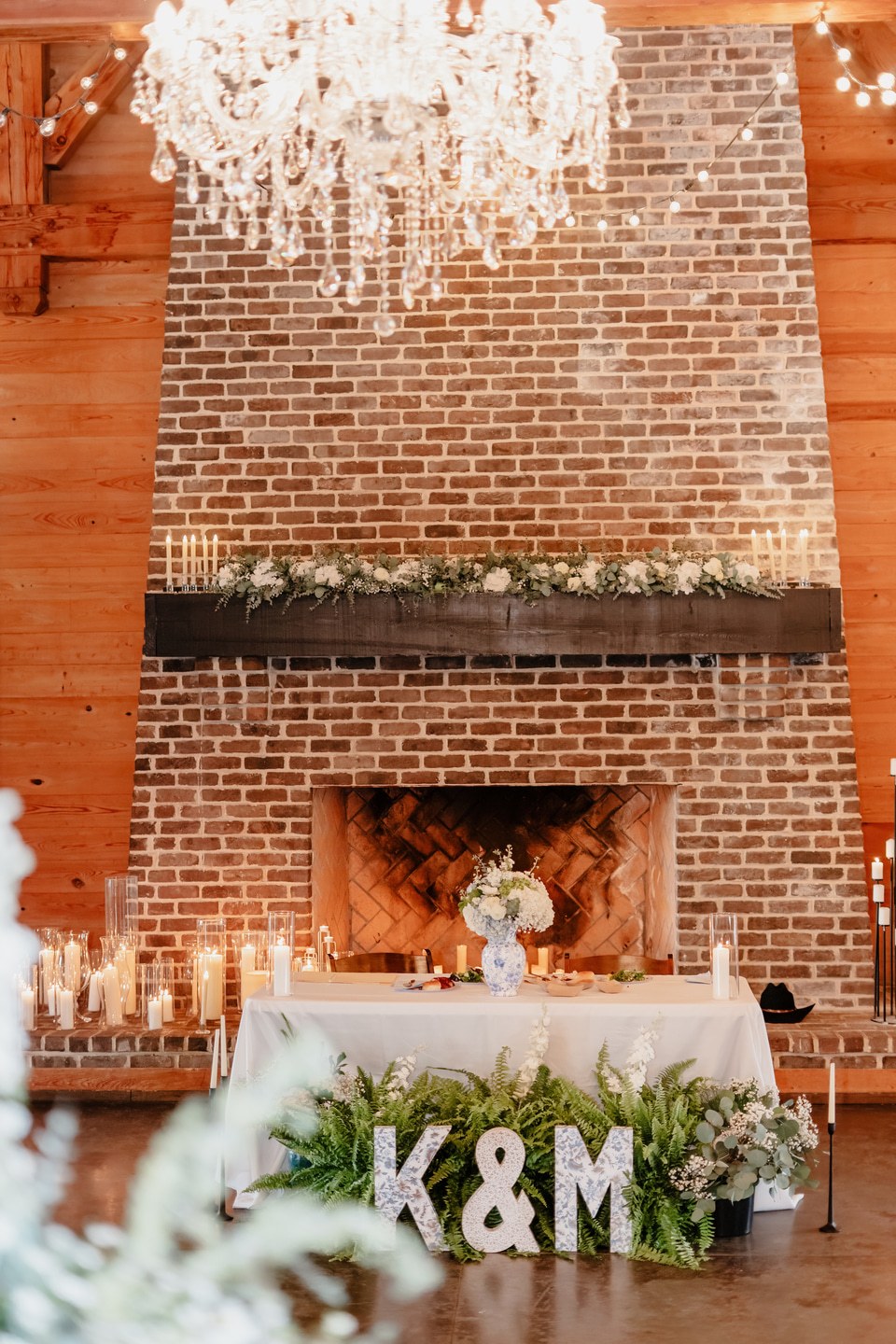 Their ceremony took place lakeside, where a fountain sparkled against the forested backdrop and a circular brick platform held rows of white chairs. Ferns and greenery surrounded the pergola, softening the space with organic beauty. As evening descended, the barn-style venue glowed with chandeliers and string lights. Tables were adorned with personalized touches, including childhood photographs that reflected the couple’s journey. Guests danced beneath the chandeliers, waving glowing light sticks as laughter and music filled the night.