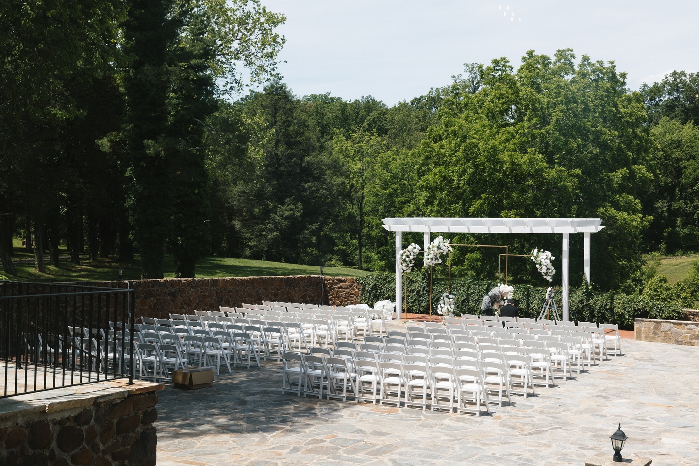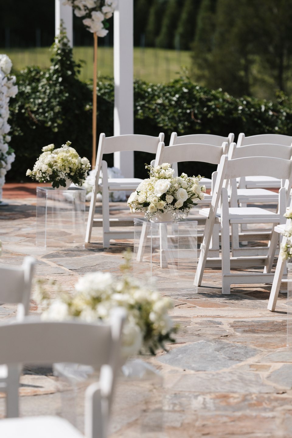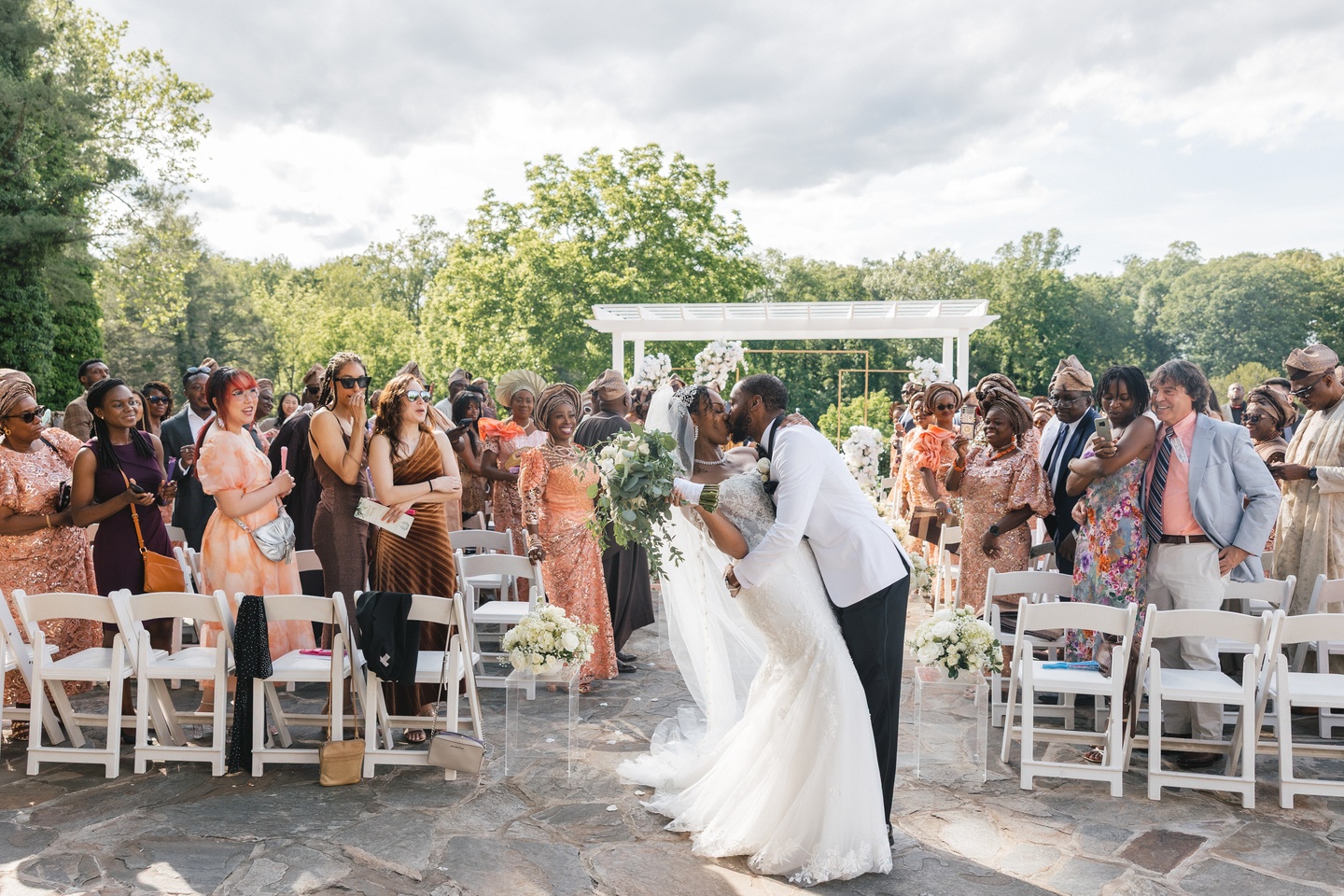 Olabisi and Rhondy’s May wedding at Poplar Springs Manor unfolded like a romantic summer dream, set against lush greenery and the manor’s timeless stone architecture. The ceremony embraced a classic white and green palette, with a beautifully adorned pergola of cascading hydrangeas and roses by Garden of Eden International. Clear acrylic stands added a modern, airy touch, while white chairs framed the stone patio for an intimate exchange of vows.
