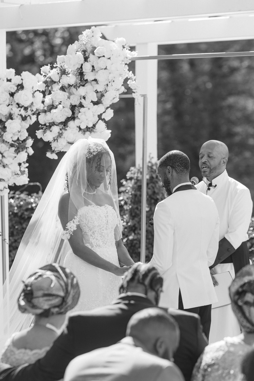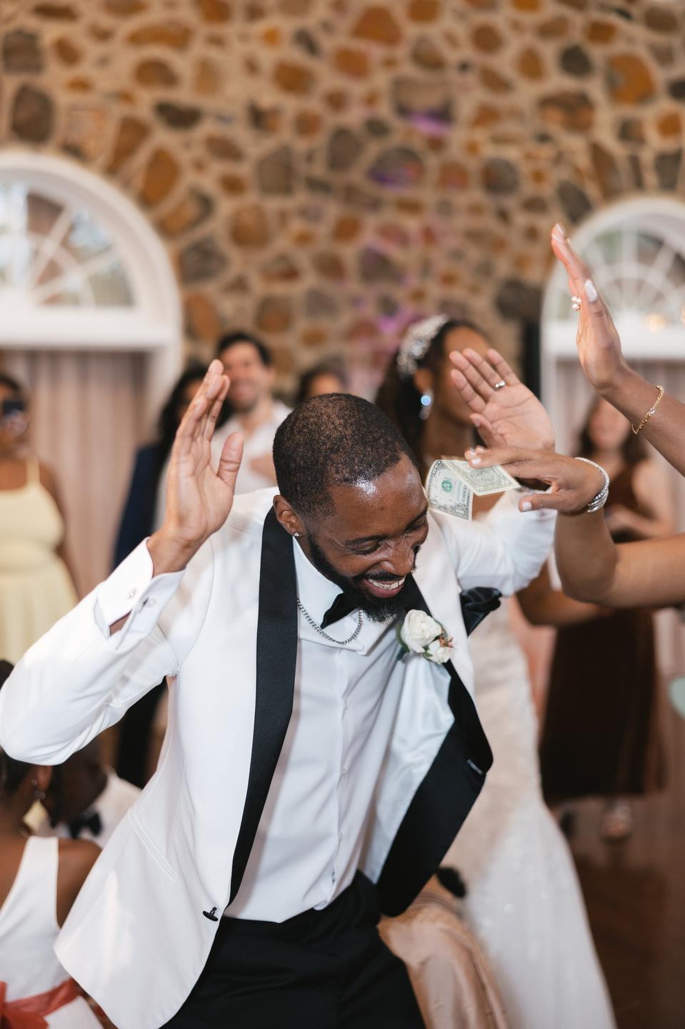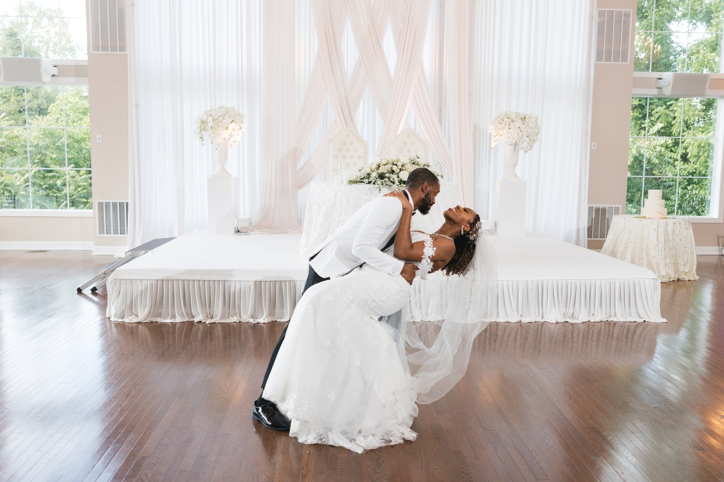 Olabisi and Rhondy’s May wedding at Poplar Springs Manor unfolded like a romantic summer dream, set against lush greenery and the manor’s timeless stone architecture. The ceremony embraced a classic white and green palette, with a beautifully adorned pergola of cascading hydrangeas and roses by Garden of Eden International. Clear acrylic stands added a modern, airy touch, while white chairs framed the stone patio for an intimate exchange of vows.