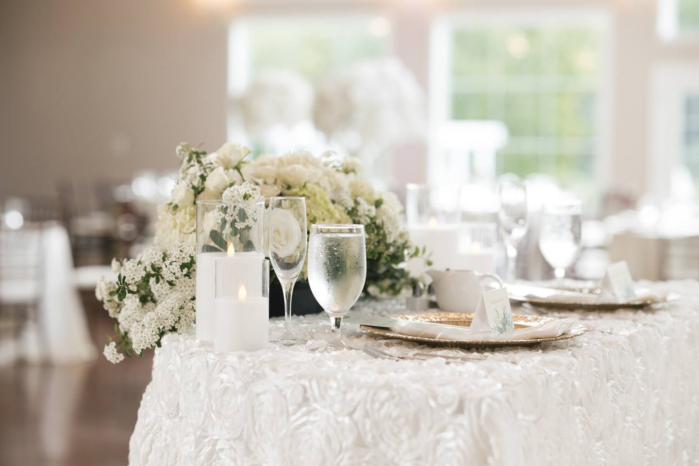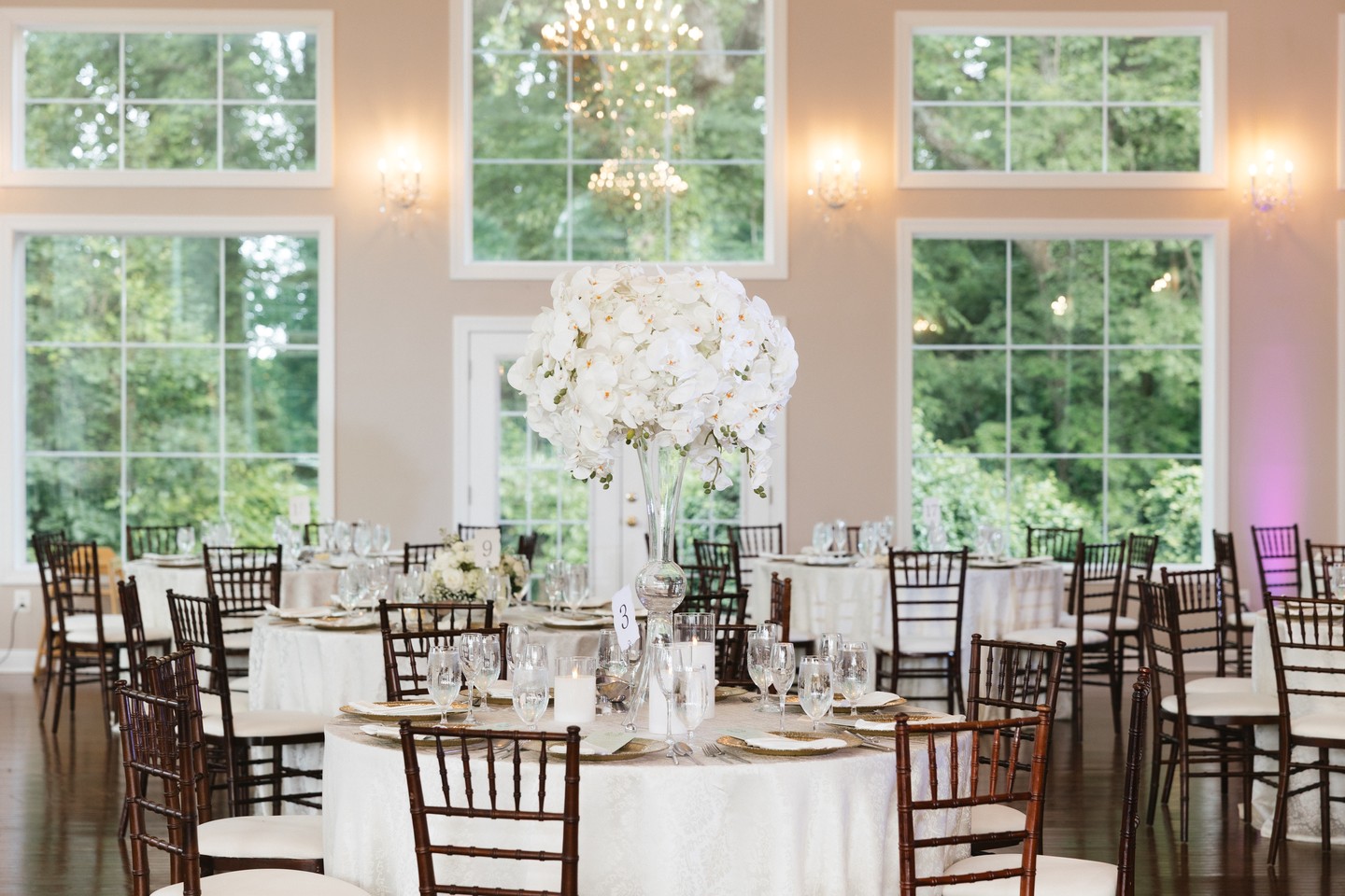 Inside the light-filled reception space, floor to ceiling windows revealed sweeping views of the surrounding landscape. Tables were dressed in textured white linens, gold-rimmed chargers, and tall, elegant floral centerpieces, creating a refined atmosphere softened by candlelight. A stunning white cake accented with gold leaf by The Conche Chocolate & Cake Studio stood as a sweet focal point, complemented by decadent treats from Edibles Incredible Desserts. Gala Cuisine served a feast that paired beautifully with the evening’s joyful energy, while DJ Flowtunes and DJ TeeCee kept the dance floor vibrant.