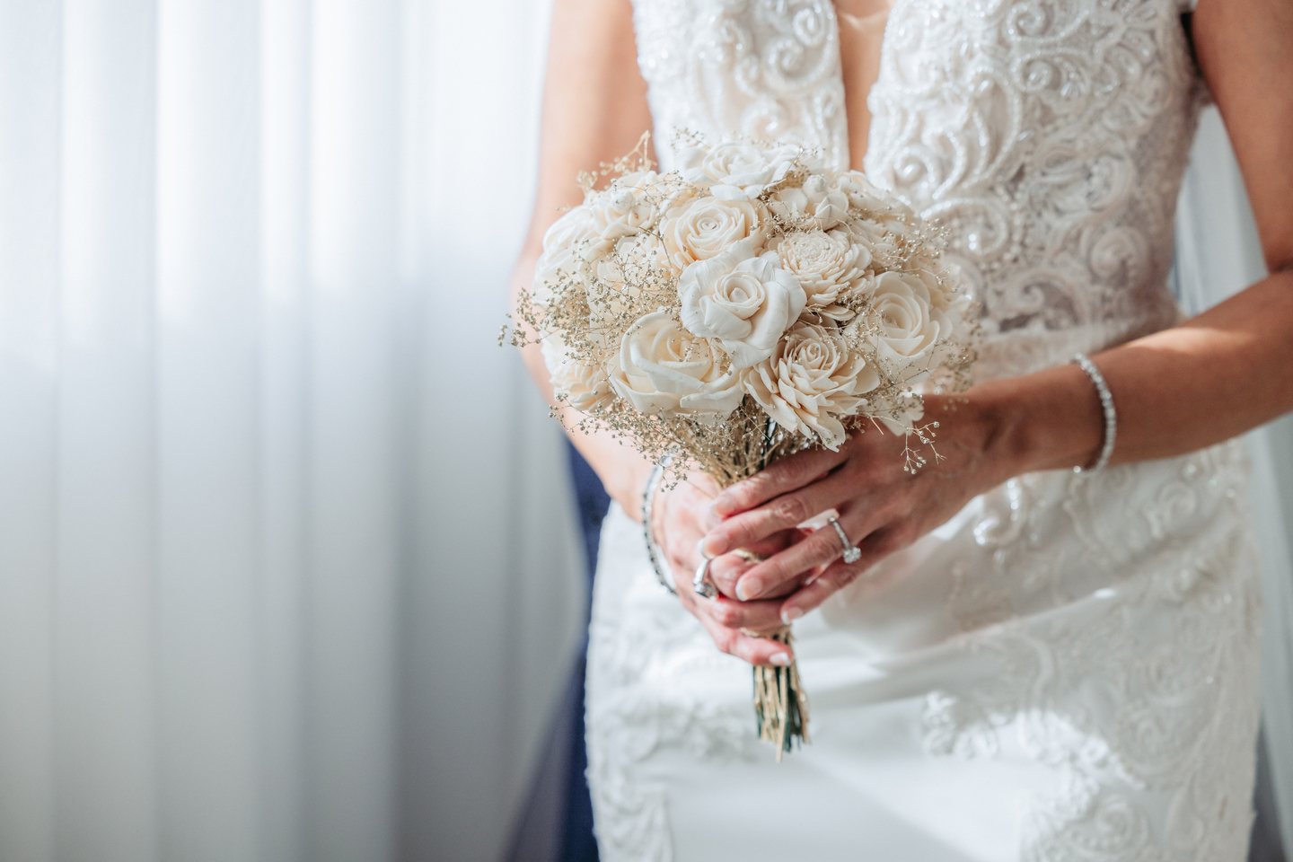 Within Brentsville Hall’s contemporary barn setting, Gail and Curtis’s November ceremony unfolded beneath soaring timber trusses and a magnificent crystal chandelier that sparkled like captured starlight against the rustic ceiling. The couple chose a sophisticated navy and gold palette that brought refined elegance to the day, effortlessly blending modern touches with the warmth of a fall celebration.