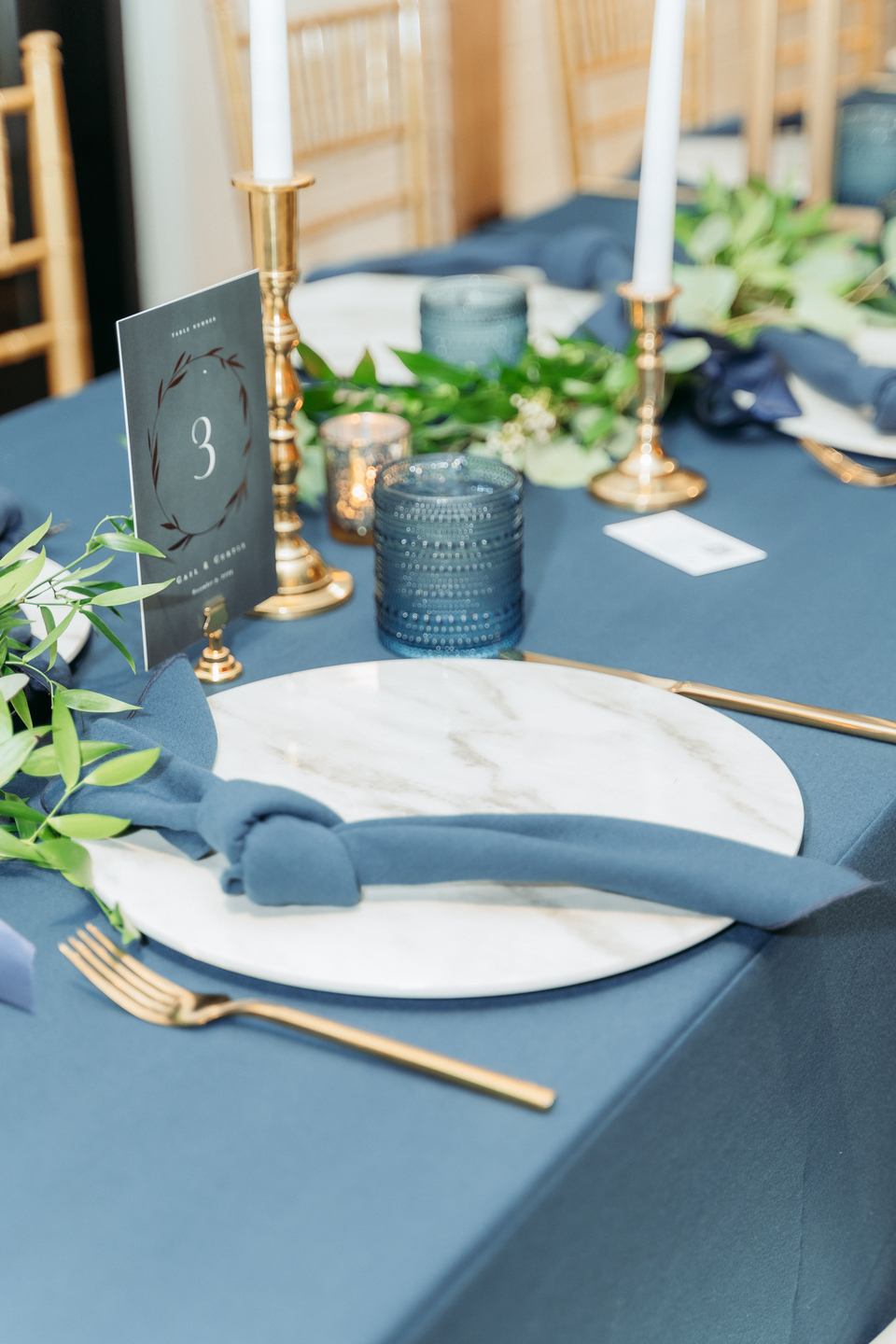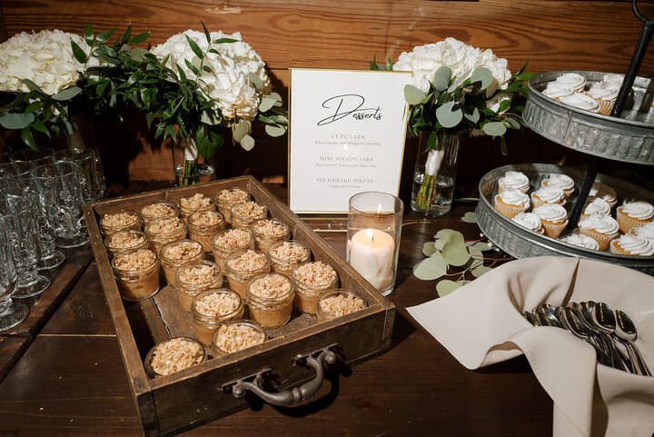 The reception carried the same sense of sophistication. Tables were dressed in deep navy linens and accented with gleaming gold flatware, candlesticks, and charger plates. Centerpieces featured lush arrangements of white and purple florals trailing with greenery—each table a romantic vignette set against the barn’s warm, glowing ambiance. A stunning cake adorned with fresh berries, created by Cakes by Marium, served as a sweet highlight of the evening. Guests toasted with joy and danced as dramatic purple and blue uplighting bathed the space in moody, romantic tones. Snap n’ Share’s photo booth added a fun, interactive element, while Artsy Ervin delighted guests with live illustrations, gifting them custom keepsakes to remember the night.