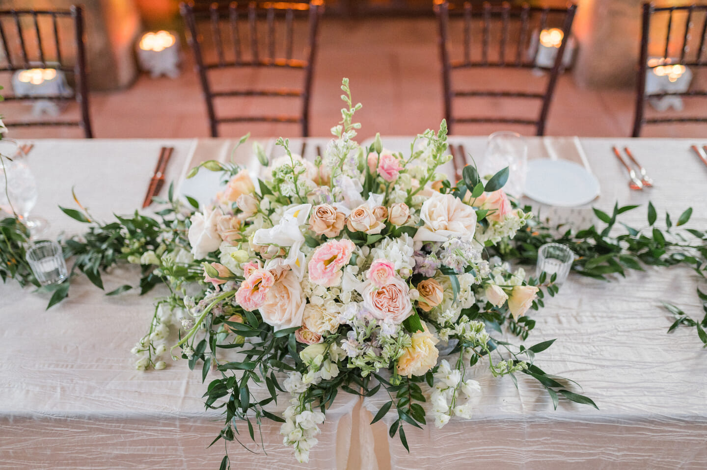 For the reception, Dover Hall’s opulent interior was reimagined with ivory linens, glowing candlelight, and textural details that balanced refinement with warmth. Low centerpieces of blush and champagne roses, ivory lisianthus, and trailing smilax added natural romance, complemented by floating candles and gold-framed table numbers. The sweetheart table, set before the grand fireplace and draped in garlands of pink and cream blooms, formed a breathtaking focal point of the evening. Guests dined on a seasonal menu prepared by Dover Hall’s culinary team, while Rhythm of Love kept spirits high well into the night. Brittany Lowe Photography portrayed the celebration with refined artistry, highlighting both the grandeur of the hall and the genuine affection that filled it.