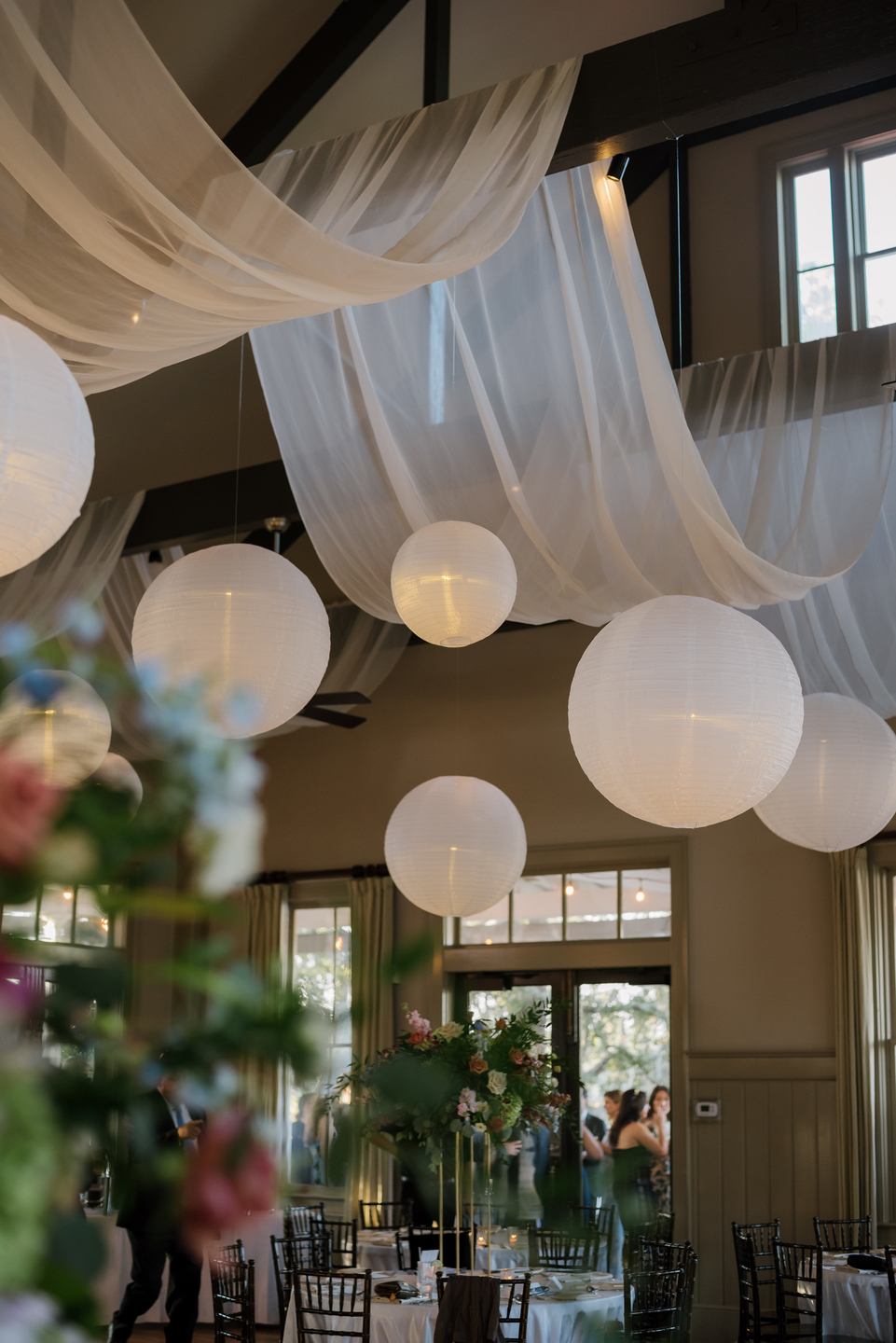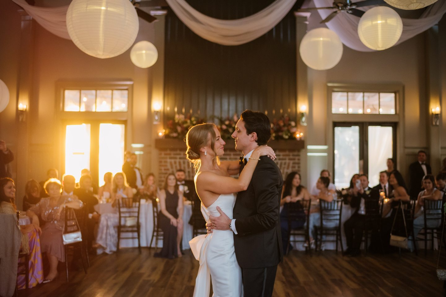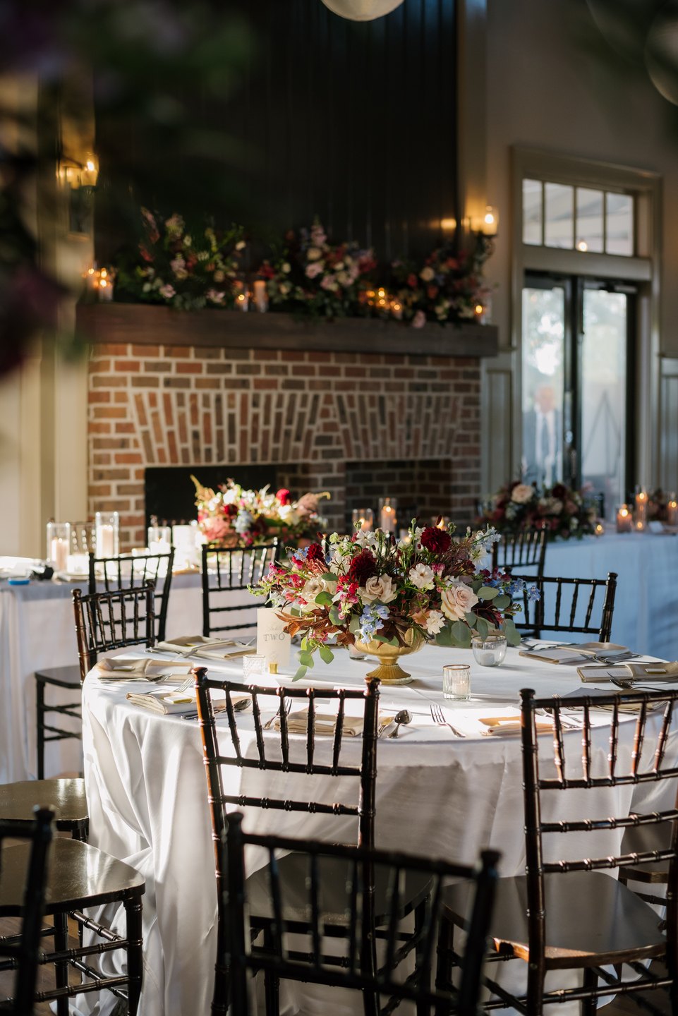 As the sun dipped lower, the celebration moved indoors, where Peper Events curated a reception steeped in autumnal elegance. The Creek Club’s exposed brick and soaring beamed ceilings became a canvas for cascading blooms of burgundy dahlias, champagne roses, and dusty miller arranged in golden compotes, set against crisp white linens and elegant Chiavari chairs. Ethereal paper lanterns and fabric swags suspended from the beams cast a dreamy glow over the hardwood floors, where Ellie and John shared their first dance as golden light poured through tall windows.