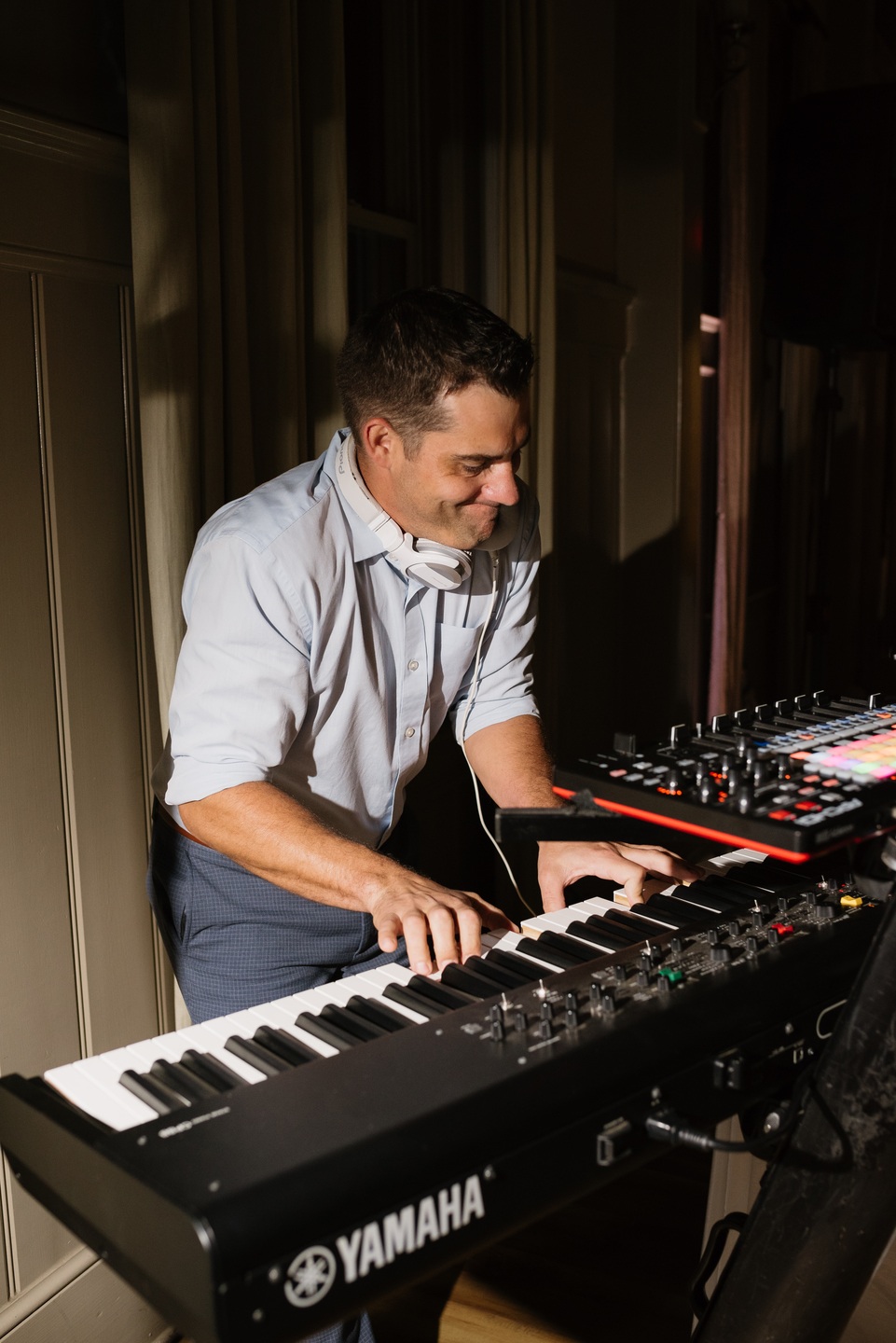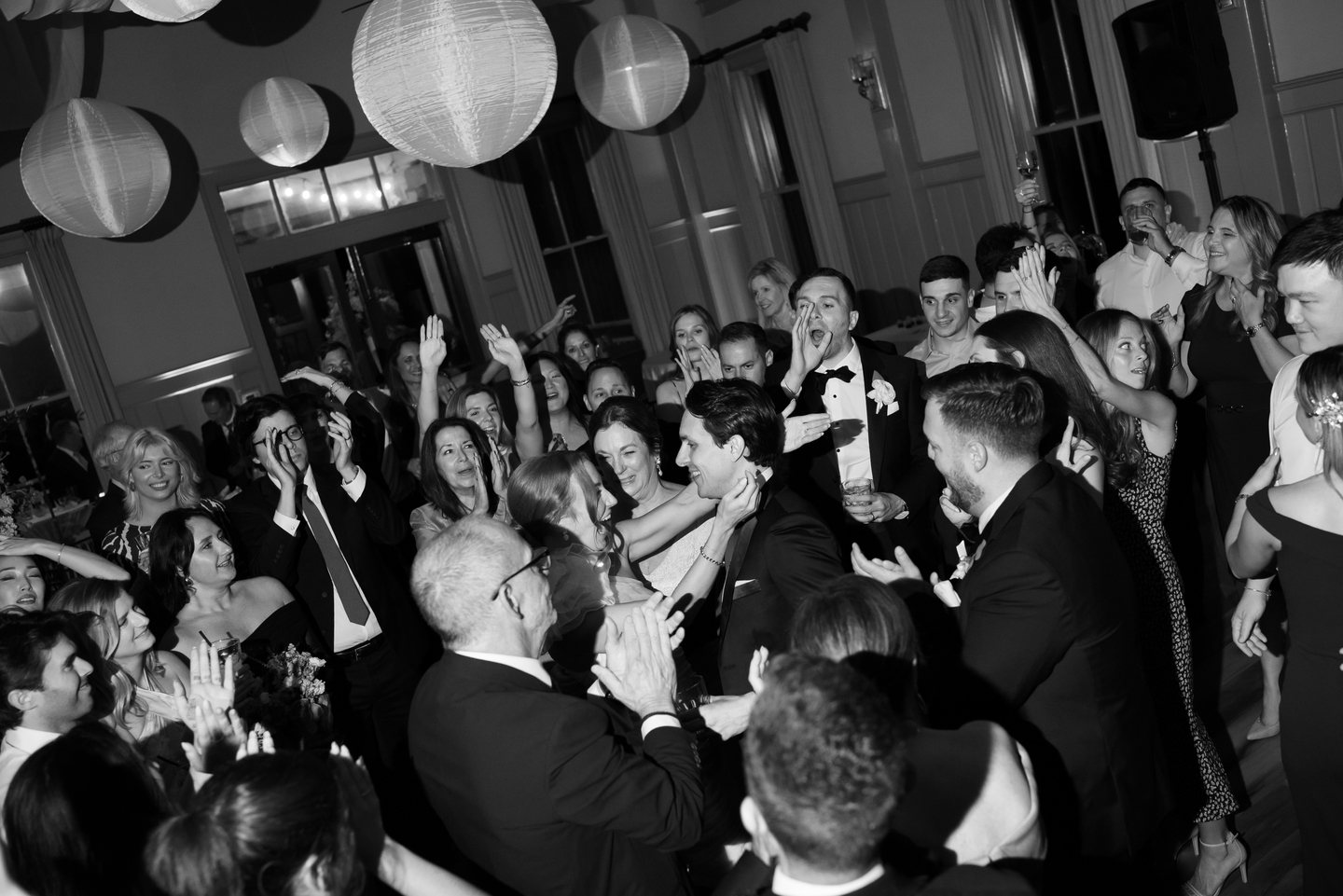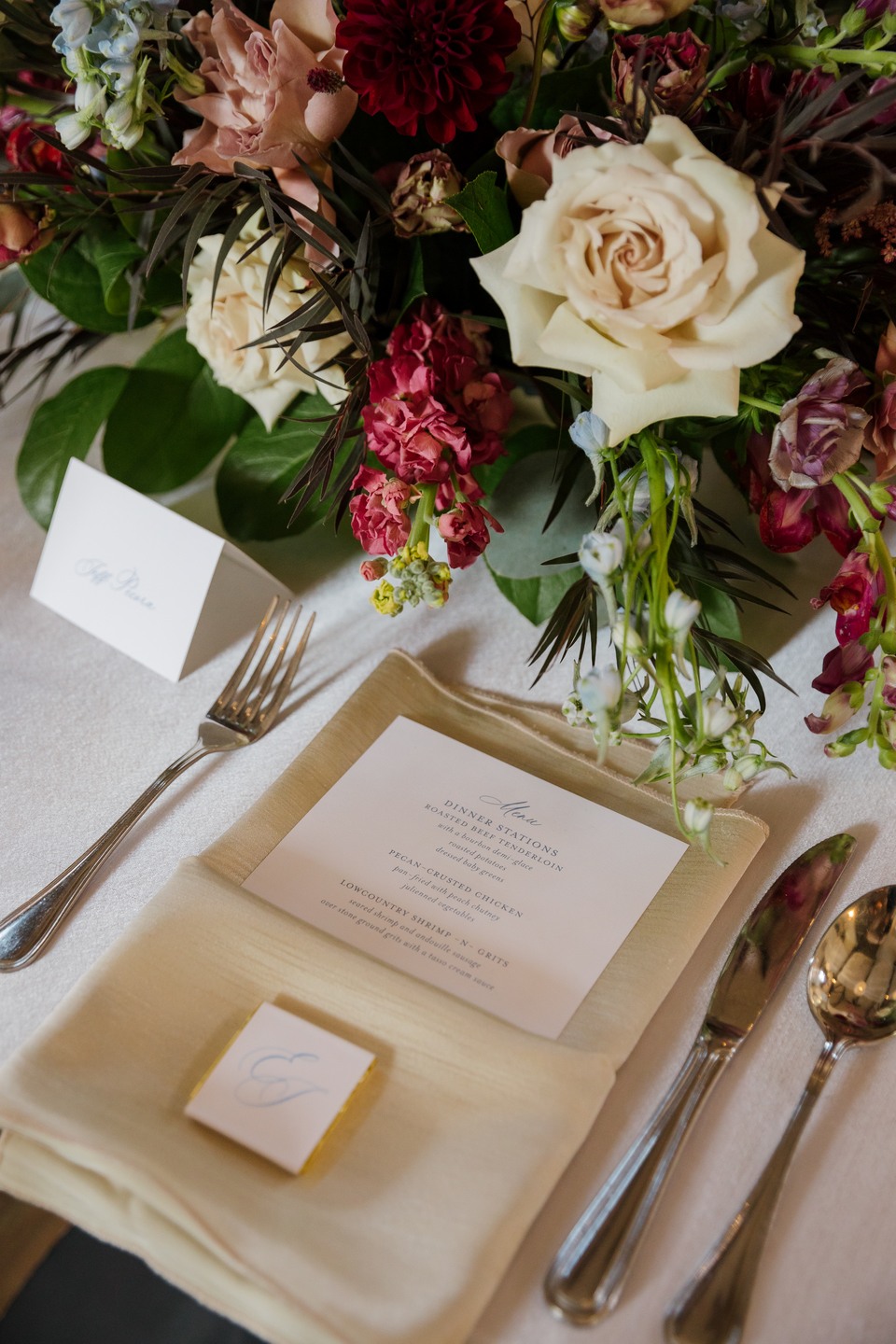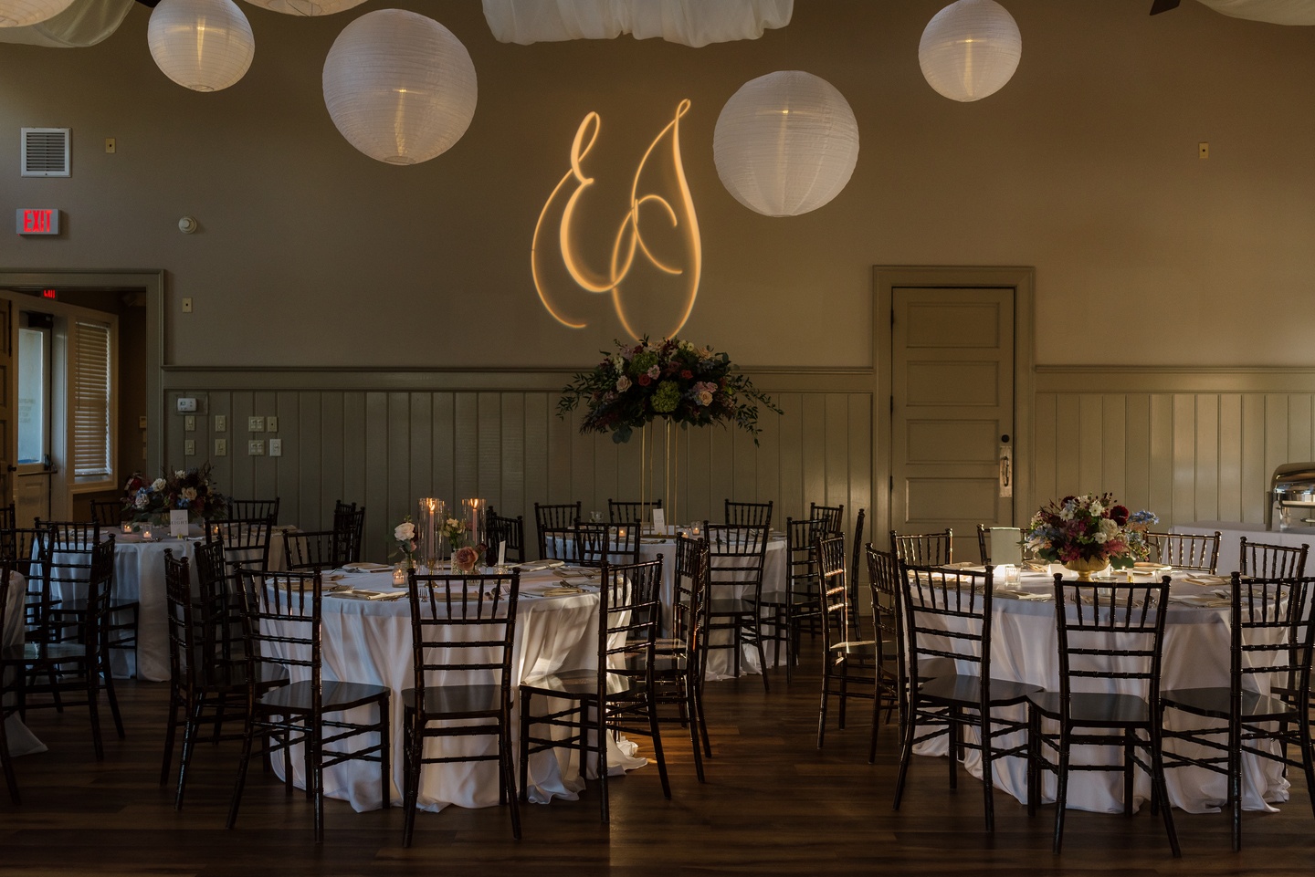As the sun dipped lower, the celebration moved indoors, where Peper Events curated a reception steeped in autumnal elegance. The Creek Club’s exposed brick and soaring beamed ceilings became a canvas for cascading blooms of burgundy dahlias, champagne roses, and dusty miller arranged in golden compotes, set against crisp white linens and elegant Chiavari chairs. Ethereal paper lanterns and fabric swags suspended from the beams cast a dreamy glow over the hardwood floors, where Ellie and John shared their first dance as golden light poured through tall windows.