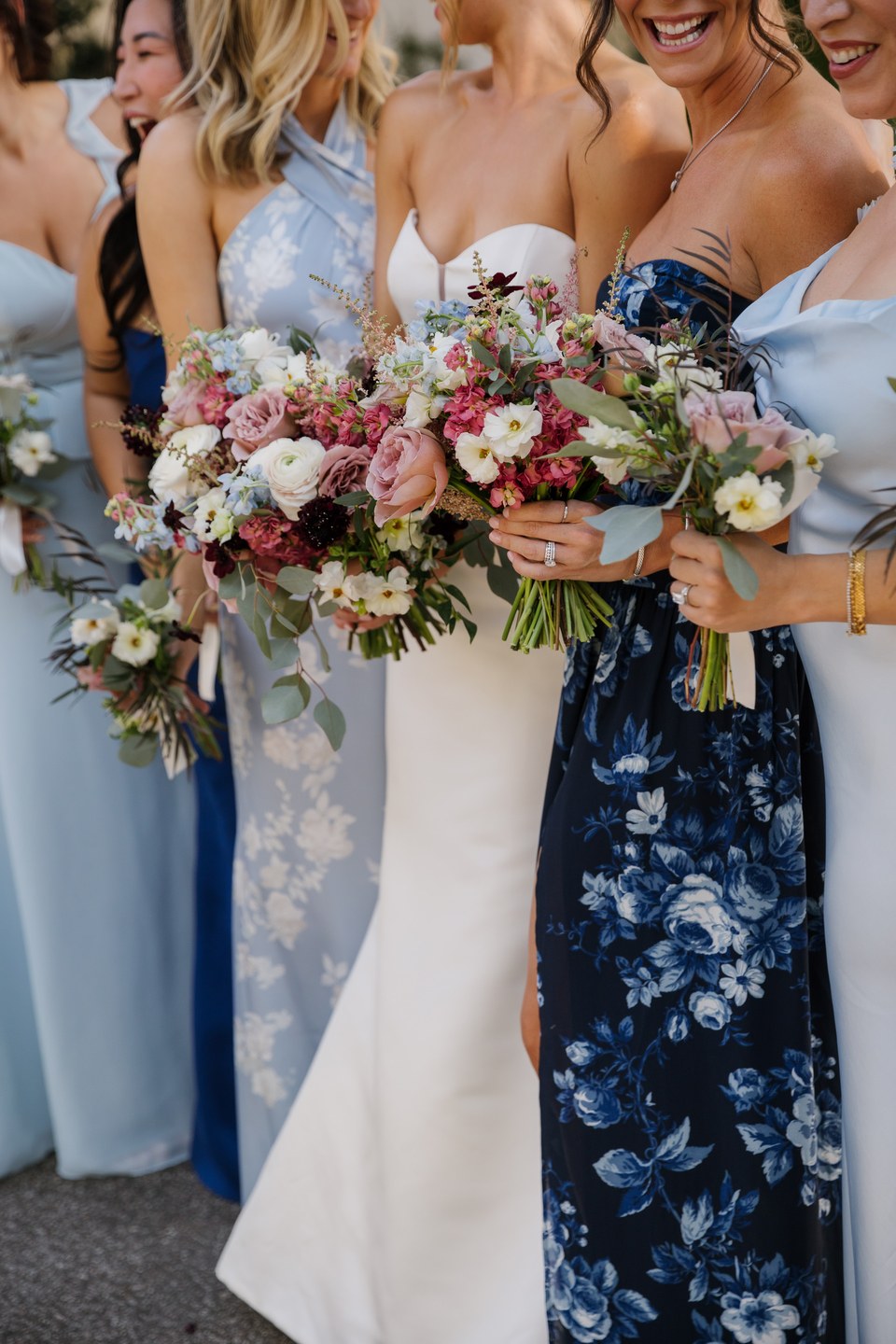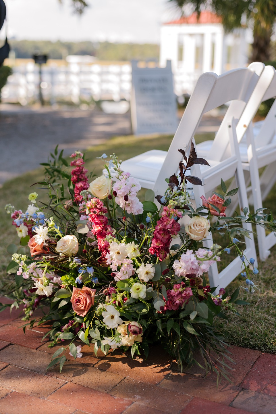 Fresh Weddings & Events transformed the ceremony space with lush arrangements of roses, dahlias, and delicate wildflowers, filling every corner with vibrant color and natural texture. Guests gathered along a brick pathway lined with white chairs, where dramatic florals marked the aisle. Ren Photography’s editorial eye brought the atmosphere to life, capturing the romance of the day in luminous detail.