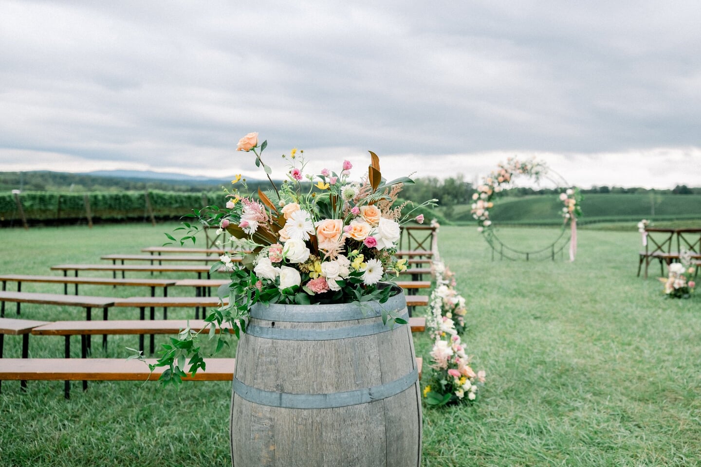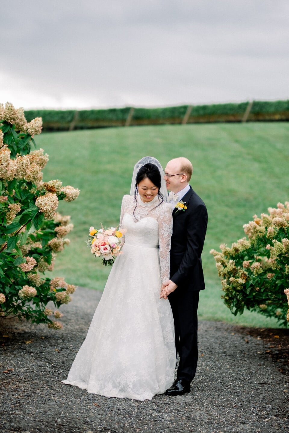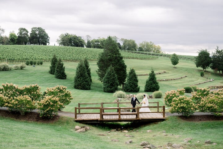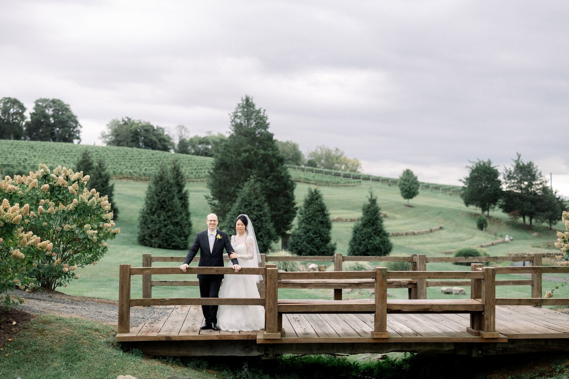 Shuo and John celebrated their September wedding at Stone Tower Winery, where soft overcast skies cast a romantic glow across the vineyard estate. Rolling rows of grapevines and manicured grounds framed the day with understated Northern Virginia elegance. A delicate palette of blush, cream, and soft yellow carried through the design. Shuo’s bouquet featured roses in peach, yellow, and white, tied with a pale pink ribbon that echoed the celebration’s romantic tone. Throughout the property, vineyard rows and a charming wooden bridge provided picturesque settings for portraits and quiet moments together.