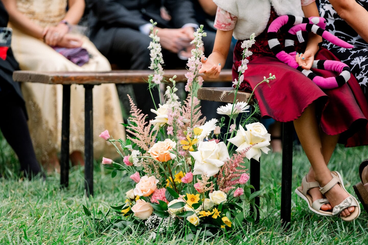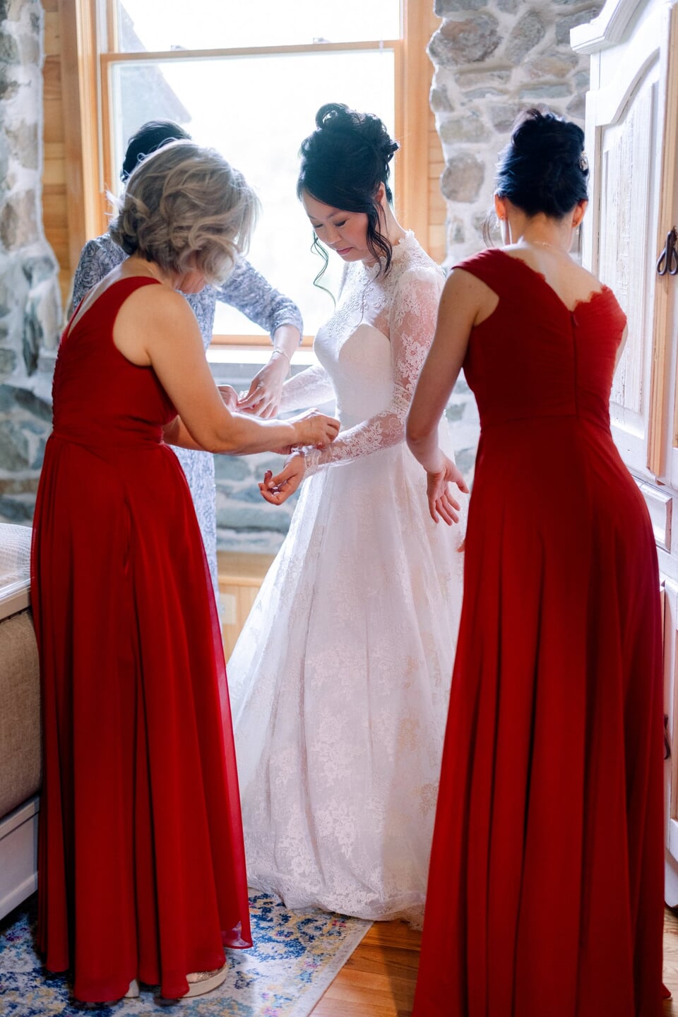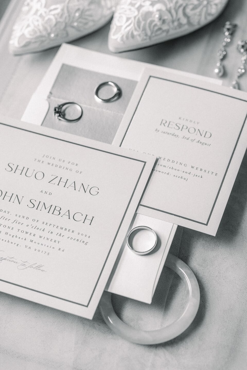 Shuo and John celebrated their September wedding at Stone Tower Winery, where soft overcast skies cast a romantic glow across the vineyard estate. Rolling rows of grapevines and manicured grounds framed the day with understated Northern Virginia elegance. A delicate palette of blush, cream, and soft yellow carried through the design. Shuo’s bouquet featured roses in peach, yellow, and white, tied with a pale pink ribbon that echoed the celebration’s romantic tone. Throughout the property, vineyard rows and a charming wooden bridge provided picturesque settings for portraits and quiet moments together.