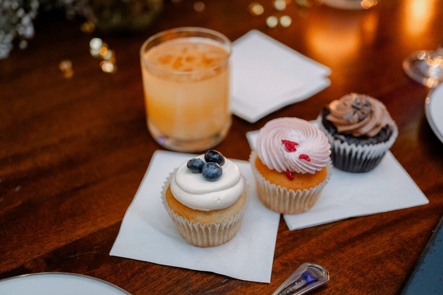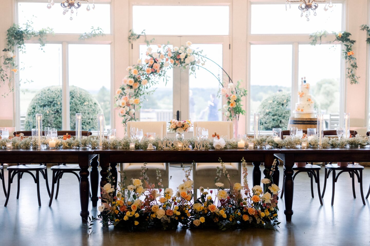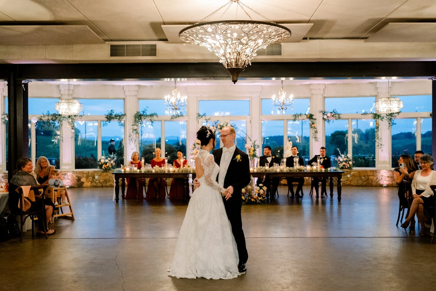 The reception unfolded inside the winery’s ballroom overlooking the vines. Tables were styled with baby’s breath runners and flickering candles, creating a soft ambiance, while a classic white cake by Fluffy Thoughts Cakes adorned with delicate sugar flowers served as a refined focal point.