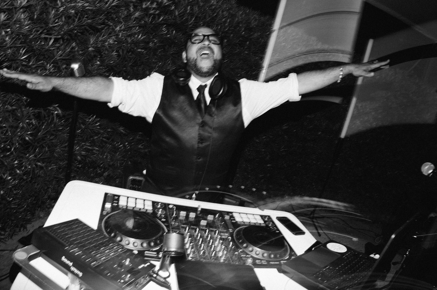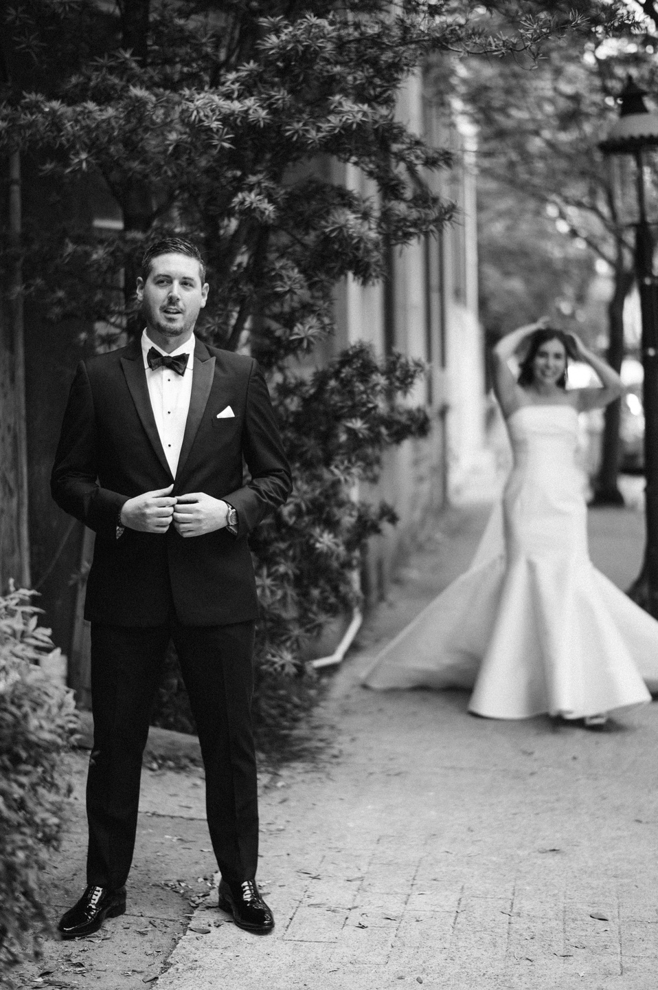 Guests then gathered in the courtyard garden, where a tented reception glowed beneath crystal chandeliers. Tables dressed in white linens and gold chiavari chairs were layered with peach and ivory florals, smoked glass votives, and floral china chargers, while lounge seating added a relaxed, elegant touch. As the evening unfolded, a DJ and live saxophonist brought an energetic close to the celebration, with the couple slipping away into Charleston’s storied streets for portraits that reflected the romance of the day.