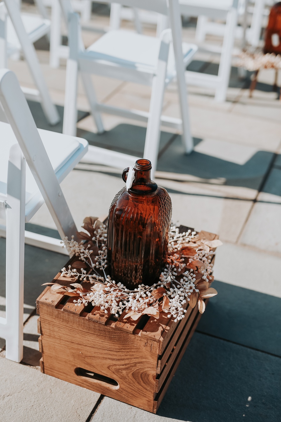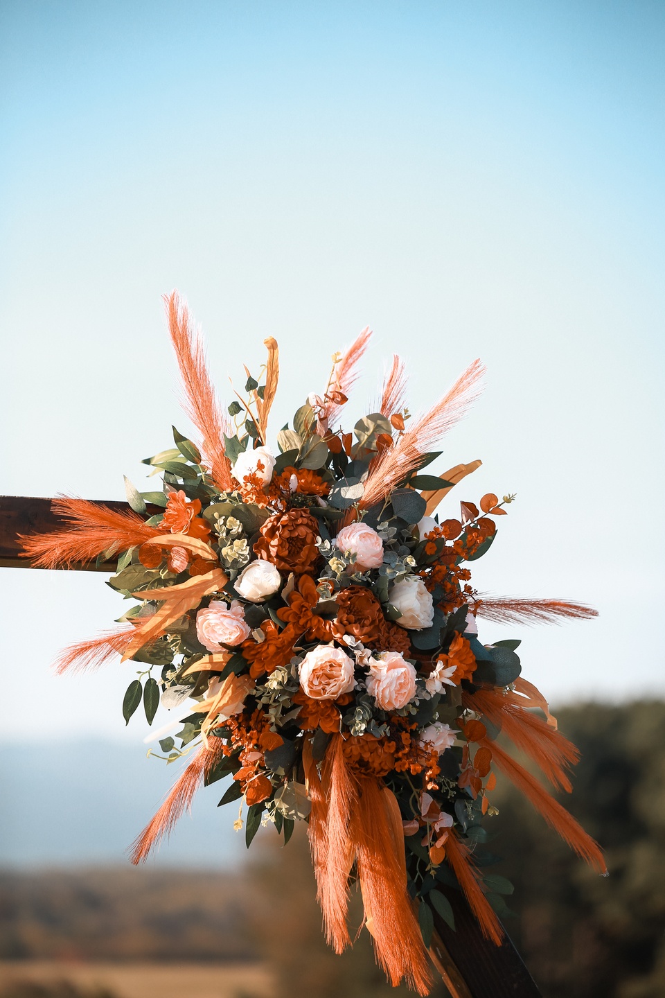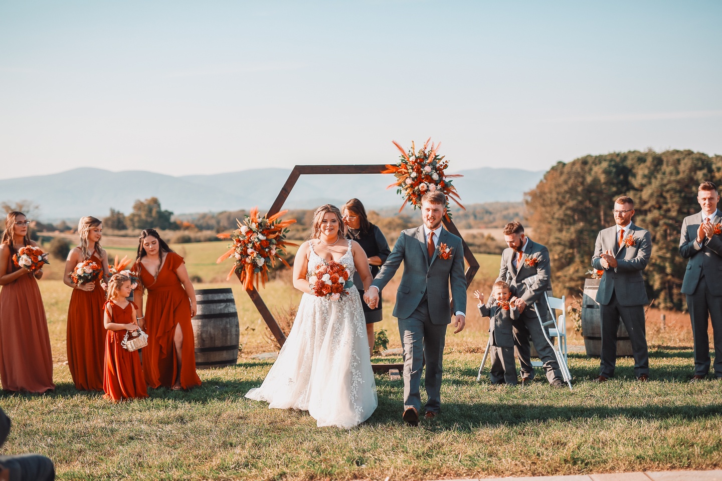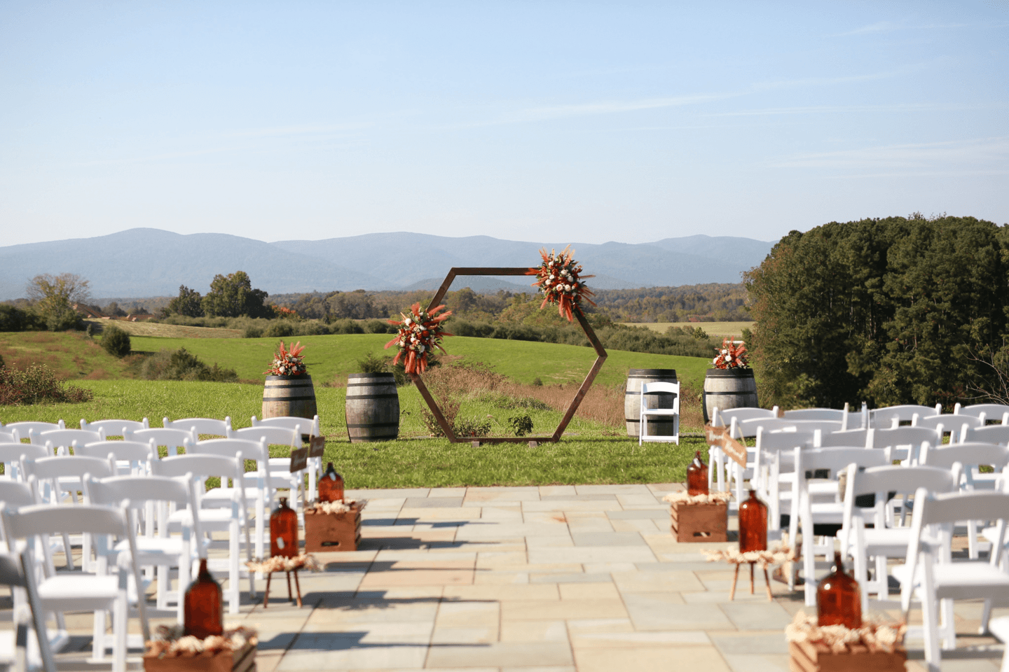 The ceremony unfolded beneath a wooden arch adorned with lush florals in deep orange and blush hues. Natalie carried a bouquet of dahlias, roses, and seasonal greenery—an elegant echo of the surrounding fall landscape. White chairs lined a stone pathway, flanked by rustic wooden barrels and golden fields that stretched toward the distant Blue Ridge Mountains, creating a scene of pure, natural romance.