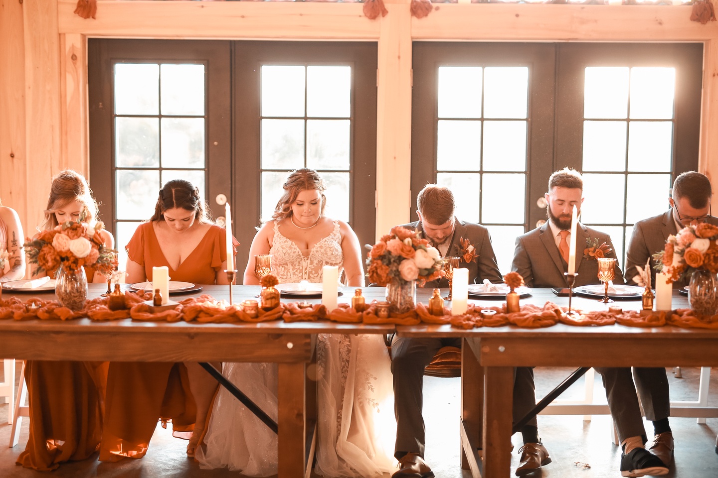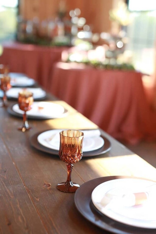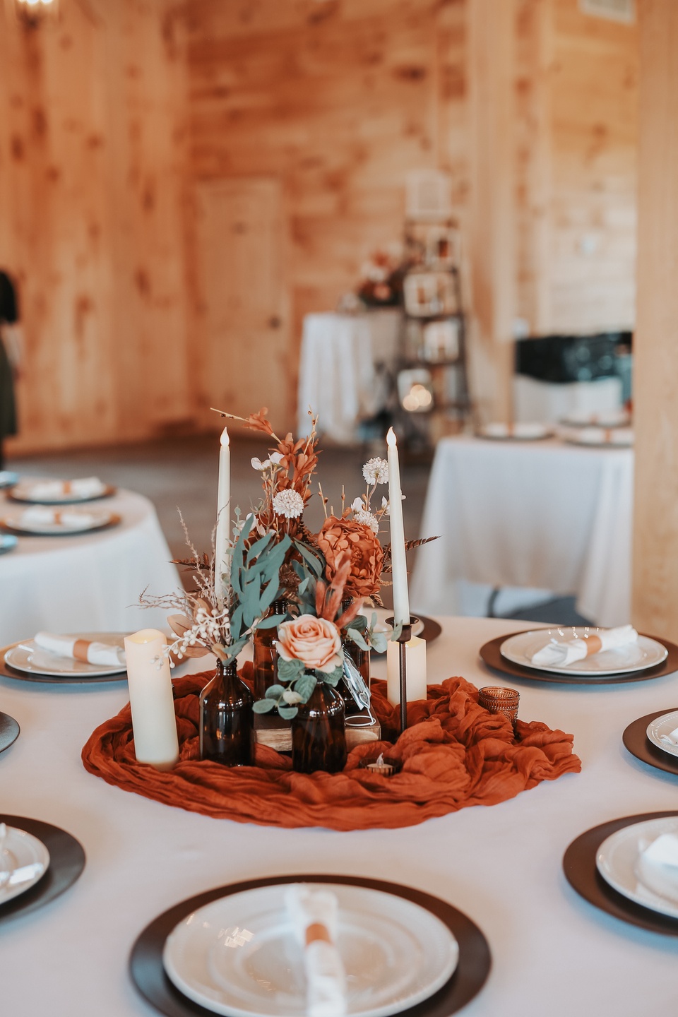 As the sun dipped below the hills, the celebration transitioned into a cozy, candlelit reception. Tables draped in burnt orange gauze set the stage for an evening of warmth and joy, with amber glass bottles holding delicate arrangements and taper candles flickering in the soft autumn air. Guests enjoyed a feast prepared by Fabio’s of Ruckersville, while Chelsi Breeden Photography preserved the day’s beauty through heartfelt imagery that reflected both the charm of the countryside and the emotion of the occasion.