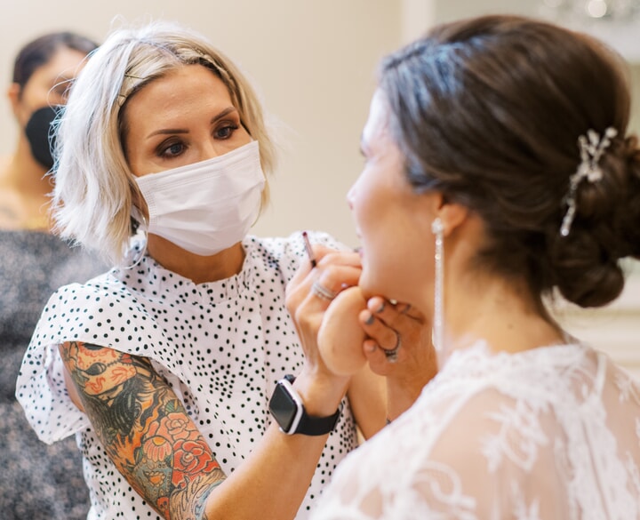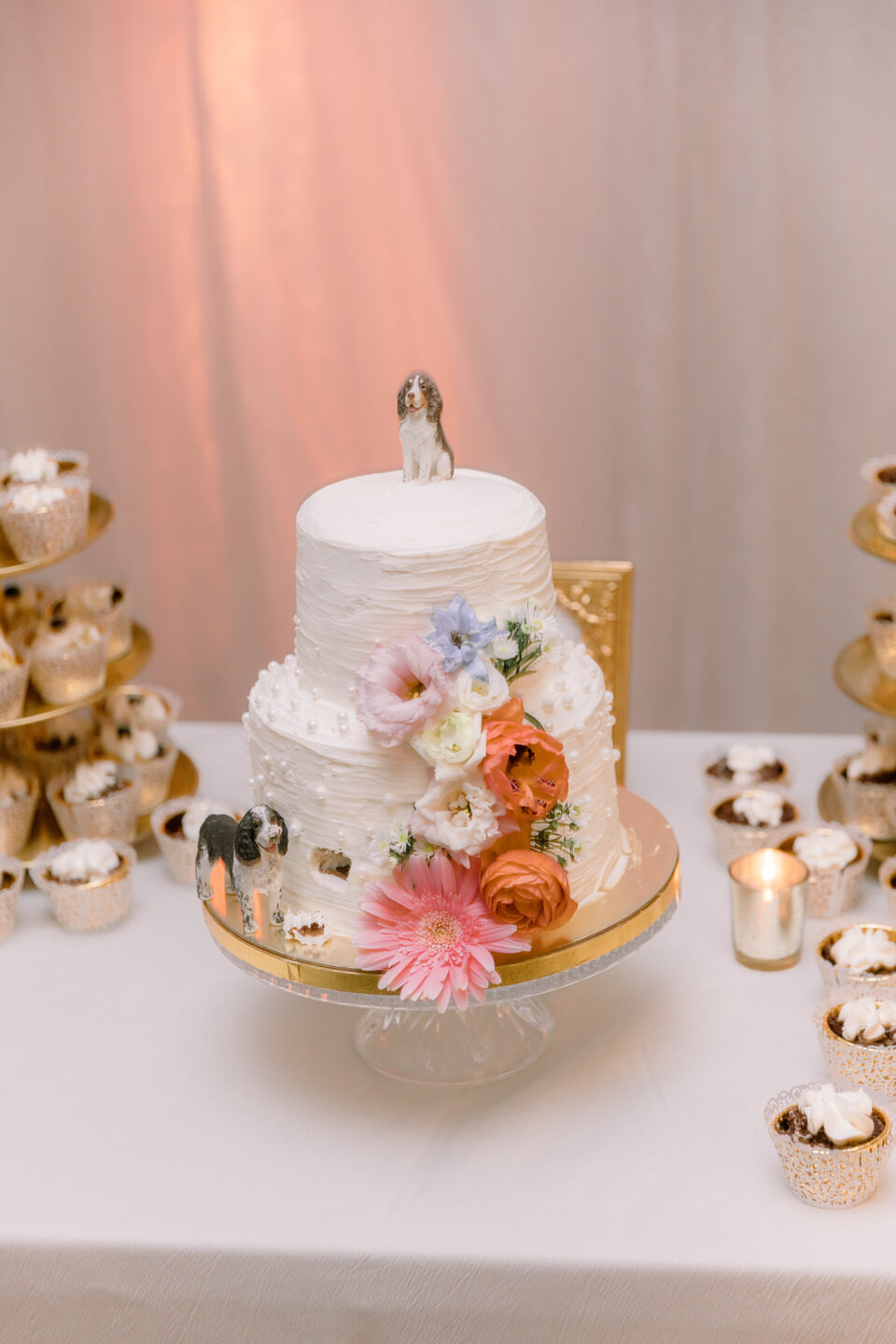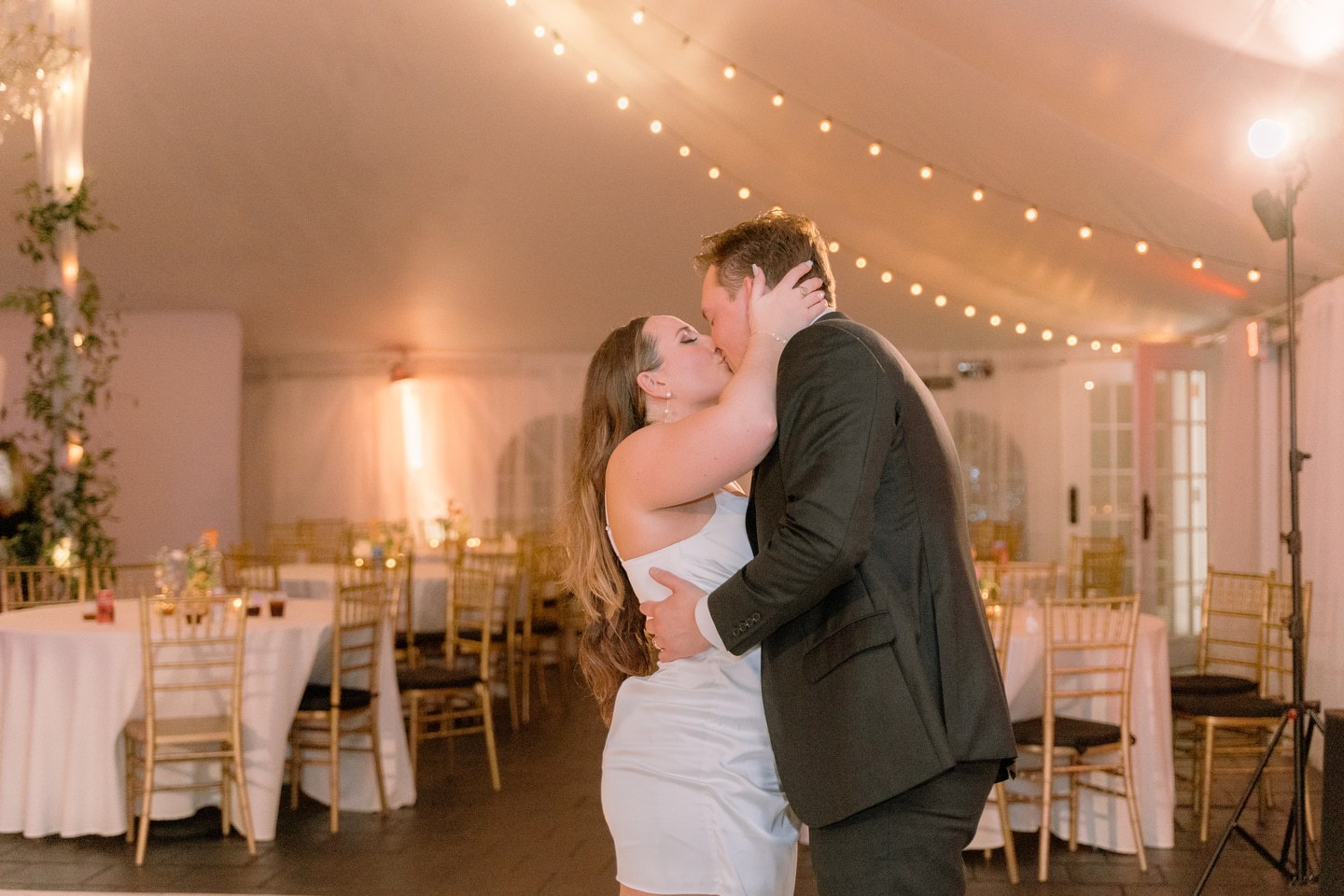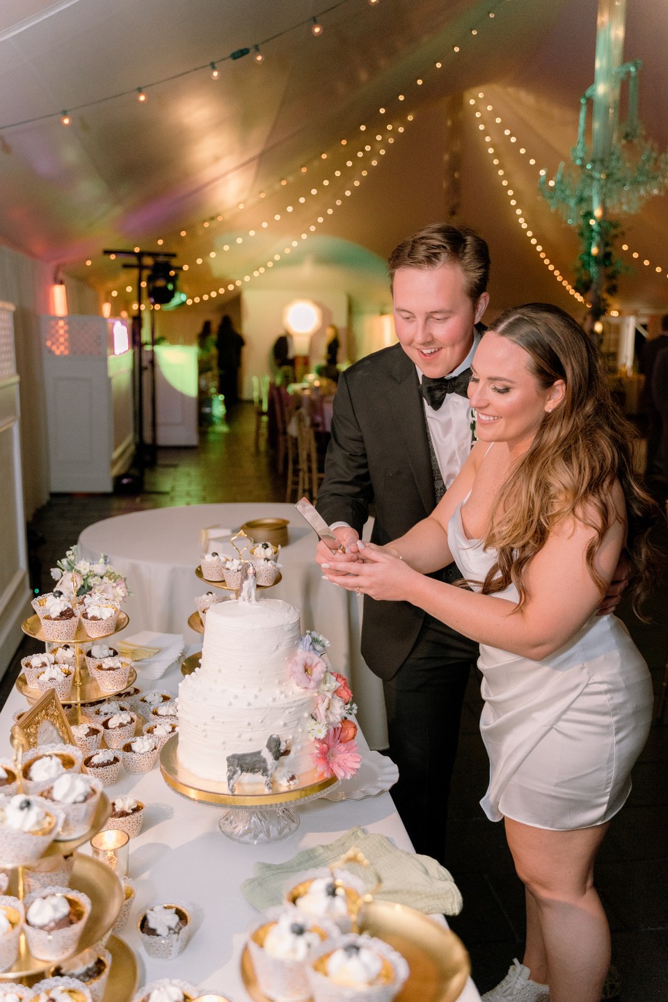 The celebration continued beneath a white tent adorned with crystal chandeliers and gold Chiavari chairs, creating a sense of refined charm. Tables glowed with candlelight, pastel florals softened the space, and the wedding cake—simple, sweet, and accented with fresh blooms—became an unforgettable personal detail. Amative Creative captured the day with graceful nuance, favoring quiet emotional moments and painterly compositions that echoed the estate’s timeless charm.