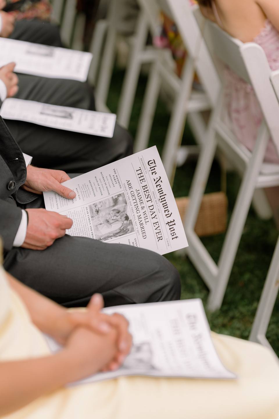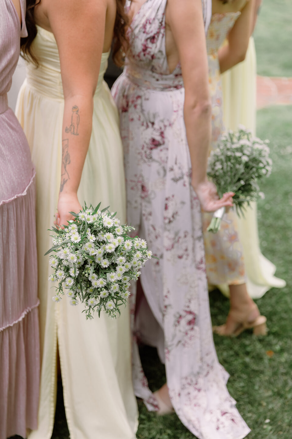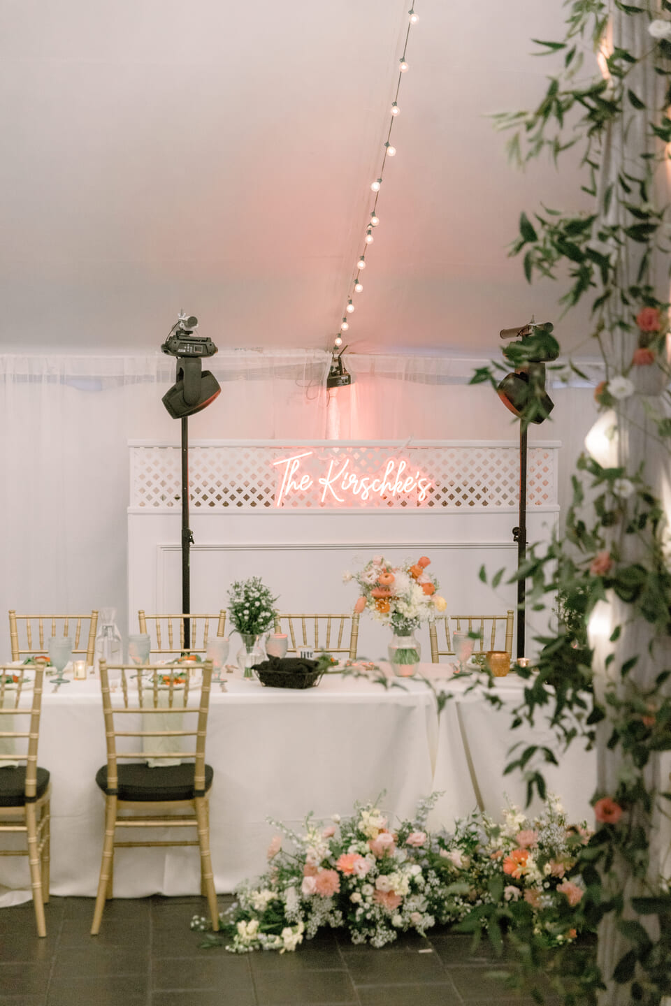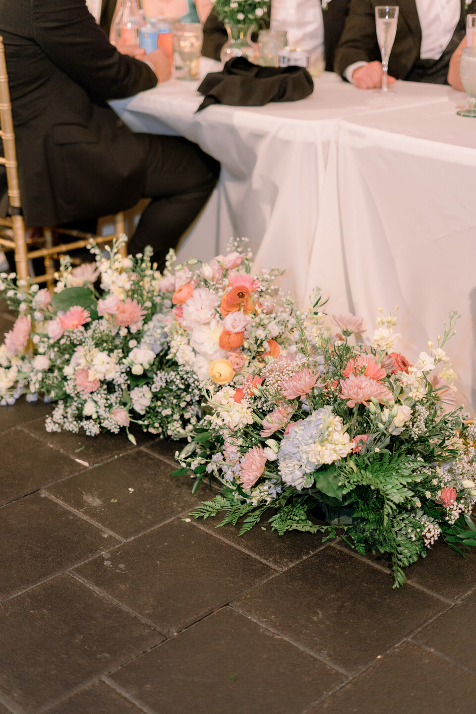 Their ceremony took place outdoors, with soft florals lining the aisle and string lights suspended overhead like early evening stars. Vogue Flowers brought the couple’s vision to life through airy arrangements of ranunculus, hydrangeas, and daisies in shades of pink, coral, and white—later spilling across reception tables with effortless beauty.