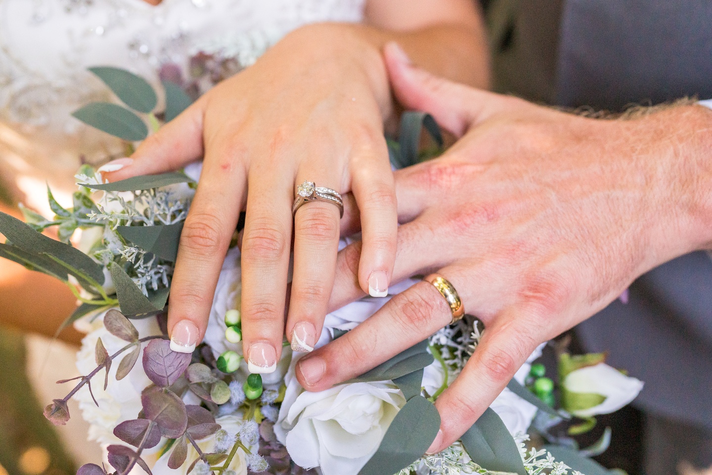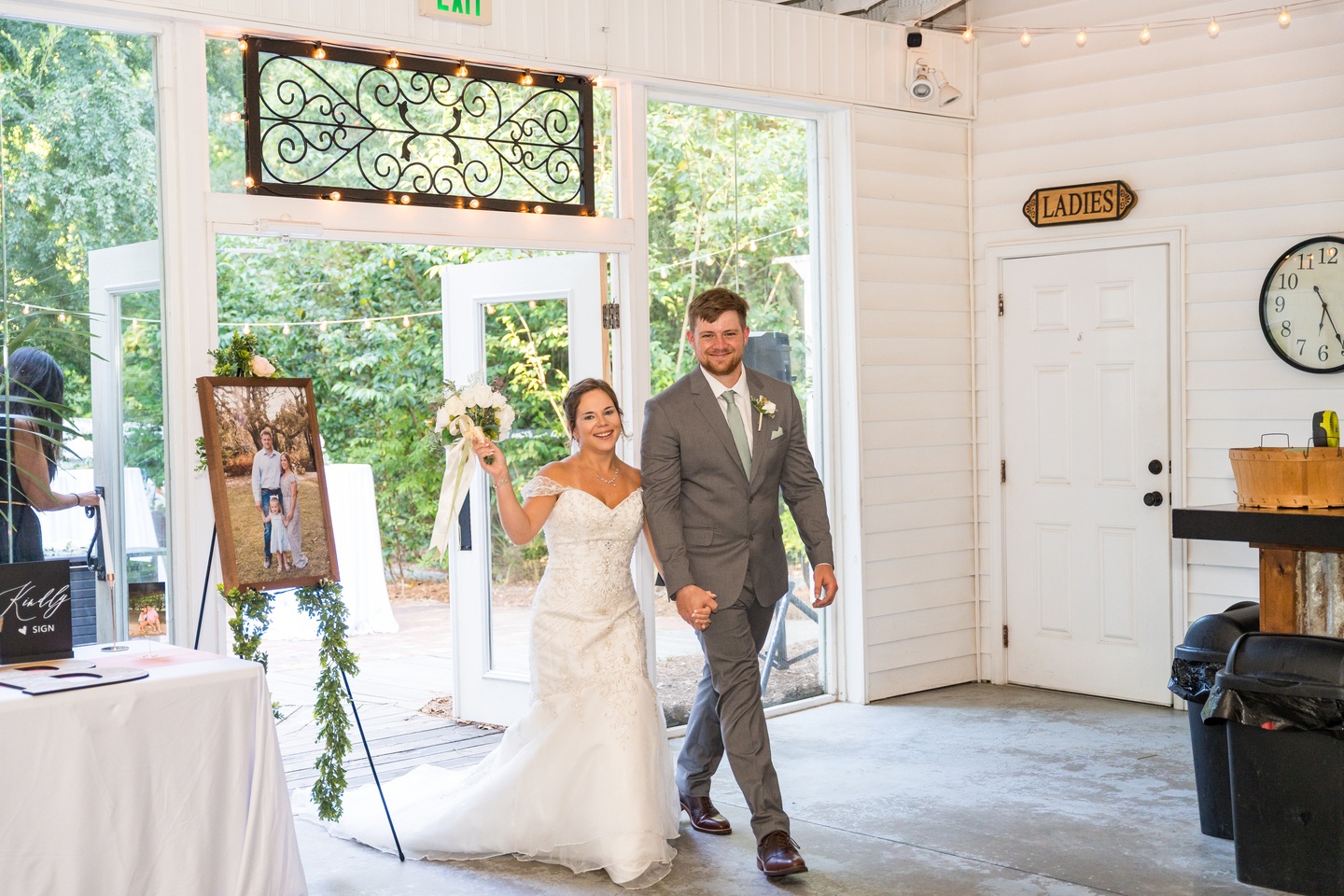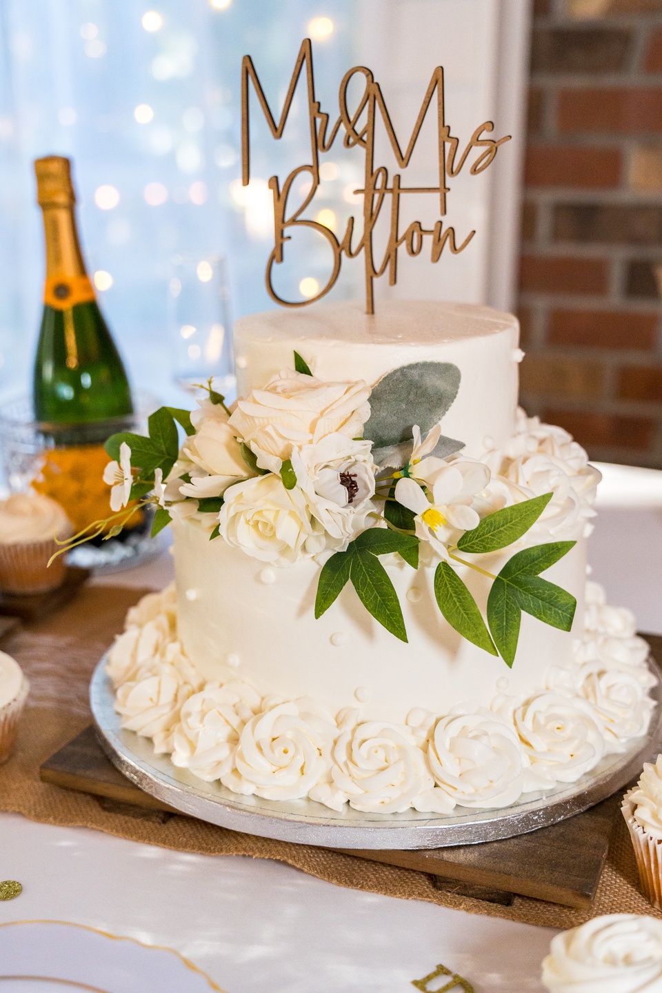 Inside, string lights glowed against exposed brick walls, casting a cozy ambiance over the reception. Every detail reflected intention and charm. Tables were set with scalloped gold-rimmed china layered over sage chargers, ornate flatware, and blush napkins. Wooden box centerpieces topped with mason jar blooms of pale pink roses brought rustic softness to the pristine linens. Music Man’s BBQ provided a feast of Southern flavors, complementing the celebration with warmth and tradition. A two-tier cake, adorned with buttercream rosettes and ivory flowers became the crowning jewel of the evening. As guests dined and delighted in the details, Complete Weddings & Events set the soundtrack, filling the dance floor with energy and joy until the night’s final moments.