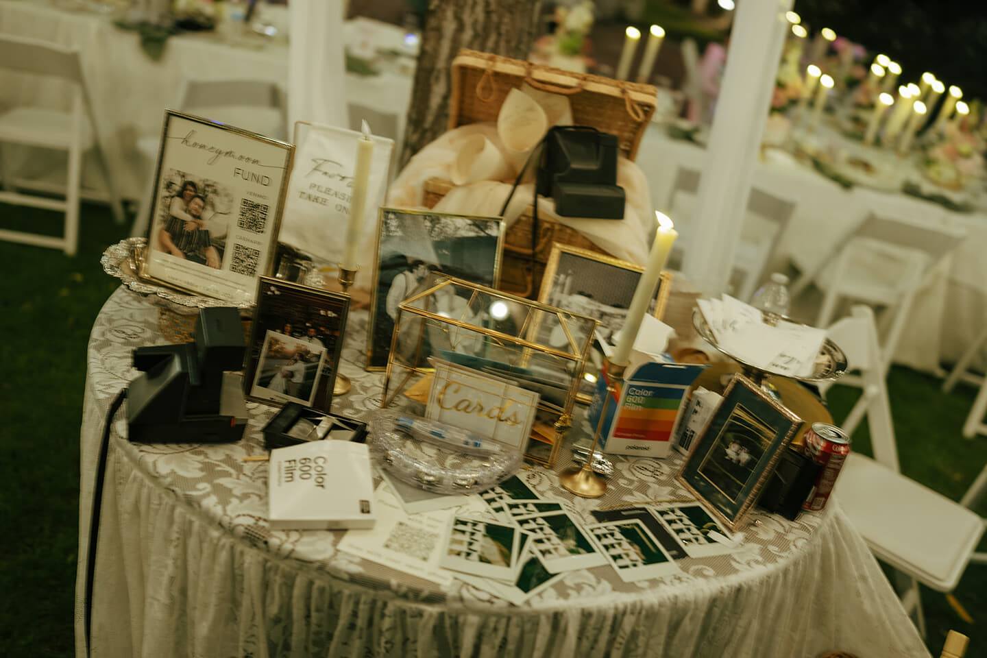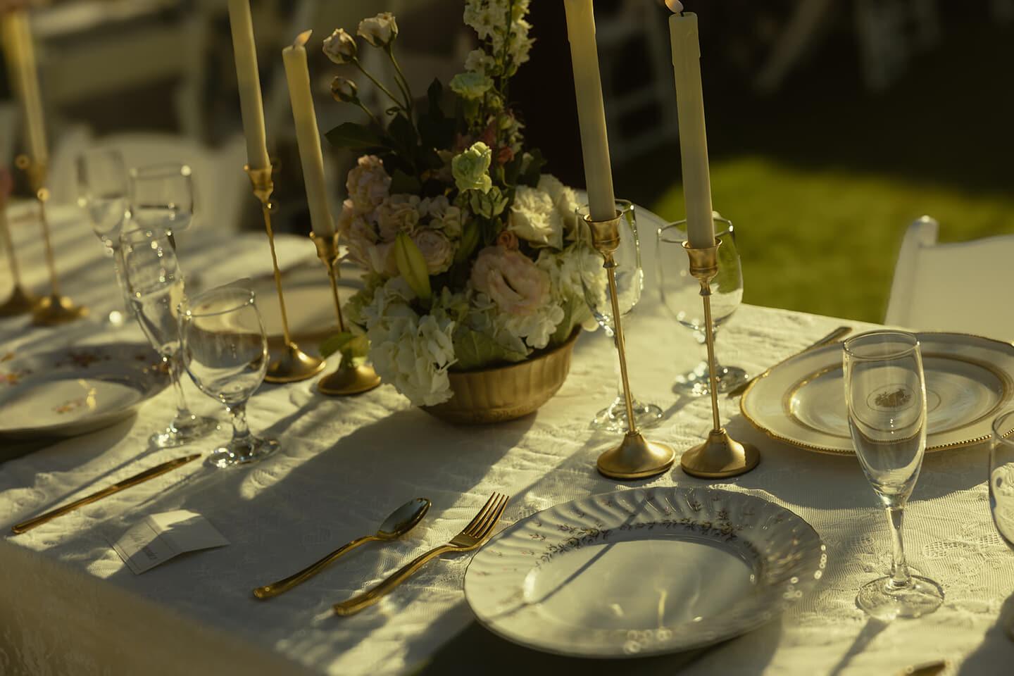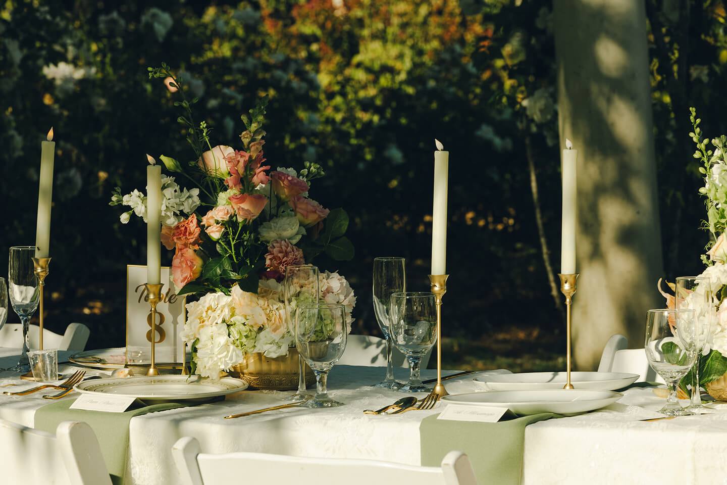 The reception embraced understated elegance with crisp white linens, sage accents, glowing candlelight, and string lights overhead as dusk settled in. Thoughtful details and relaxed beauty defined the evening, creating a celebration that felt both refined and personal.