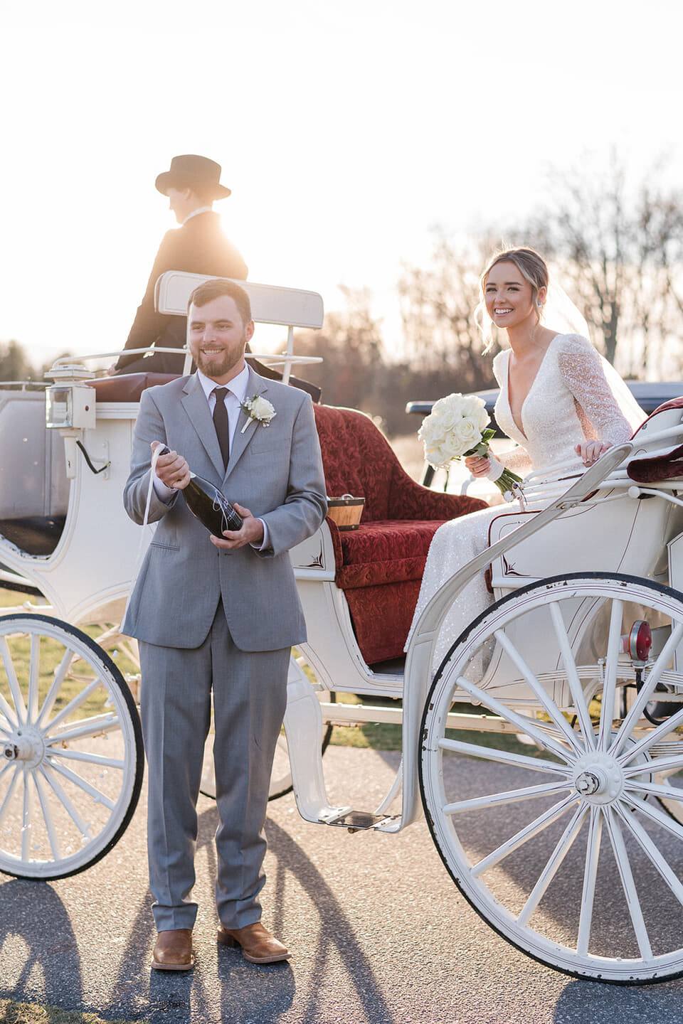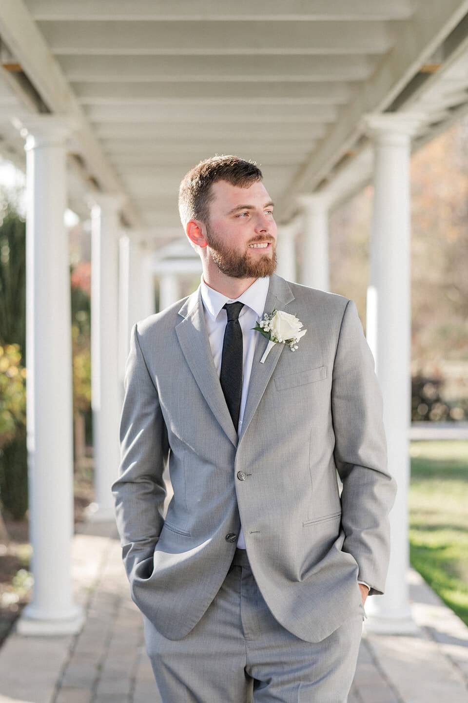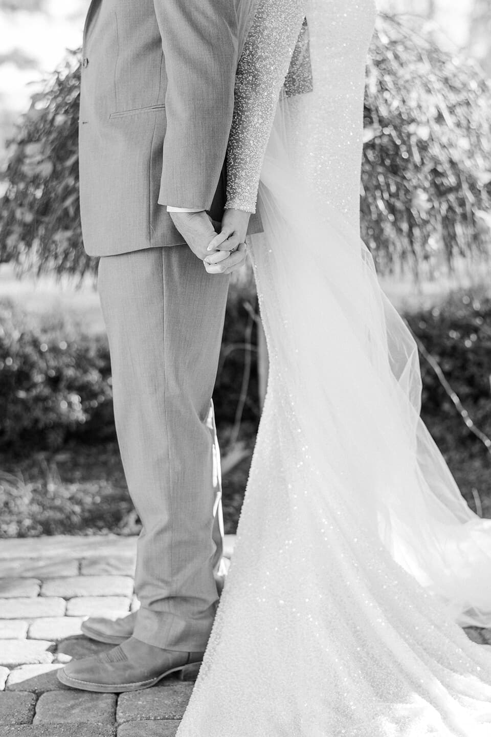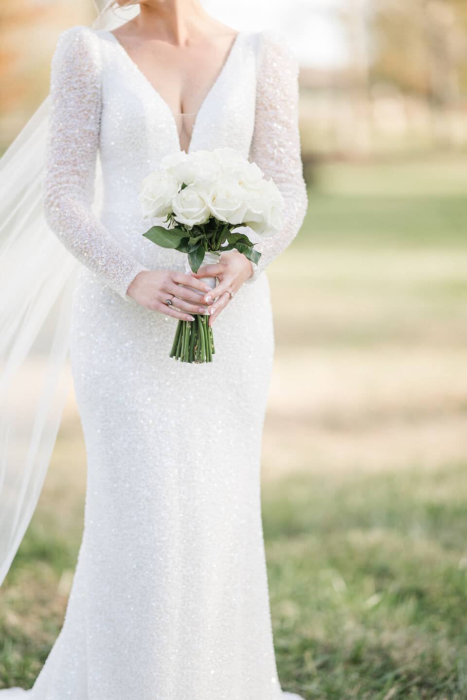 Kelsey shone in a long-sleeved sequined gown that caught the light with every step, paired with a flowing veil and a bouquet of classic white roses. Josh complemented her effortlessly in a soft gray suit finished with a white boutonnière, the pair striking a balance between modern elegance and timeless romance. Hayley Joan completed Kelsey’s look with beauty styling that felt polished yet natural.